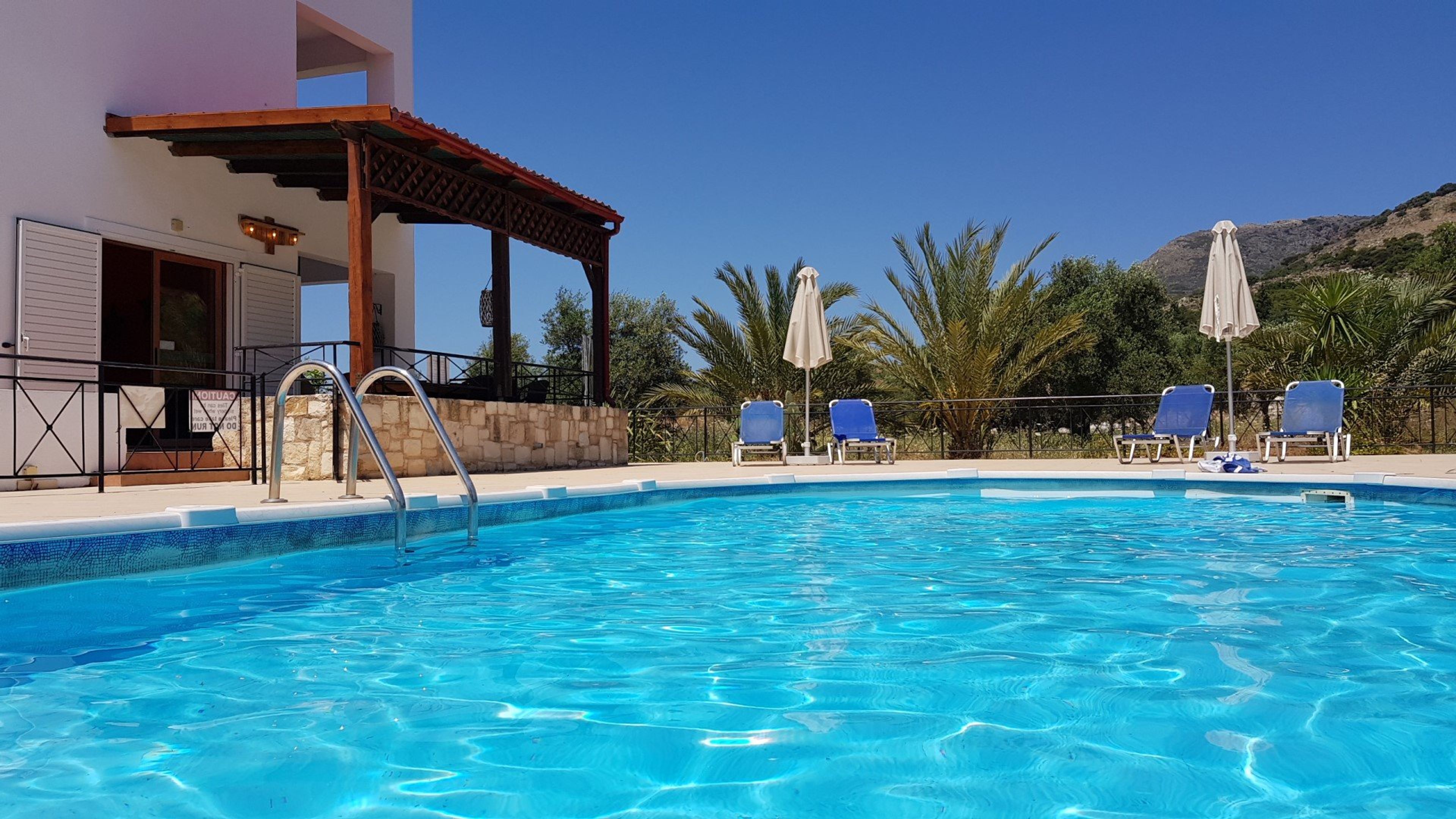 Detached villa with private pool NOT OVERLOOKED and with child safety gates for the pool. Secluded but not remote! Short walk to sandy beach and restaurants. 2 minutes away by car from Almyrida resort
