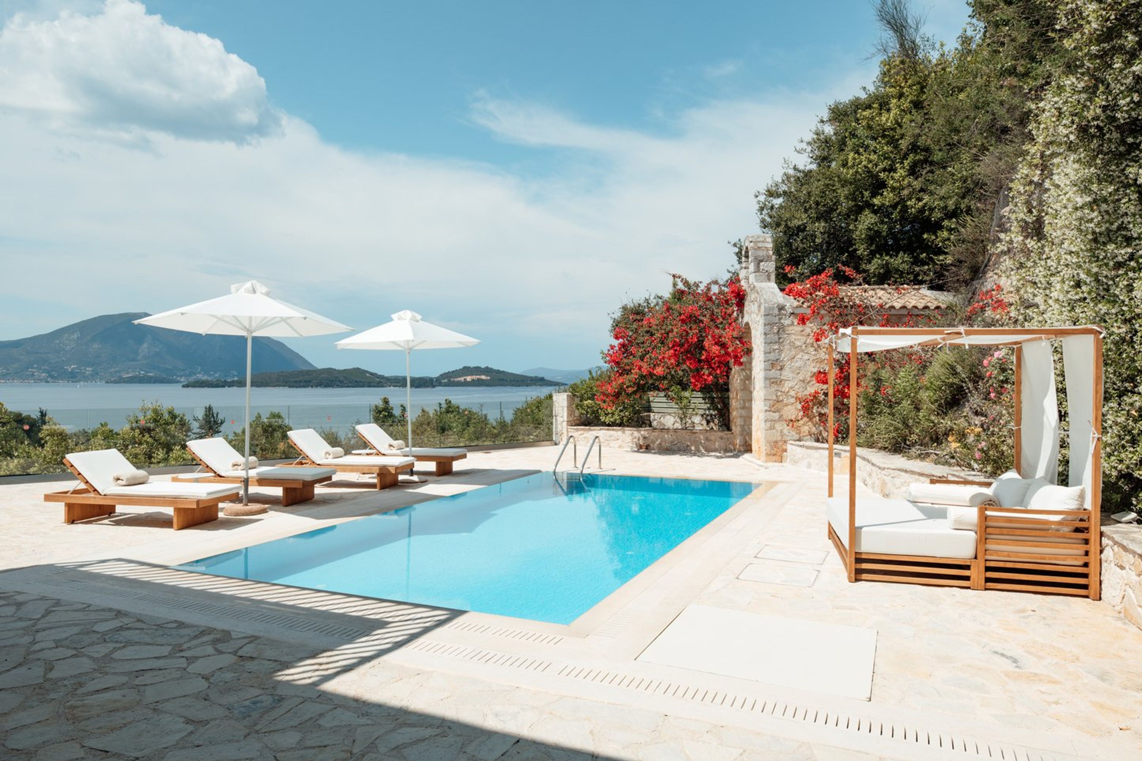 A magnificent stone villa with private pool and sensational seaviews, overlooking legendary Scorpios island, walk to nearest beach, only 3 mins drive to amenities.