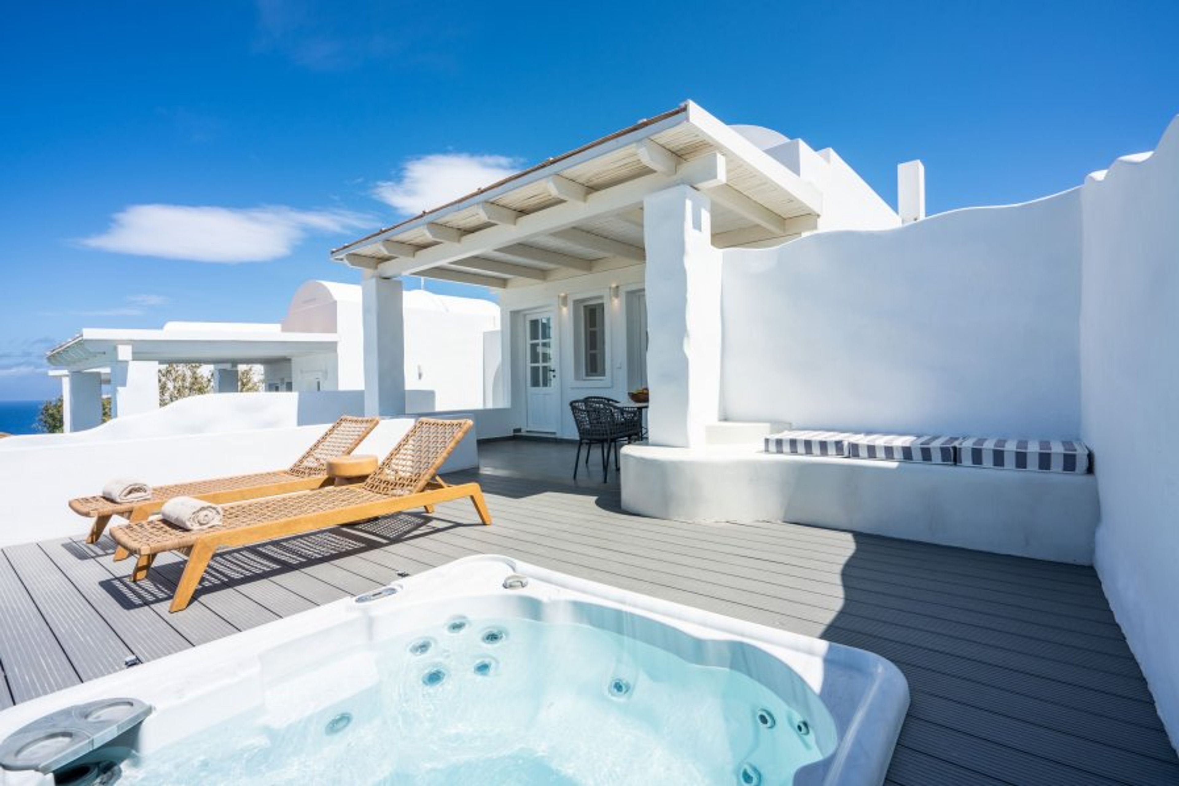On the outside, the villa features a private yard and a garden, overlooking the Aegean Sea and the most famous sunset, with a dining area for 6 persons, to enjoy alfresco dining. Furthermore, there is a private outdoor heated hydro massage spa (for 6 persons) and a communal swimming pool, which combined with the perfect sea view, will keep you there the whole day. Luxury combined with the ultimate privacy offers an unforgettable stay and a unique experience!