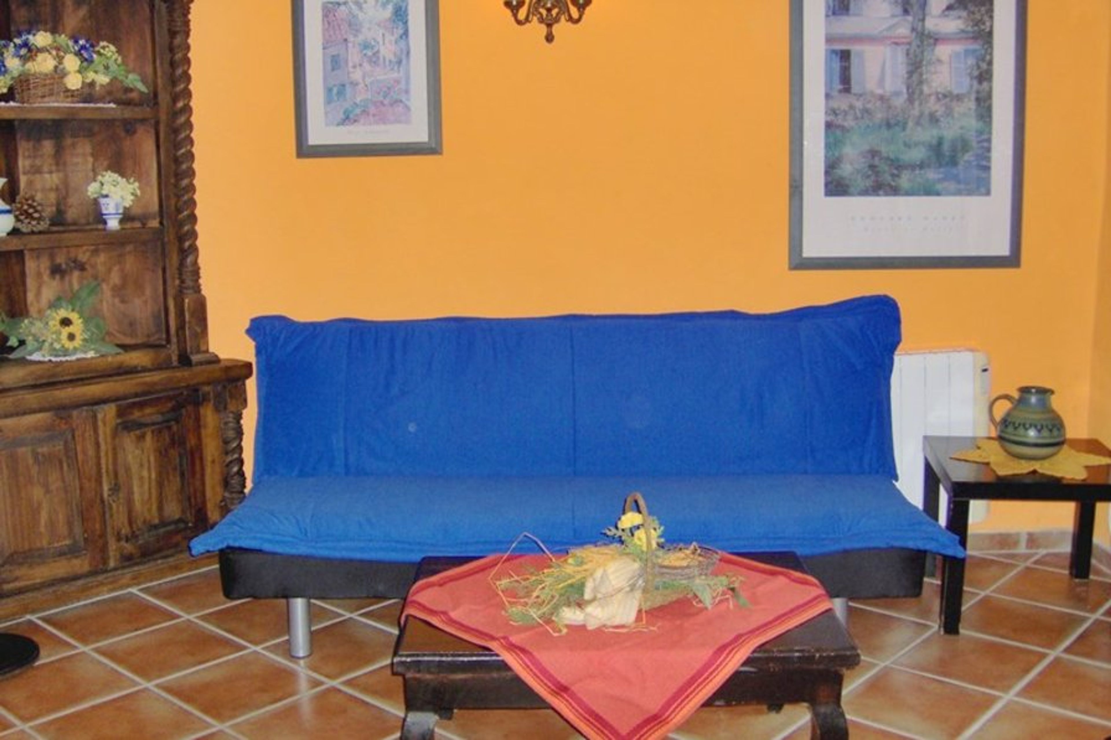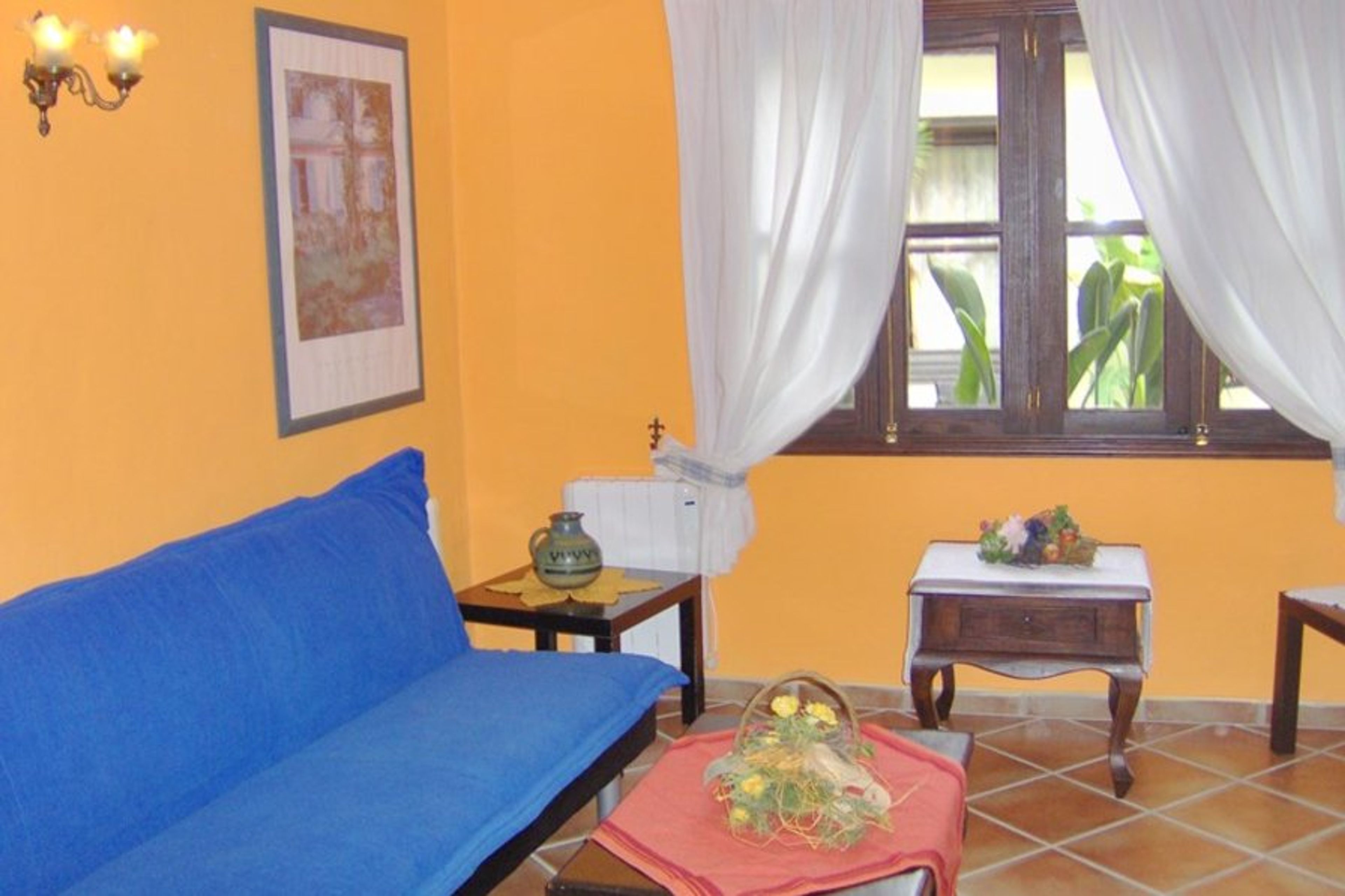 Ground floor, Mediterranean style, apartment facing patio, living room, bedroom with full-sized bed, kitchen, bathroom with shower. Small private terrace inside the patio.