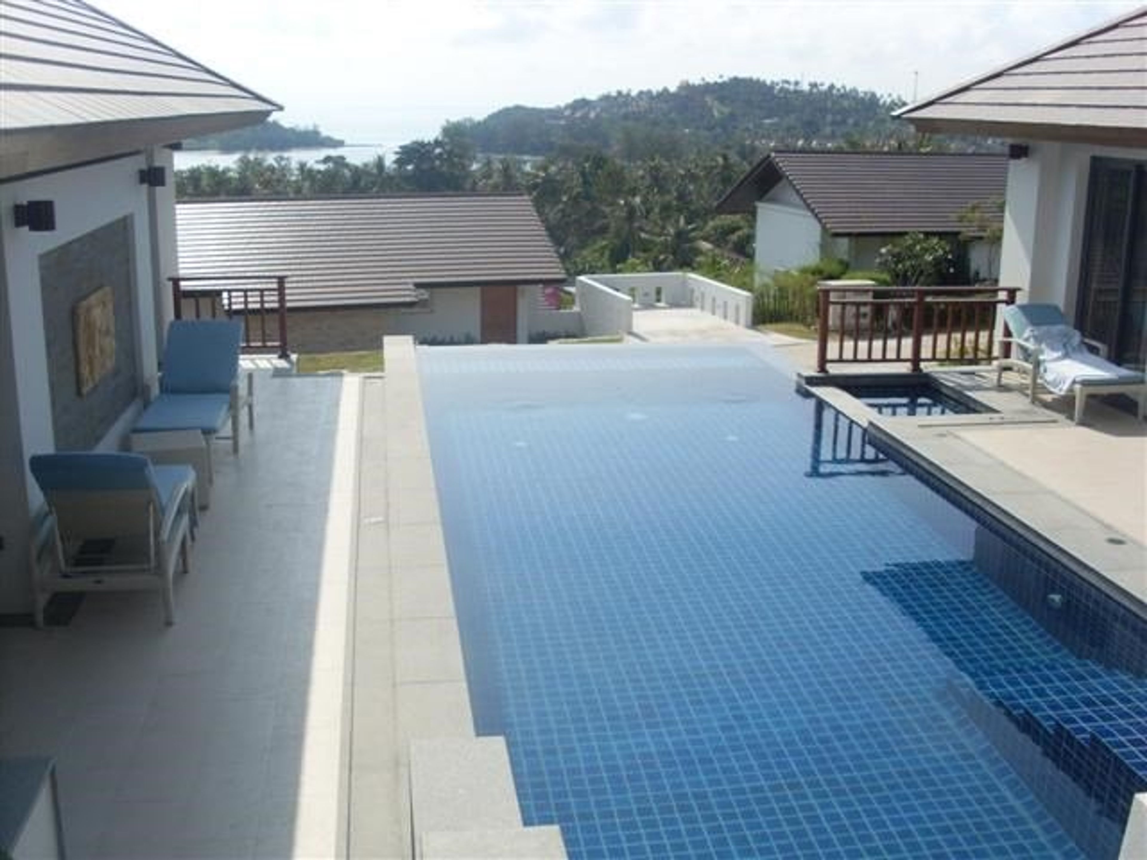 European built to high standard contemporary designed with quality interiors by Isa Designs.Master bedroom with 6 ft four poster bed, luxury bathroom wet room & panoramic views.2 deluxe double bedrooms with bathrooms all air conditioned. Infinity swimming pool accessed directly from your bedroom. Cool off, sit in the pool & enjoy the view. The patio terraces provide comfortable sun loungers to enjoy the sun or relax in the shade under the ceiling fans on the terrace. Dine overlooking Choeng Mon Bay or soak in the Jacuzzi.