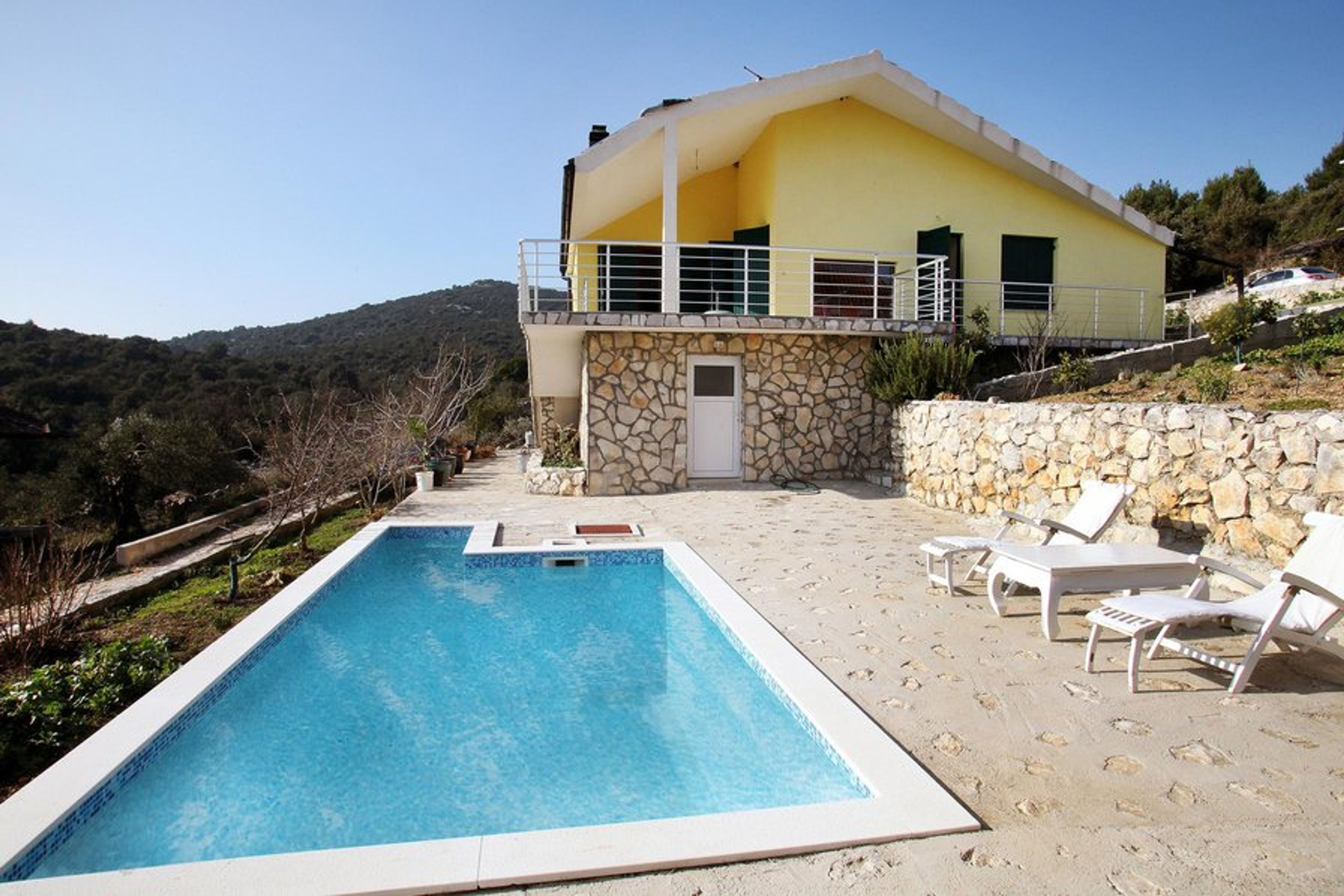 The villa is located in the seaside village of Vinisce. It lies just 22 kms from the UNESCO protected town of Trogir. The coastal town of Primosten is 25 kms away. Split airport is also within an easy reach. The villa is ideal for familes with children or small group of friends. If you are looking for a peaceful and quite vacation this is the right place to be. The village harbour featuring crystal clear water is only a five minutes walk from the villa. There is a gravel road leading to the villa. Three parking spots are located to the rear of the property. There is a large terrace overlooking the pool and BBQ area with a spectacular village and sea view. The entrance is accessed from the terrace and leads into a large lounge area with kitchen and indoor seating. The lounge area features a panoramic window with a view of the pool area and village harbour. Additionally, the villa consists of two double bedrooms, one overlooking the pool area. There are two bathrooms, both with shower. The pool area consists of BBQ/summer kitchen with dining tables and chairs as well as sun recliners. The house provides an ideal starting point to explore the entire region of Northern and Central Dalmatia. The national parks of Kornati and Krka are only an hours drive away. The cities of Sibenik and Split are only 45 mins drive from the house.