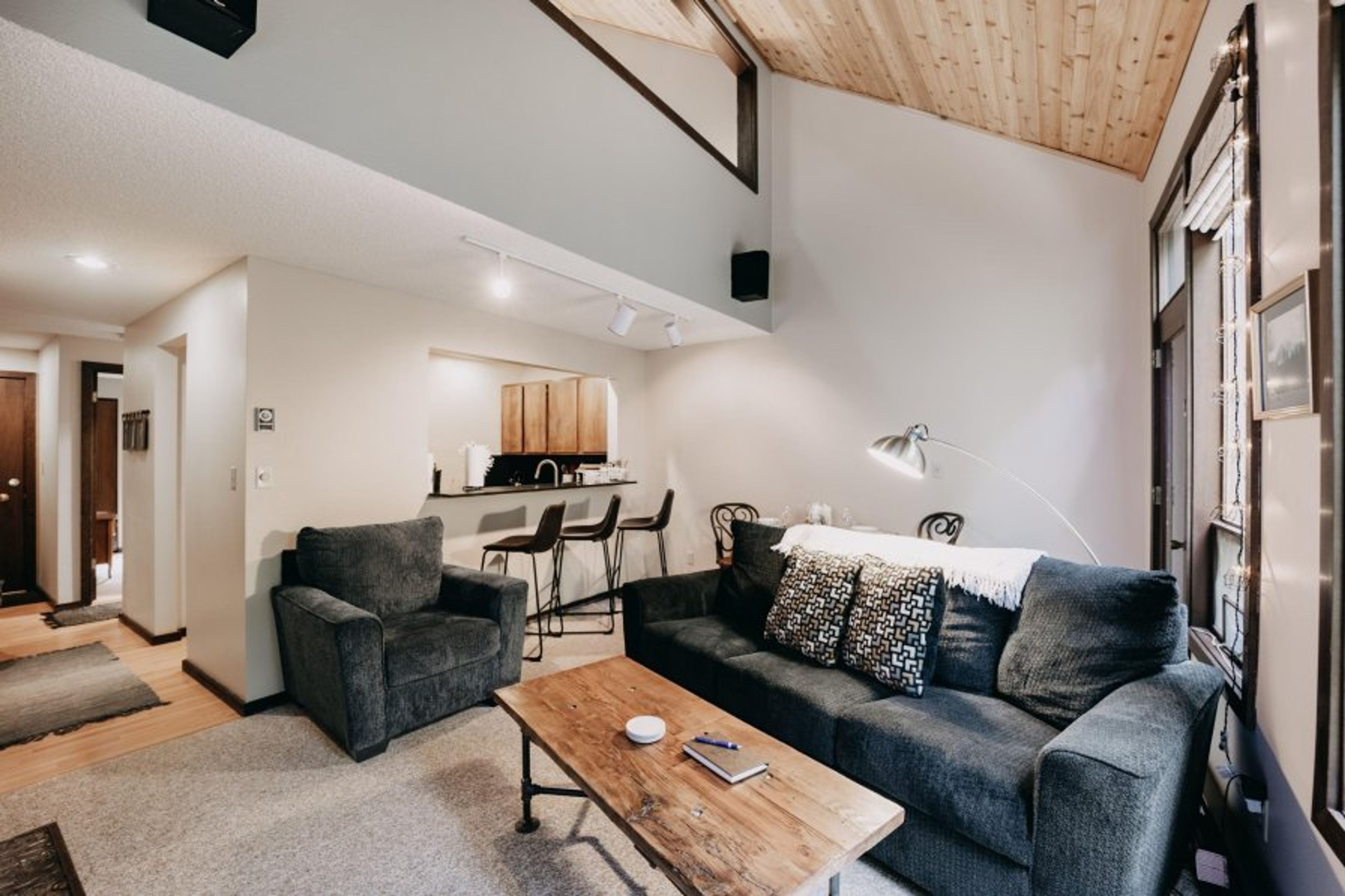 Blissful Relaxation best describes this 2-story, 2-bedroom, 1 ¾-bath townhouse style condominium. Entering the front door reveals an excellent floor plan and a homey atmosphere. The main floor features one bedroom with 1-queen sized bed, a window overlooking the community playground, and two closets offering ample storage. Then, there’s an awesome and completely restyled ¾-bath with a tiled shower, floors, and all-new cabinets and fixtures. Next; you’ll be delighted by the newly remodeled galley-style kitchen with luxury countertops and all-new stainless appliances, including a dishwasher. A breakfast bar with three bar stools also serves as a great pass-through to the living/dining area with a dining table and two chairs, a comfy couch, a flat-screen monitor, and a built-in gas fireplace to cozy up to. Outside is a small balcony, where you can take in the sights and sounds of the magnificent wooded mountain area. Ascending the staircase to the top floor reveals a small sitting area and a laundry cubby with a stack washer and dryer. There’s also a loft bedroom with 1-queen-sized bed and plenty of closet space. Finally, there’s a split full bath with a tub/shower combo. This pet-friendly (2-pet maximum, no exceptions) and monitored family vacation property will comfortably sleep up to 4 persons (ENFORCED Maximum Occupancy!).