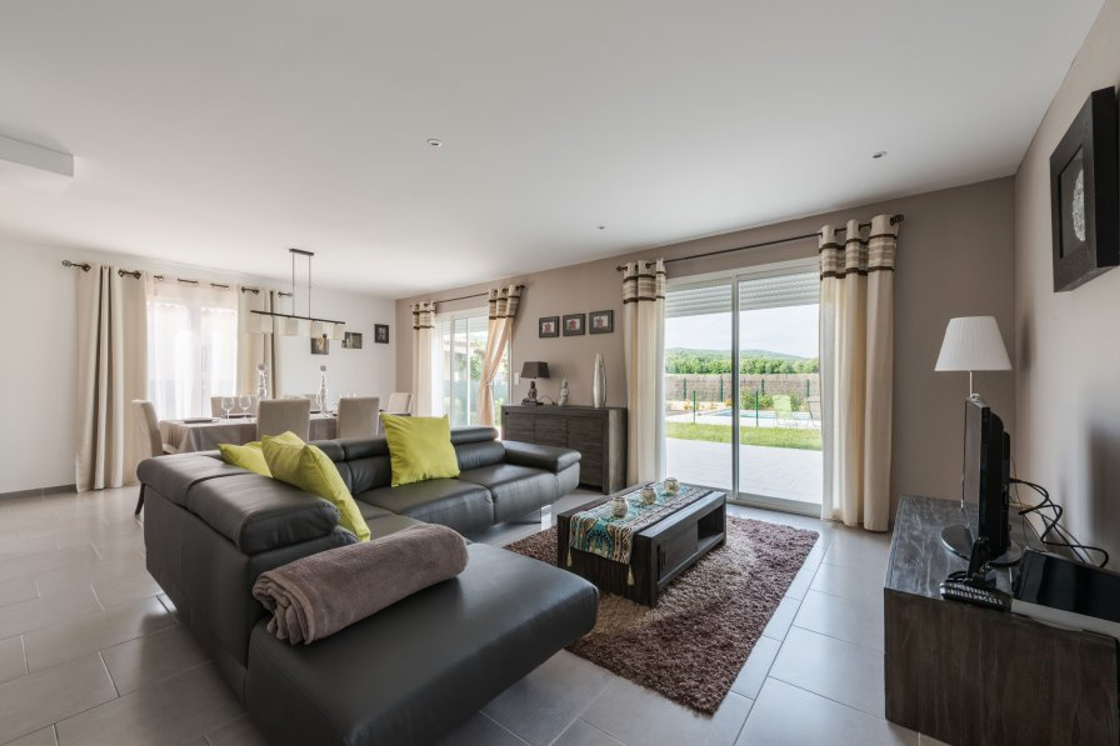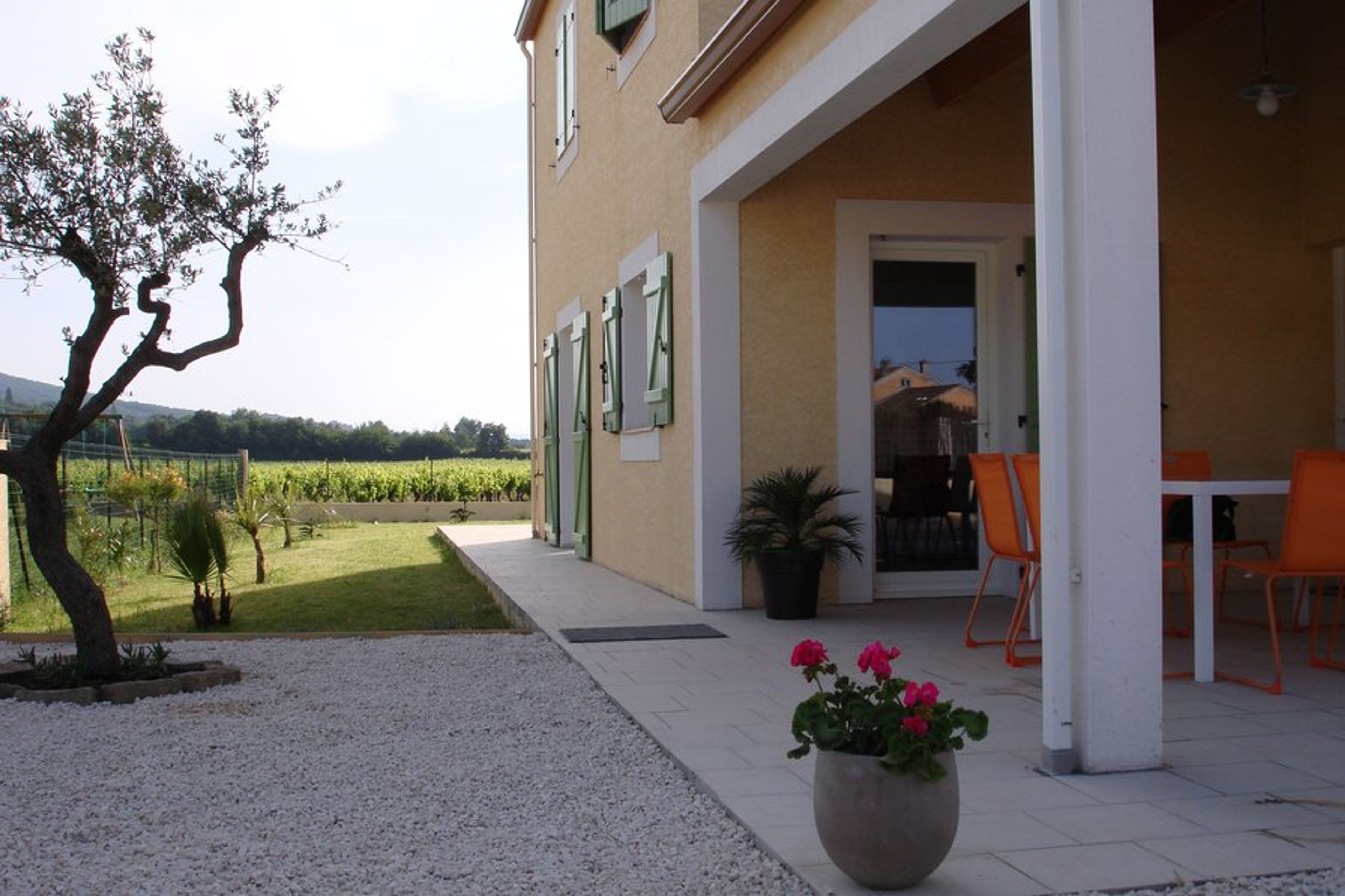 On the ground floor, large modern kitchen fully furnished and equipped, large dining room and living room with bay windows facing south with views over garden, vineyards and garrigue. You will enjoy having your breakfast or dining in the south terrace in front of vineyards facing the Pyrenees mountain.