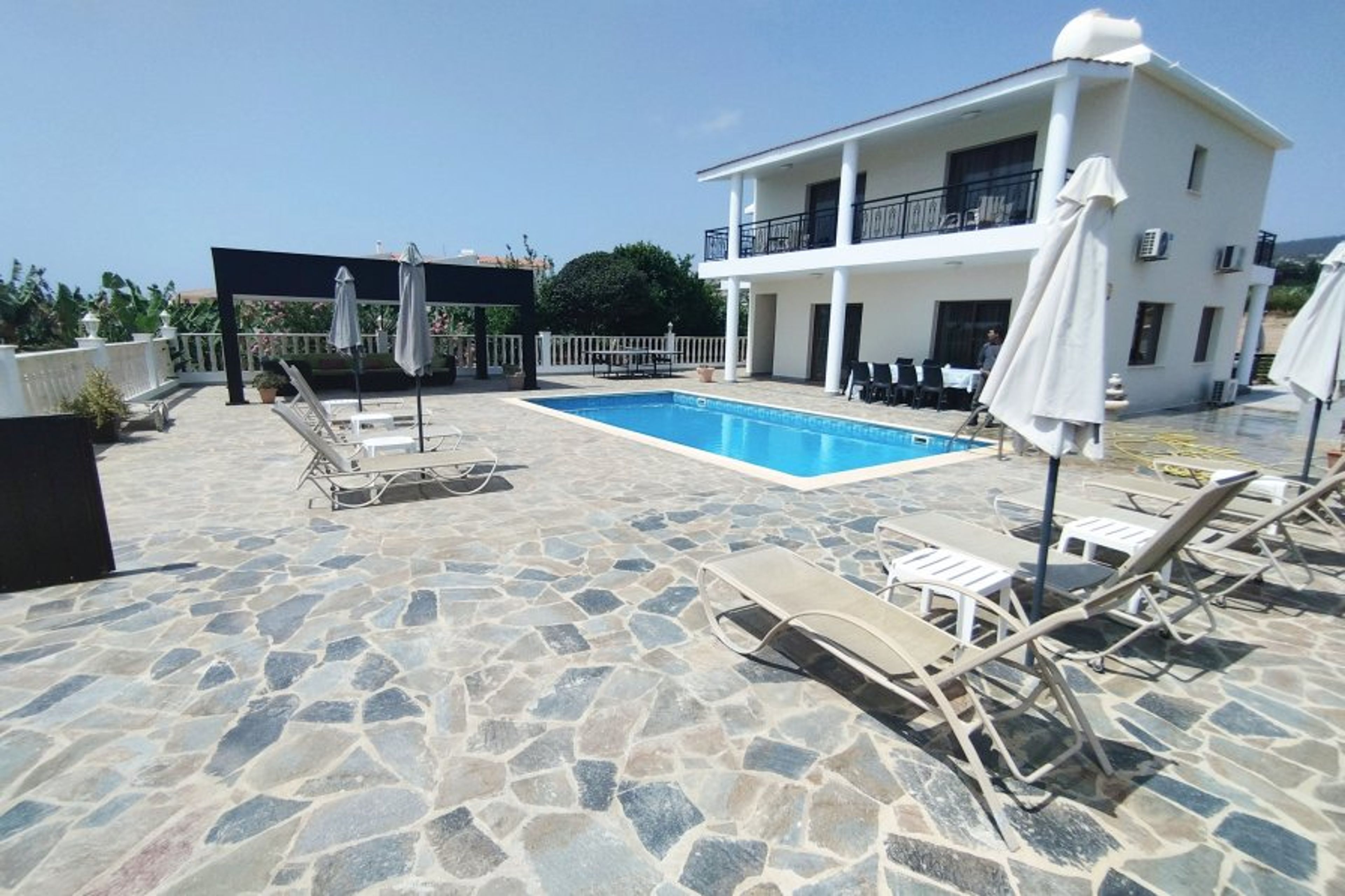Outside the 9 metre x 5 metre private swimming pool is surrounded by a substantial sunbathing terrace equipped with sunbeds, umbrellas and a poolside shower.