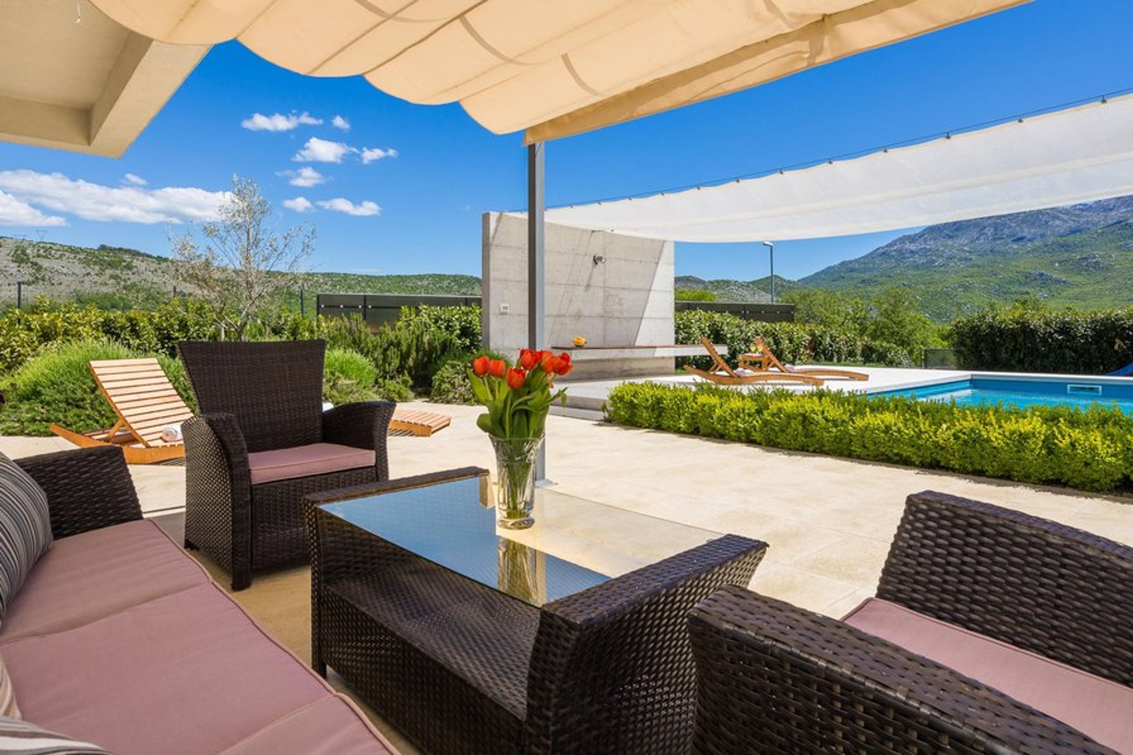 This beautiful villa with a large pool is situated in the hinterland of Split (UNESCO), Dalmatia's metropolis, in a small place called „Dugopolje“. With somewhat over 3400 residents, in this place you can find yourself some piece and relaxation. For people who like an active vacation there are numerous hiking and cycling tracks, as well as climbing the Mosor mountain, visiting the Vranjača cave, the Clissa fortress or ancient Salona's ruins and river-rafting on Cetina. In the business centre of Dugopolje you can find stores like Nike, Adidas or Calzedonia which are even opened on Sundays. Only the Mosor mountain separates us from the Adriatic sea coastline; it takes only 15 minutes of driving to be on one of many beautiful beaches of Split. It is also near cities of Trogir, Omiš and Šibenik; you can visit the Krka national park which is easily accessible by the A1 highway.