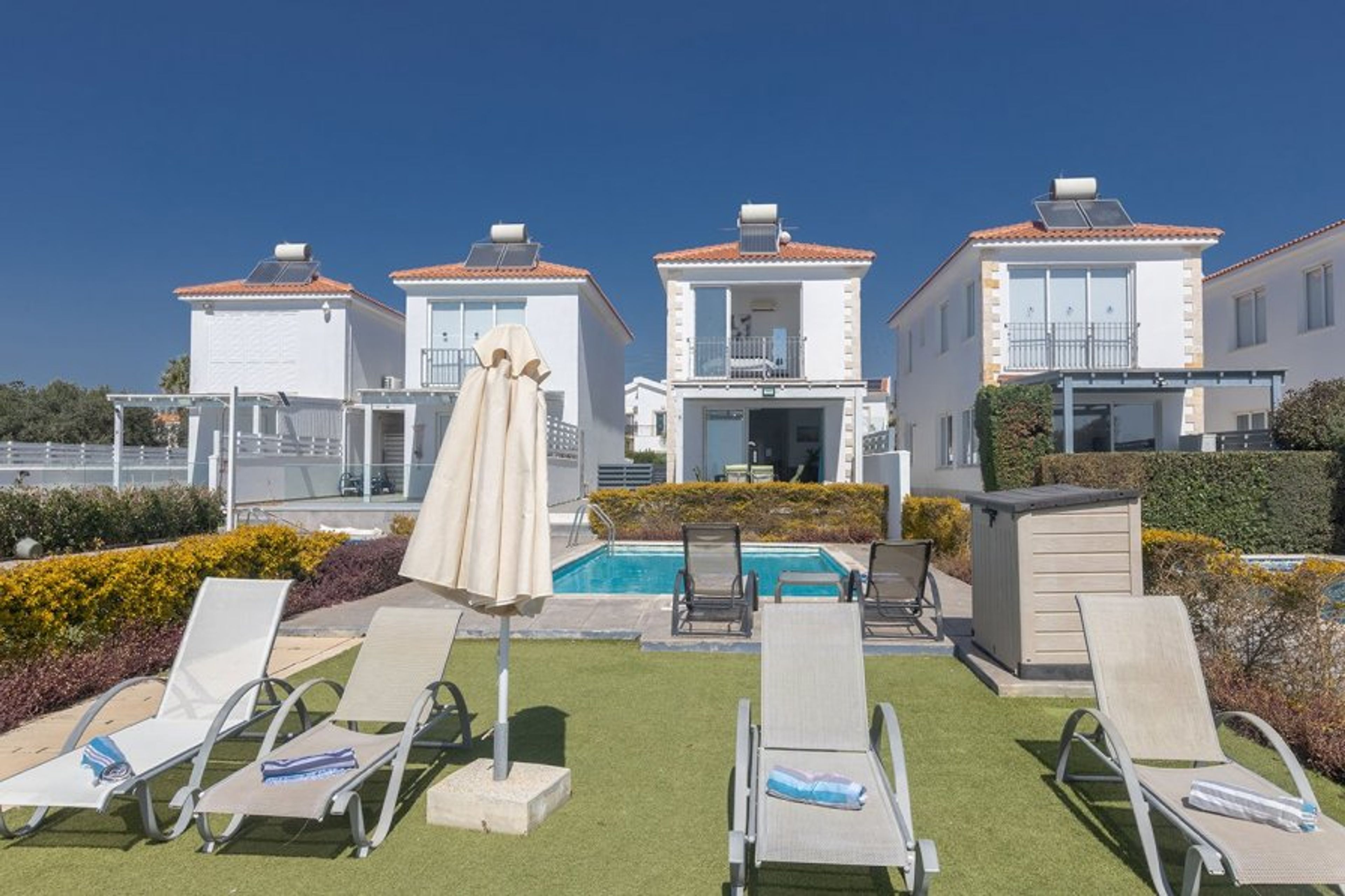 This modern and spacious 3 bedroom villa is located just 20 metres from the sea and enjoys fabulous views of the Ayia Thekla coastline.