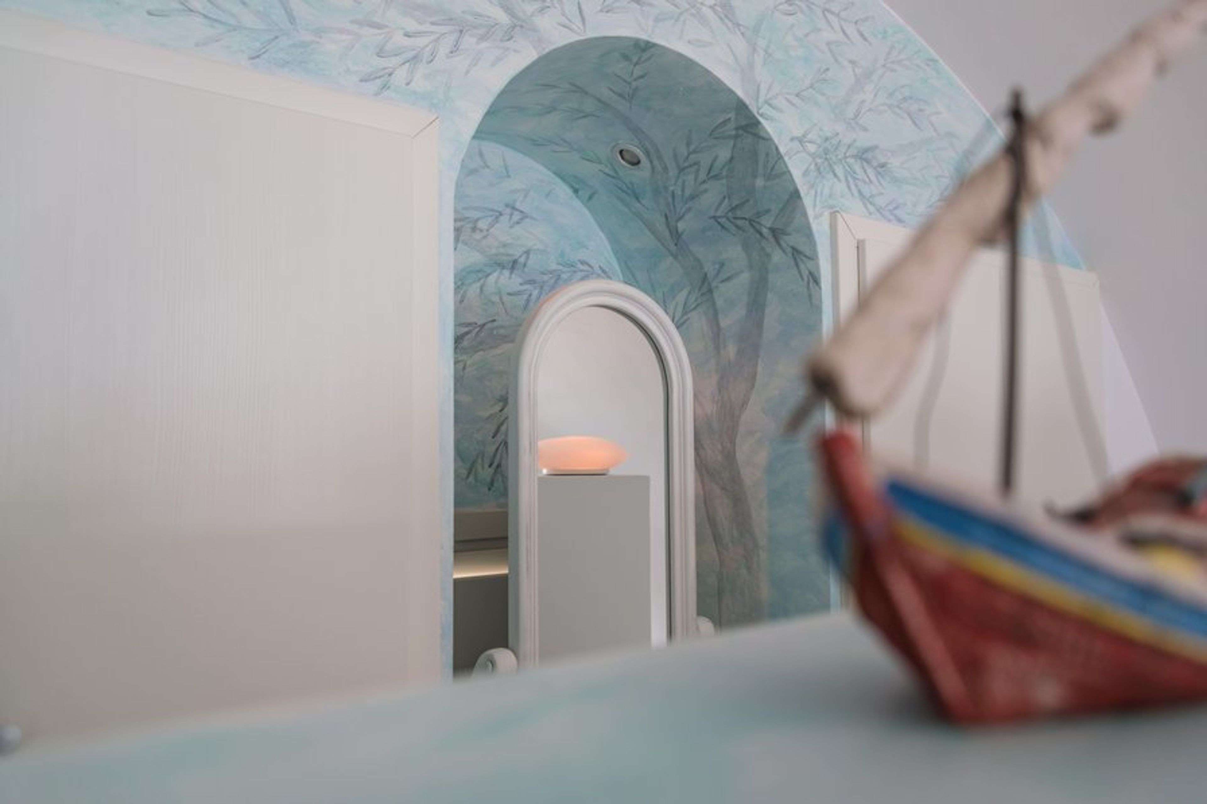 On the upper floor is the Master’s bedroom with wooden floor, vaulted ceiling and a massive king size bed. You could even watch the sea from your bed through the window in front of you. All the above combined with art objects, paintings and an art deco arm chair create an atmospheric theater setting in this bedroom.