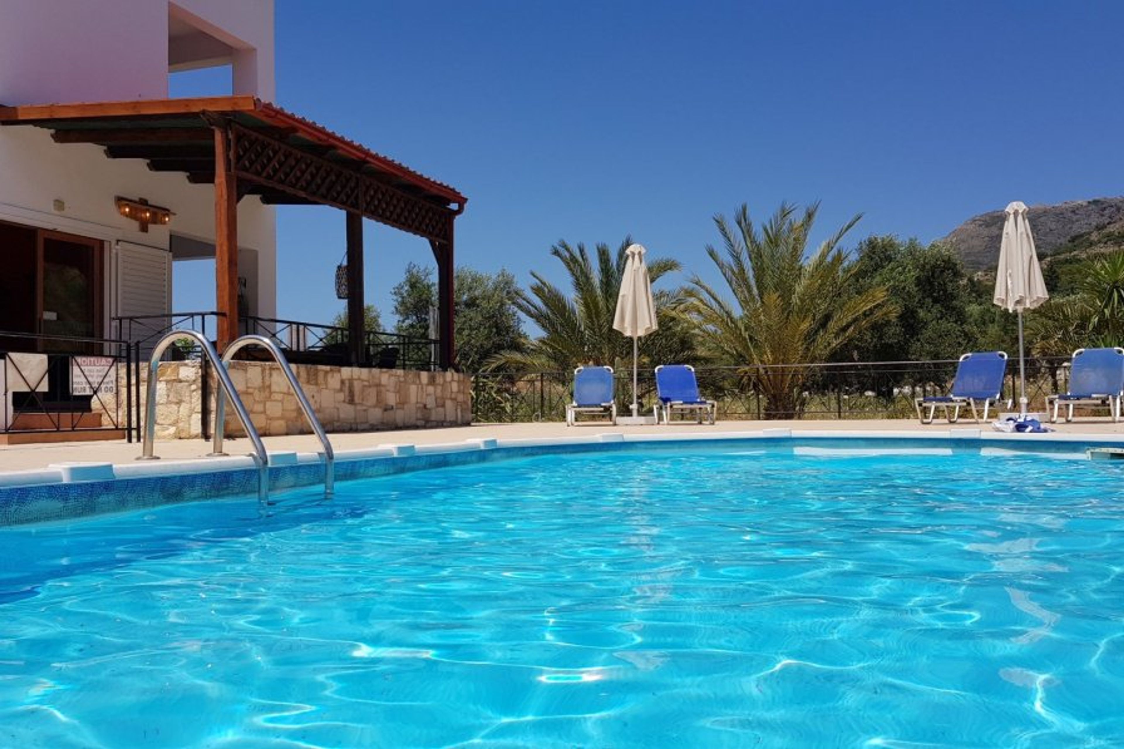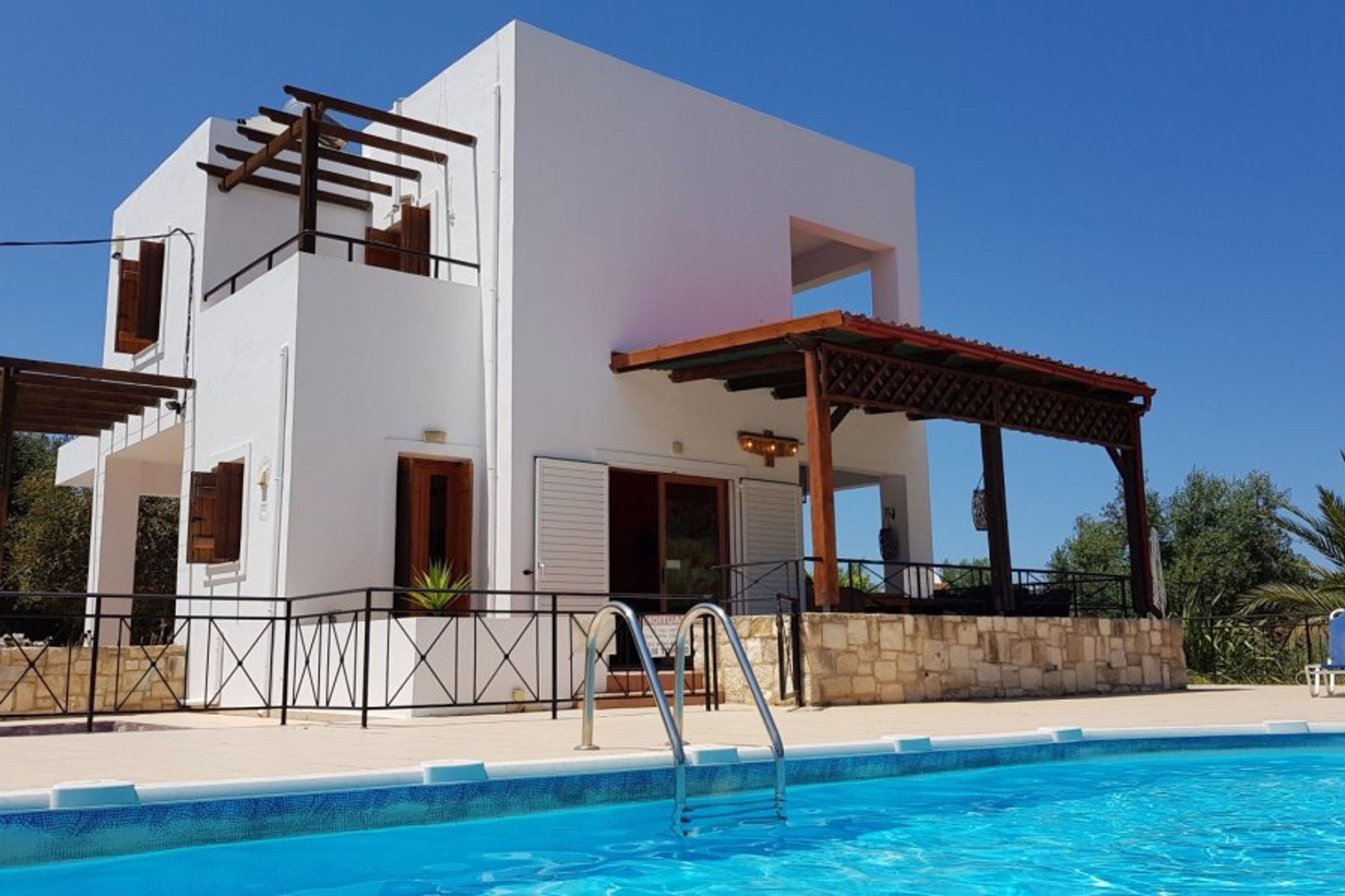 Detached villa with private pool NOT OVERLOOKED and with child safety gates for the pool. Secluded but not remote! Short walk to sandy beach and restaurants. 2 minutes away by car from Almyrida resort
