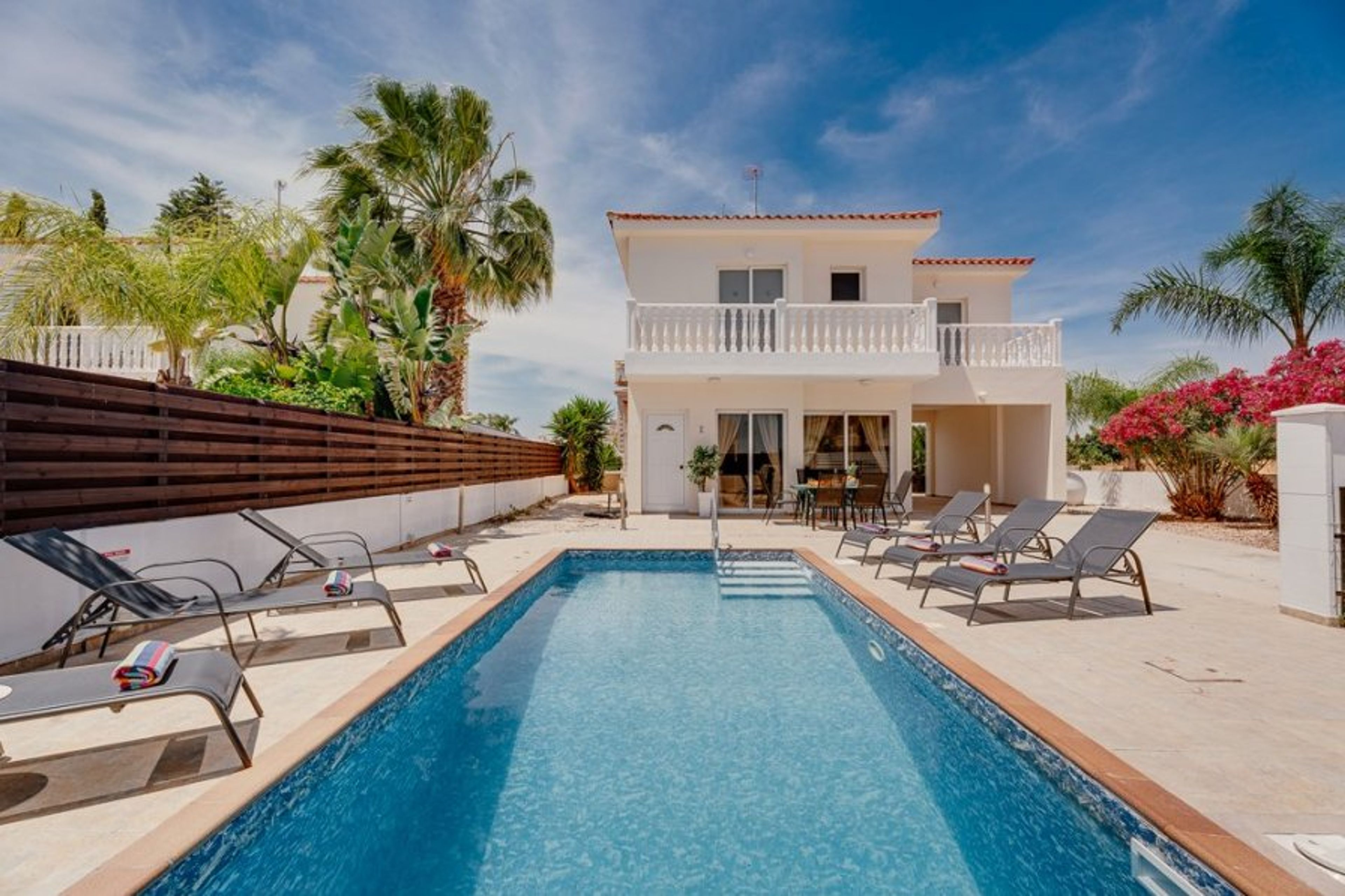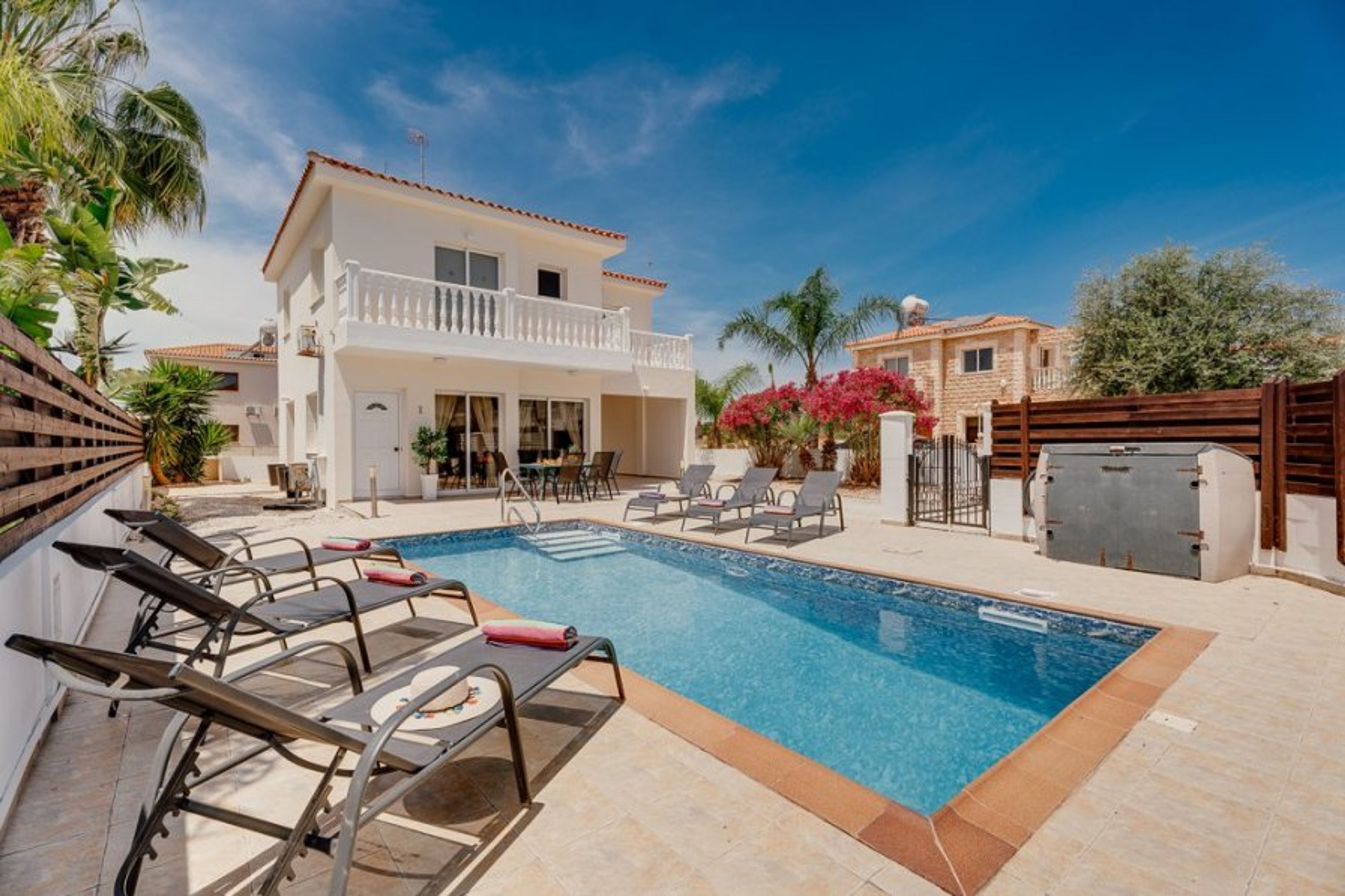 Villa Croeso in Ayia Thekla offers 3 bedrooms, a private pool, and air-conditioning. The villa features modern furnishings, private balconies, and outdoor dining. Enjoy nearby beaches and activities.