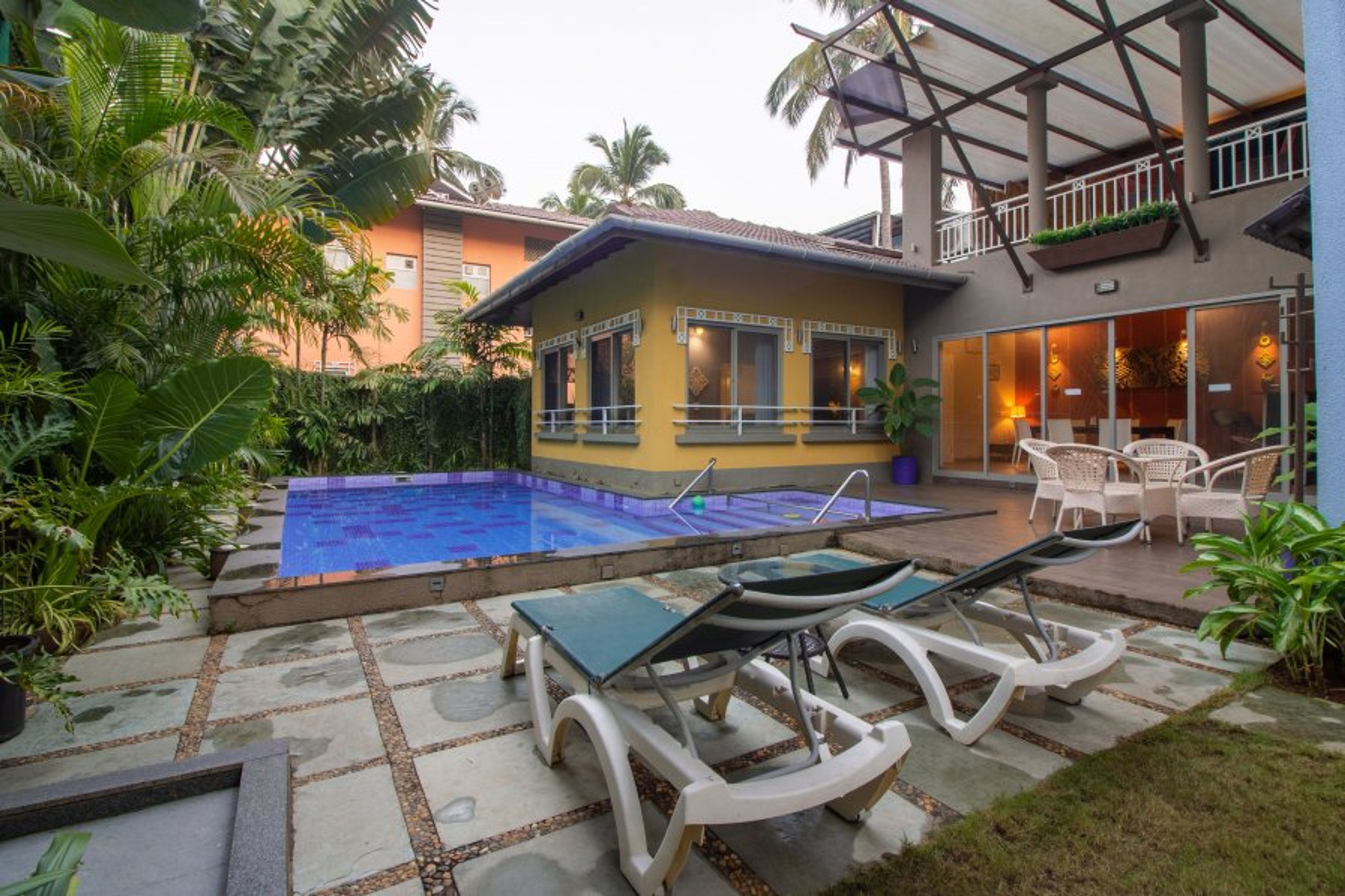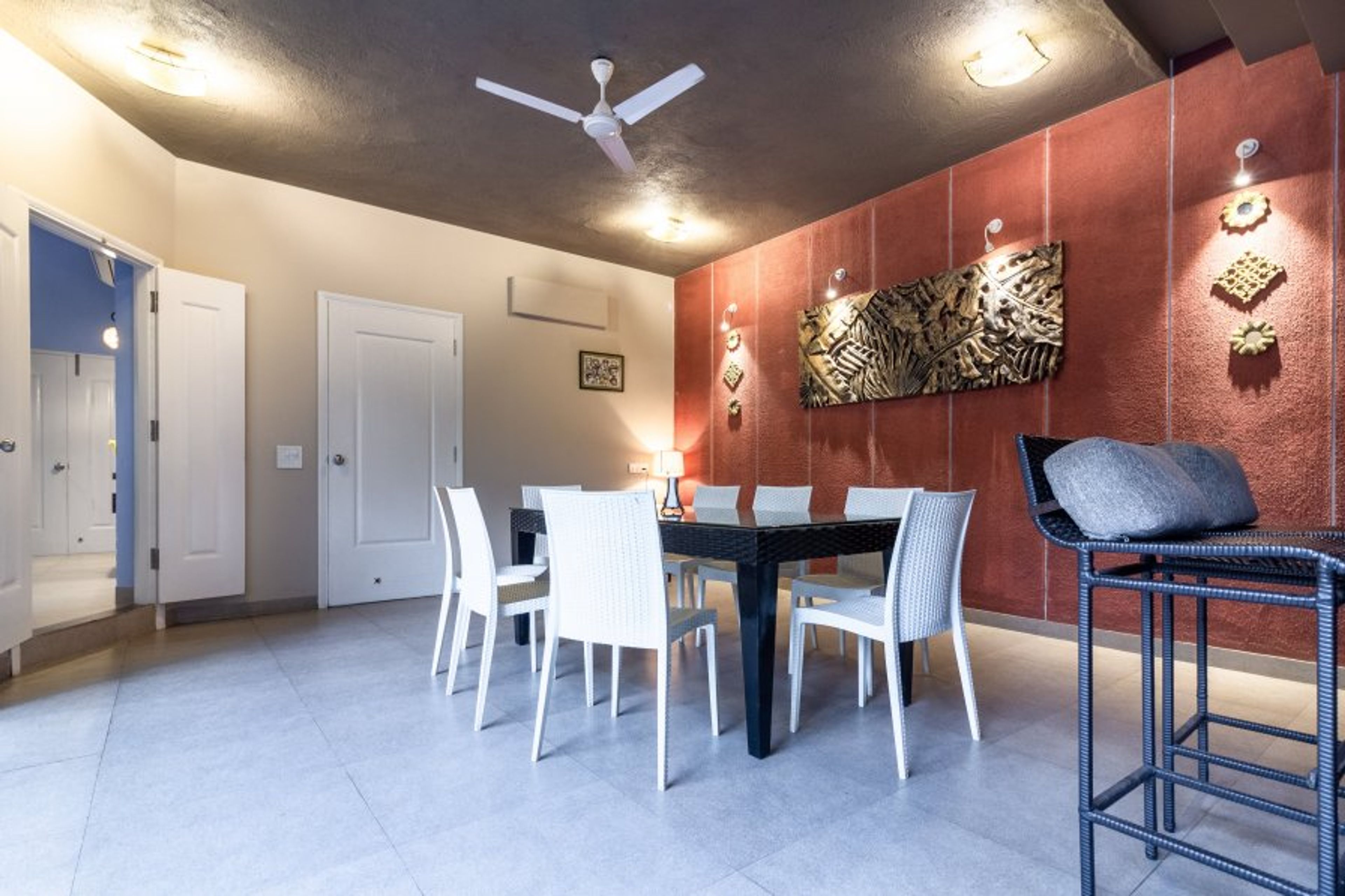 This villa with its private pool promises you all that you are looking for in your vacation home. The living room like the rest of the house is done up in a lot of fun colors to keep you pepped throughout your vacation. After all what’s Goa without some extra fun? The high ceiling with paneling in this room adds to the uniqueness of this beautiful villa in Calangute. This opens to a large sun deck which overlooks your private pool. You may sit out and enjoy the pleasant Goan weather. Adjacent to the living room is an eight seater dining table overlooking the garden which will have you making long post meals conversations. There is a well equipped kitchen on the same level with all modern appliances like fridge, microwave, hob, chimney and all necessary cookware. Should you need the services of a chef, the same can be arranged at additional cost.