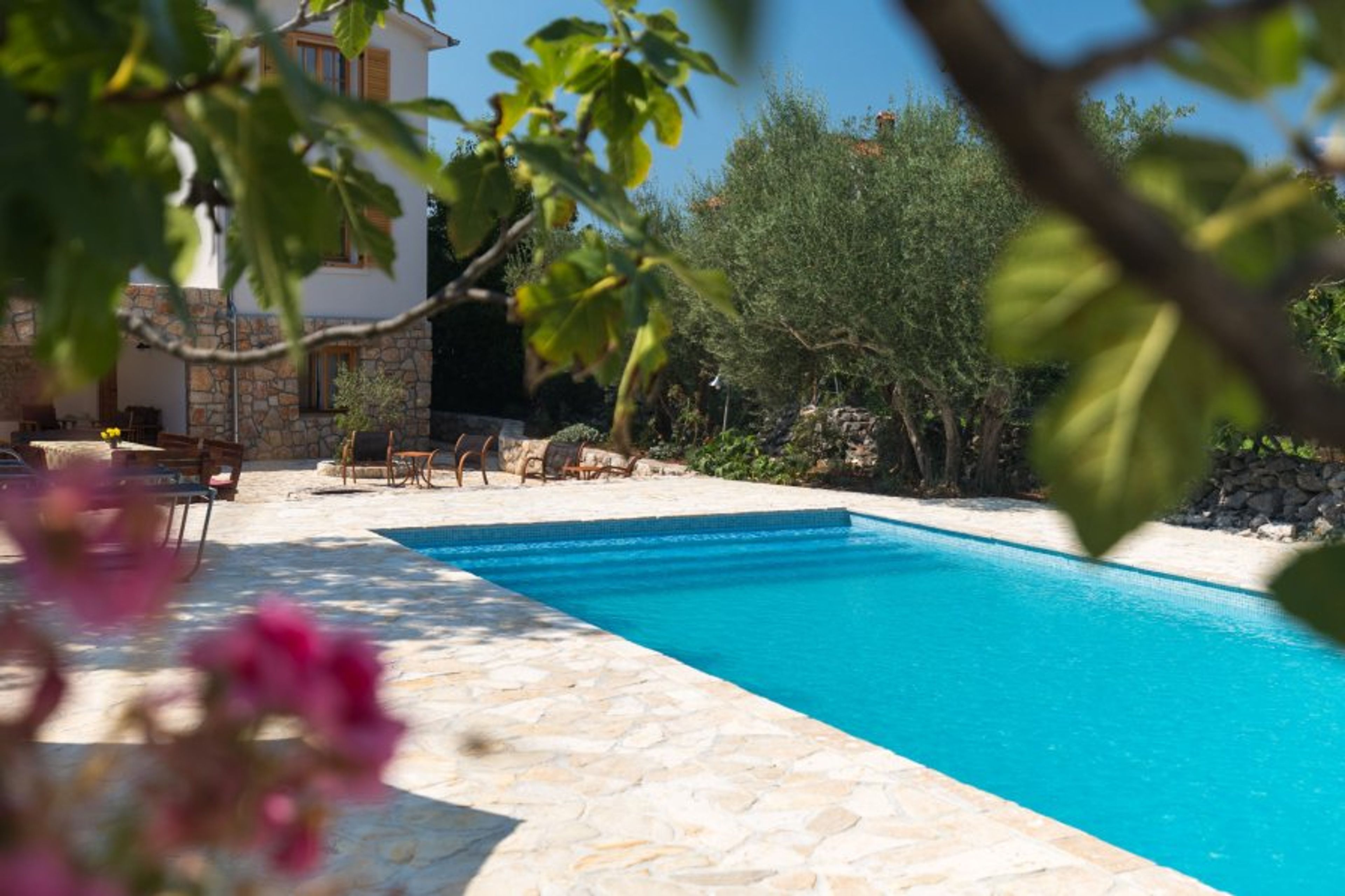 Villa Nadia is two newly restored luxury stone villas with swimming pool. It is perfect for small groups or a few families. They are located in a very private and quiet village atmosphere but only a short drive to local towns, beaches, restaurants, and stores. Villas have altogether 233 m2 of interior living space and are placed on building lot of 1960 m2. Property is fully fenced in all sides and has a large gated parking lot of 430 m2 for cars, boats, trailers, etc. Villas are surrounded by more than 450m2 of uncovered and covered porches equipped with garden furniture. In the backyard is large olive orchard with a fabulous swimming pool and beach around. There is also party room” Gumno” for some memorable fun vacation times, fully equipped with kitchenette, ice maker and dishwasher. In front of the Gumno is100 m2 stone porch with outdoor kitchen, table, toilette and camp style grill/fire pit and herb garden. Top of the Gumno has a magical rooftop terrace with stunning views to Kvarner bay and Dobrinj. Living space is organized as three separate living units. Unit #01 is an amazing Stone house. On the ground floor, there are a kitchen, living and dining room, with a full bathroom. The first floor has a master suite with full bathroom and sleeping loft. In front of the stone house is a 100m2 stone porch with stone fireplace/grill outdoor kitchen and large table, half bathroom. This Unit connects to the swimming pool via separate path over the rooftop terrace. The big house has two separate units: Unit #02 is called “Konoba” and is placed on the ground floor. It has a charming living room with two separate beds, a kitchen/dining area, full bathroom and a large bedroom overlooking the swimming pool. This unit has a covered back porch which connects to the swimming pool area. Unit #03 is on the first and second floor of the “Big house”, the first floor has a comfortable space with a large kitchen, dining and living room, toilette and a large bedroom. Second Floor has two large bedrooms with a beautiful master bathroom. Cozy back porch overlooks the swimming pool and has direct access to it over the rooftop terrace. In the back of the property are Common /group spaces for great times and enjoyment. The swimming pool is 54m2 with the 150m2 stone beach around it, beach furniture and half bathroom and two outdoor showers and lots of natural shade and privacy.