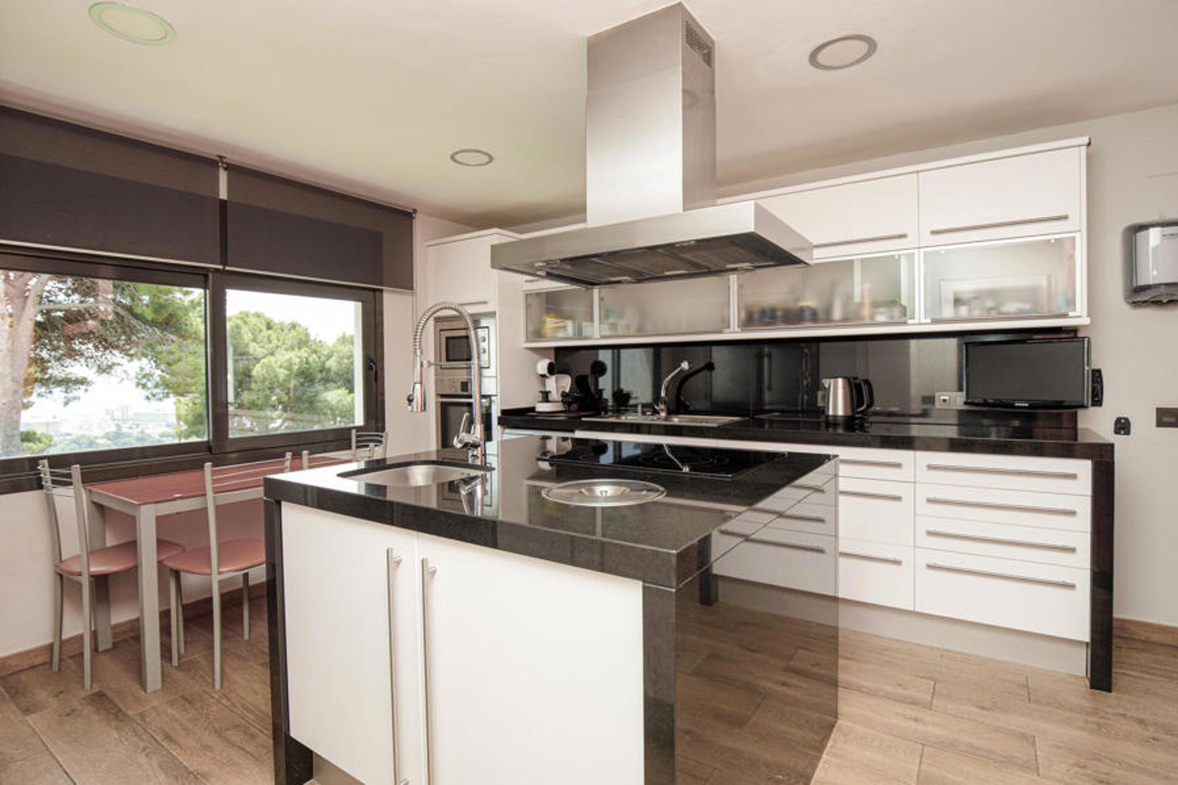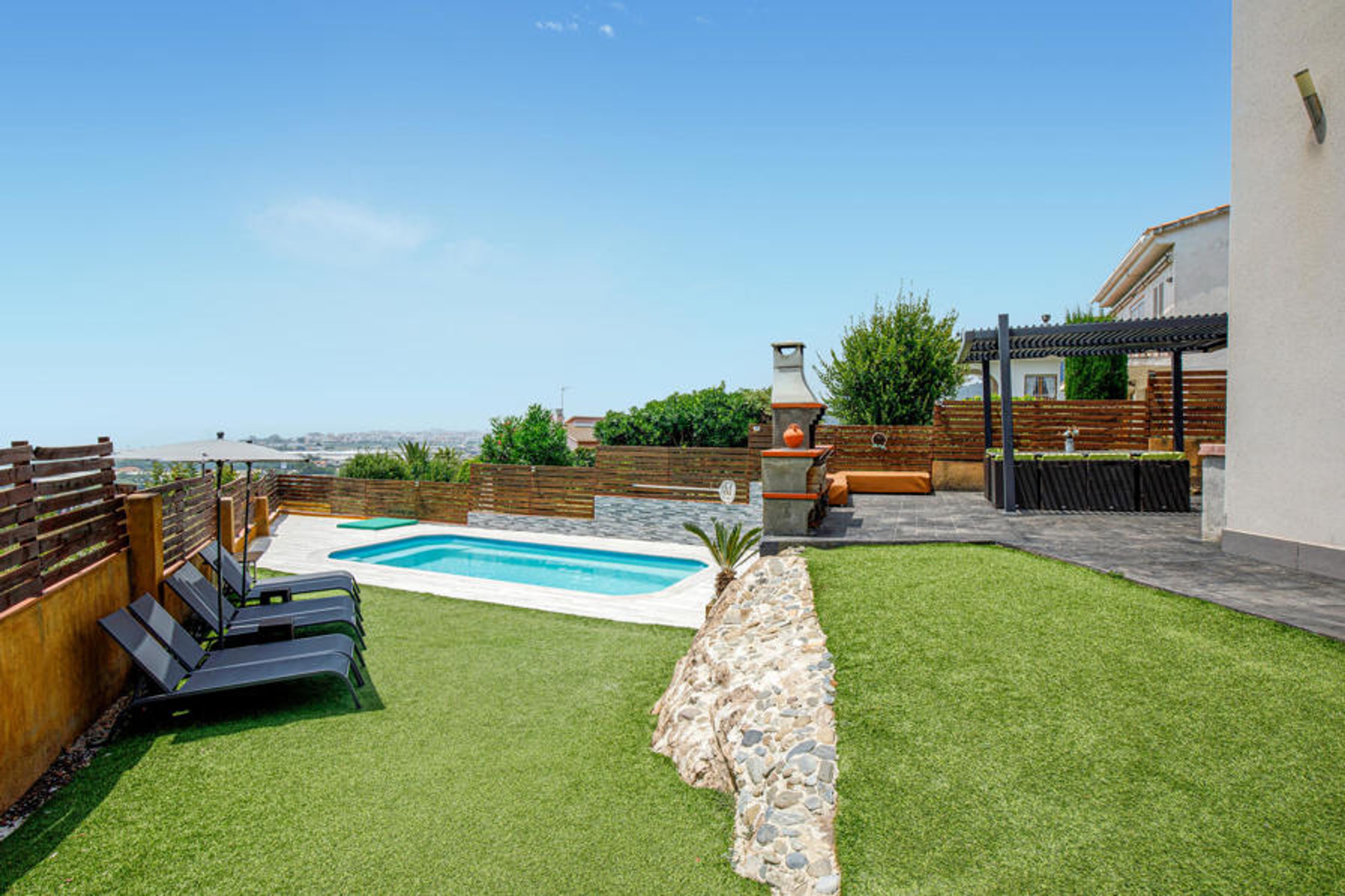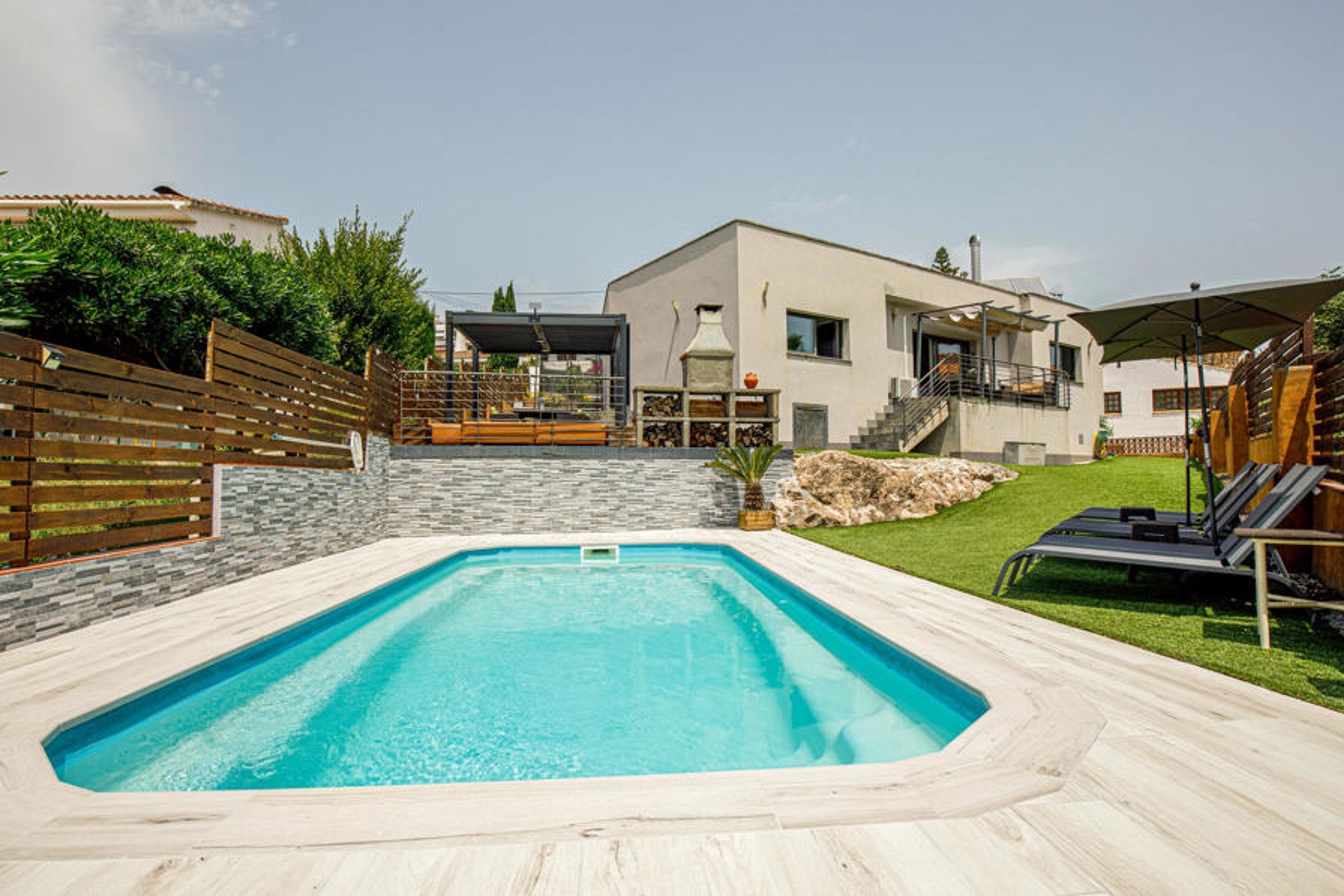 This dreamlike luxury vacation home is characterized by its modern architectural style and beautiful residential location. The large garden with private pool provides pleasant cooling and lots of swimming fun on hot summer days. Right next to it is the great barbecue area overlooking the beaches of Santa Susanna, where a variety of water sports activities are offered such as diving, kayaking, snorkeling and sailing. The region is characterized by its beautiful landscape and excellent gastronomy. Leisure activities such as mountain biking, trekking, horseback riding and golf can also be practiced here. The house is very tastefully and comfortably furnished and in the luxurious kitchen with cooking island cooking is really fun. Enjoy a relaxing stay that will satisfy even the highest demands.