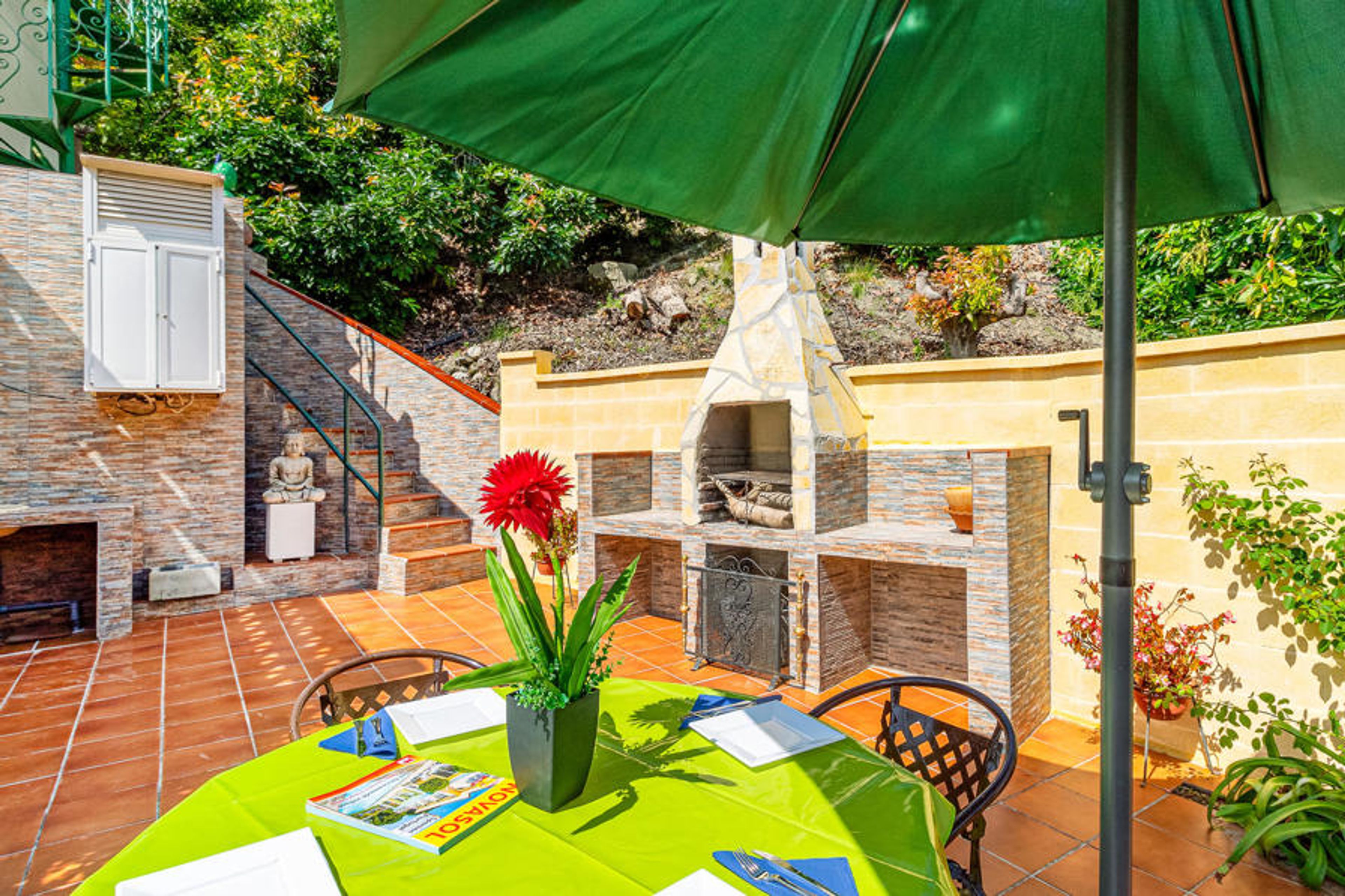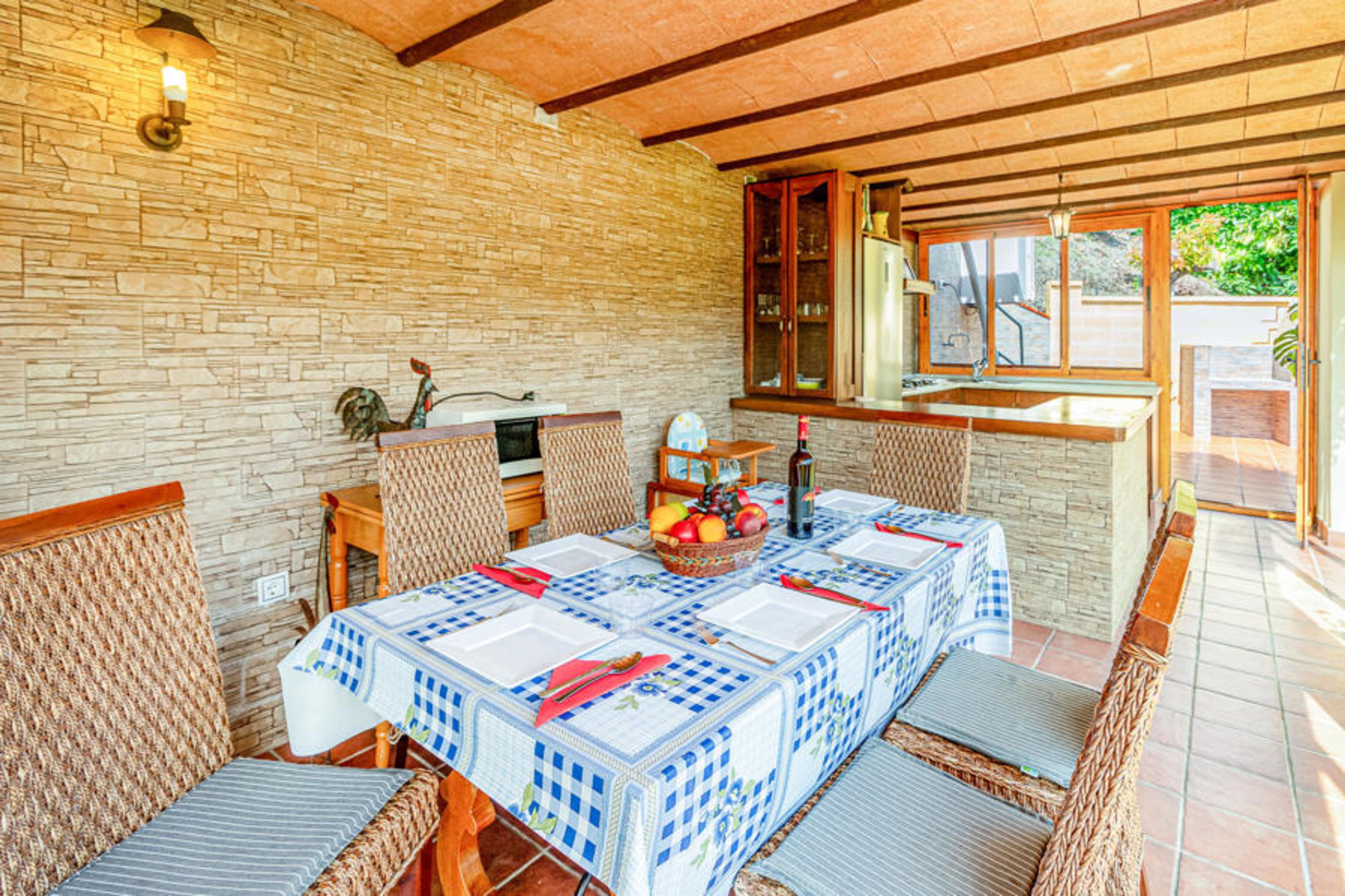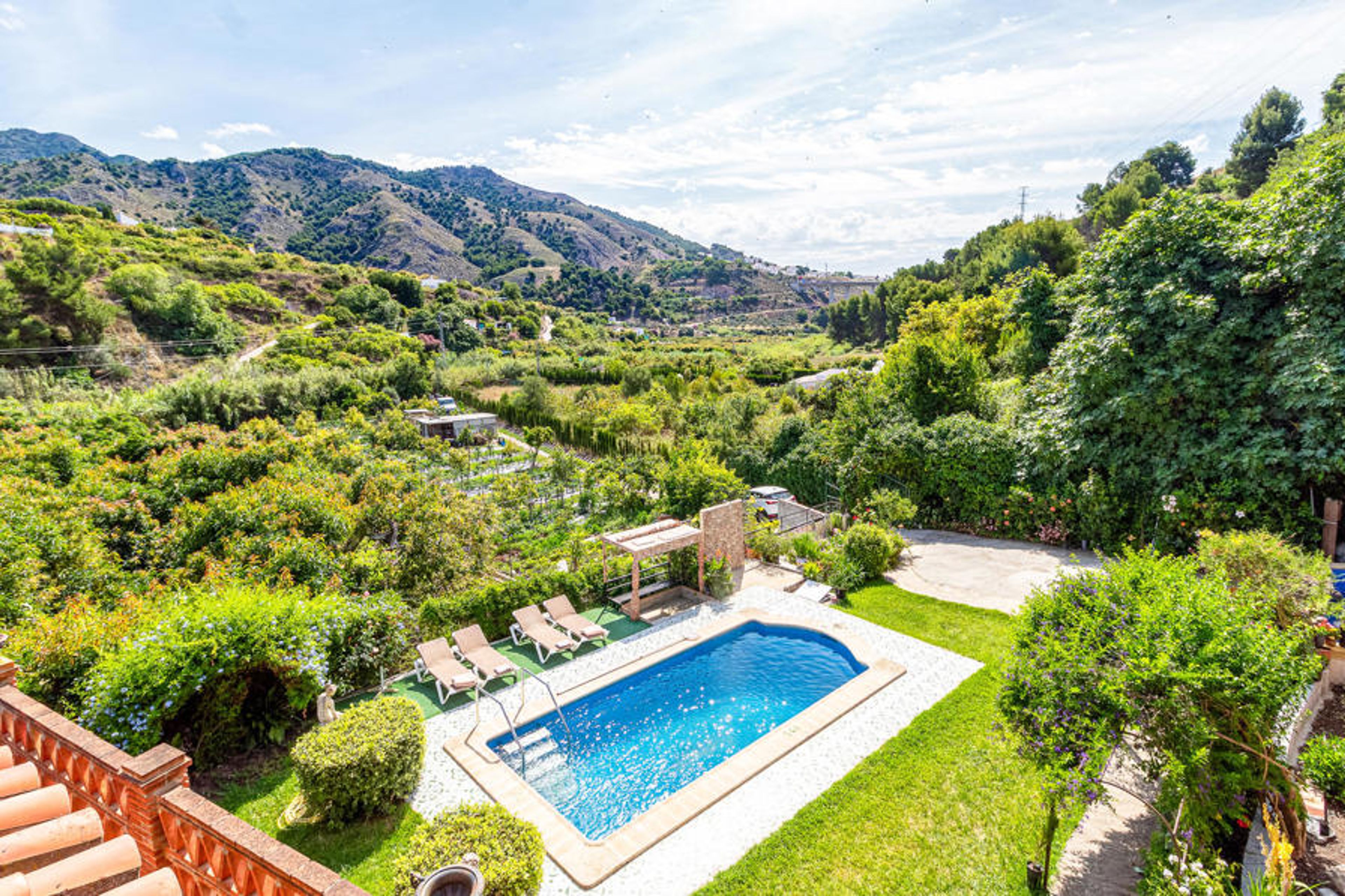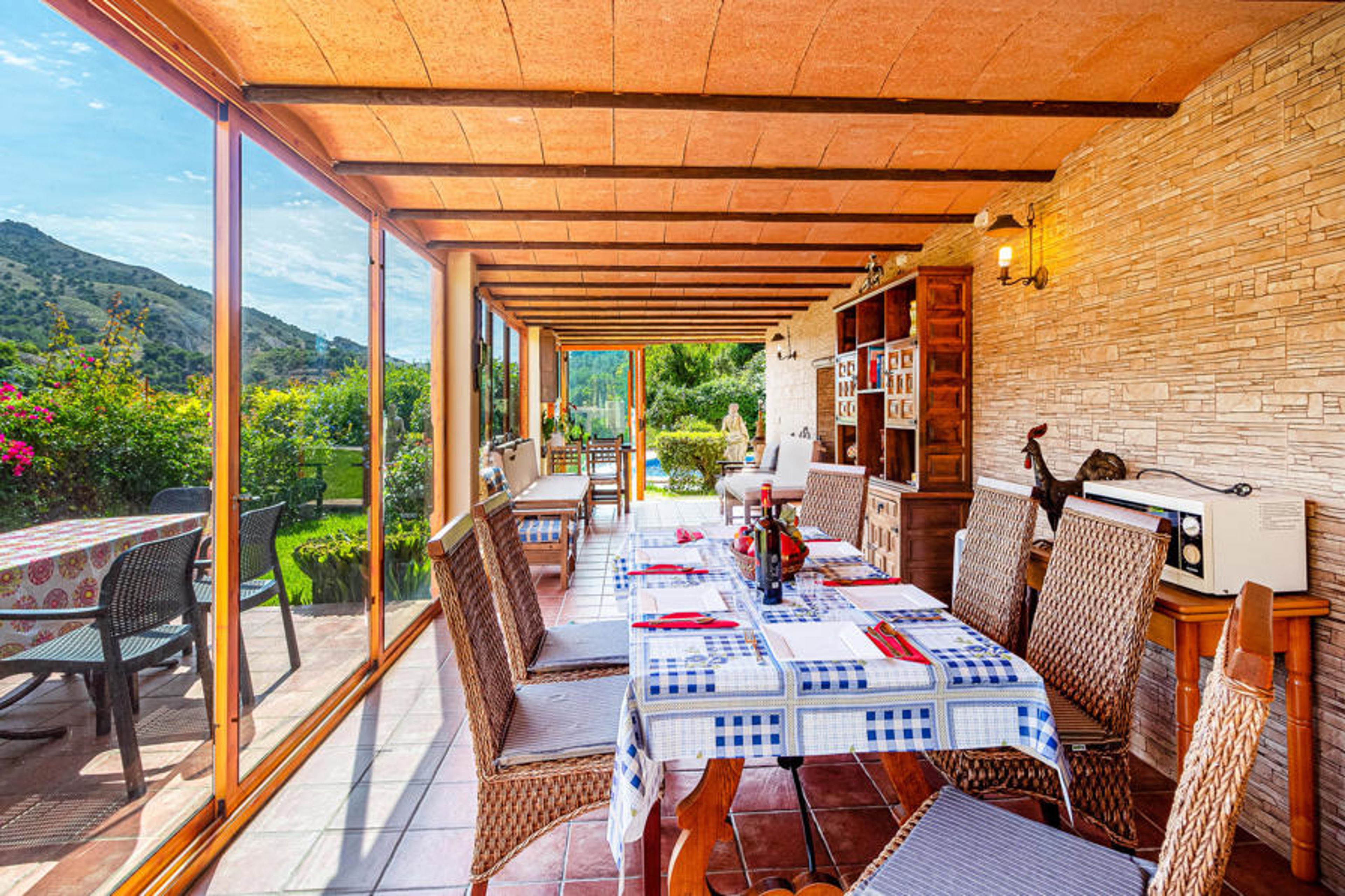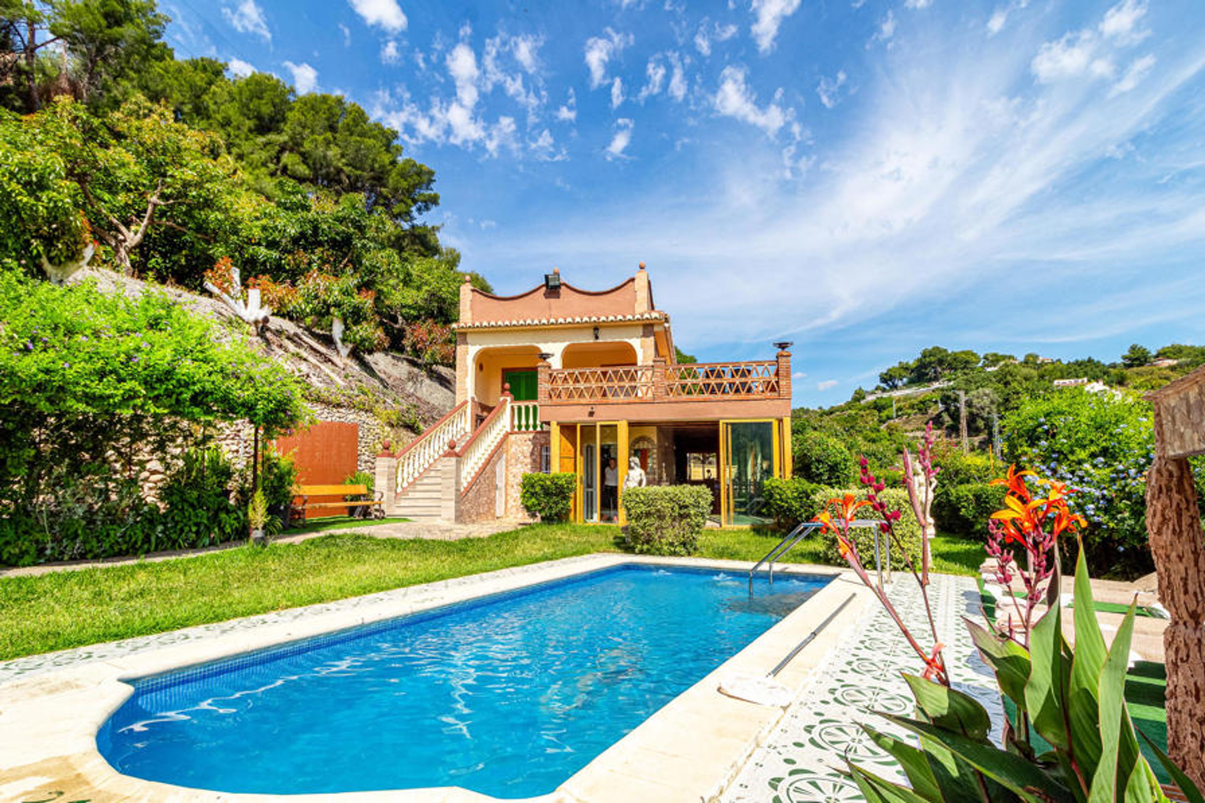 You reach this attractive vacation villa, via a narrow road, where you drive through the dried up riverbed of the river Chillar - a very attractive place for the popular "River Walk", where you wait through the river, between avocado groves and a great landscape. As soon as you enter the villa, you will see that the drive was worth it. A very special place, surrounded by green plants and colorful flowers, in the silence of the valley with views of the mountains that you can enjoy from the private pool. The villa has a large terrace on the upper floor and a beautiful view of the surroundings, as well as a covered terrace with sliding glass doors on the first floor, which makes the stay almost a little romantic in the colder seasons. The house is divided into two sections: On the first floor you will find a small kitchen, dining area, bedroom with 2 single beds, bathroom, laundry room (with the possibility of an extra bed) and access to the terrace with another dining area and a built-in barbecue. The entrance to the second floor is only possible through the external staircase. Here you will be offered a nice and cozy living room with fireplace, another kitchen, a bedroom with double bed, a bedroom with single bed and a bathroom.