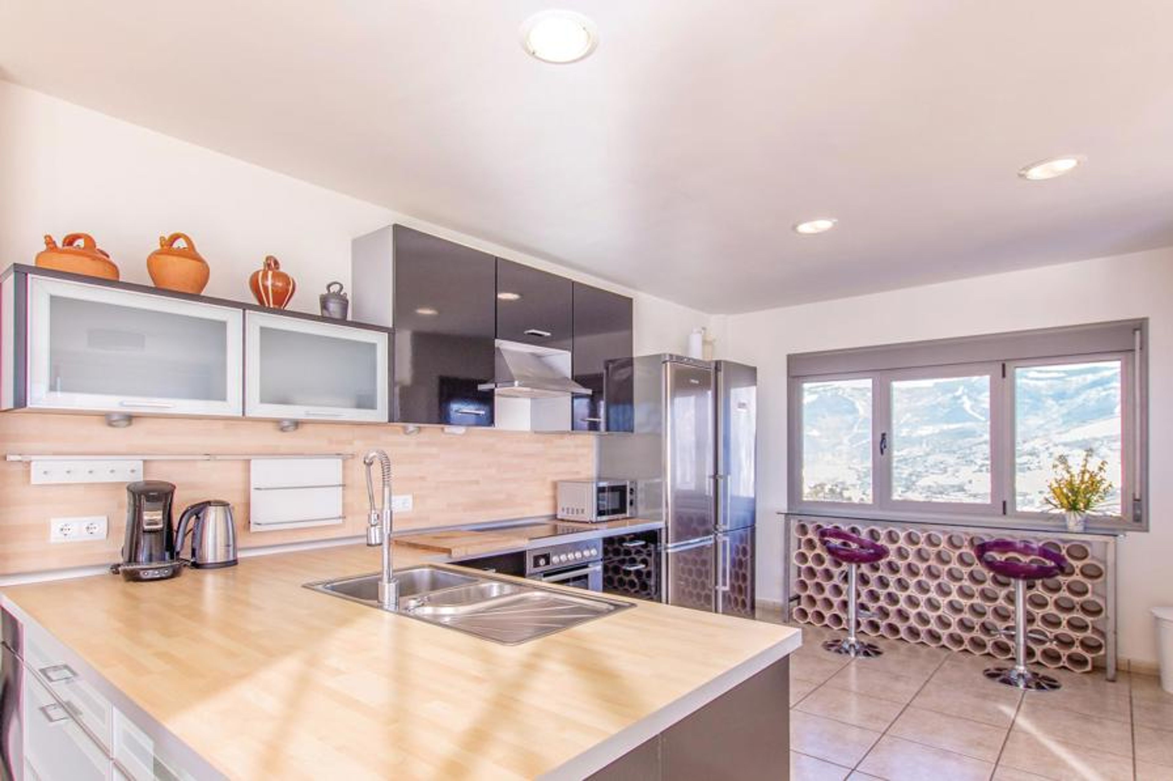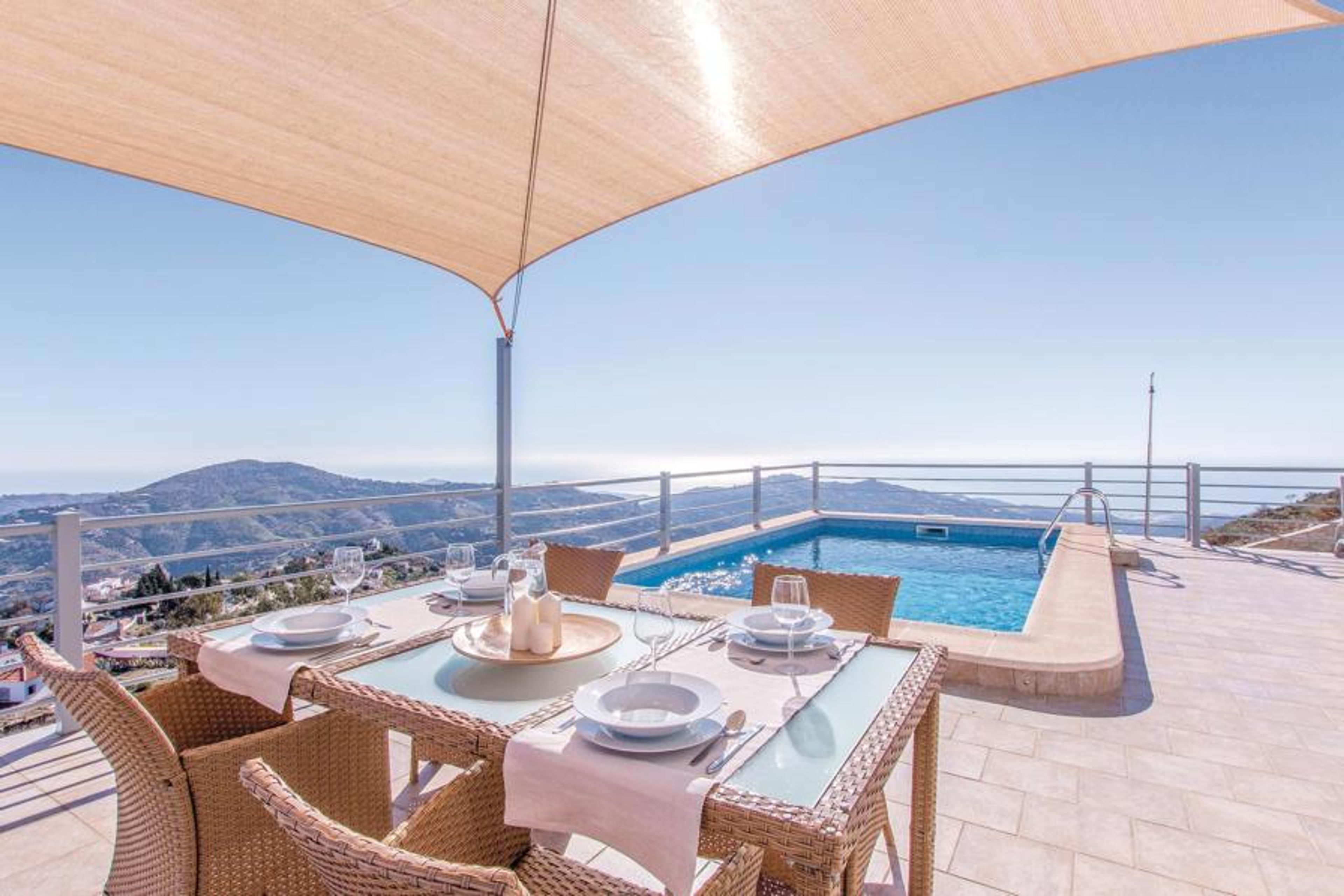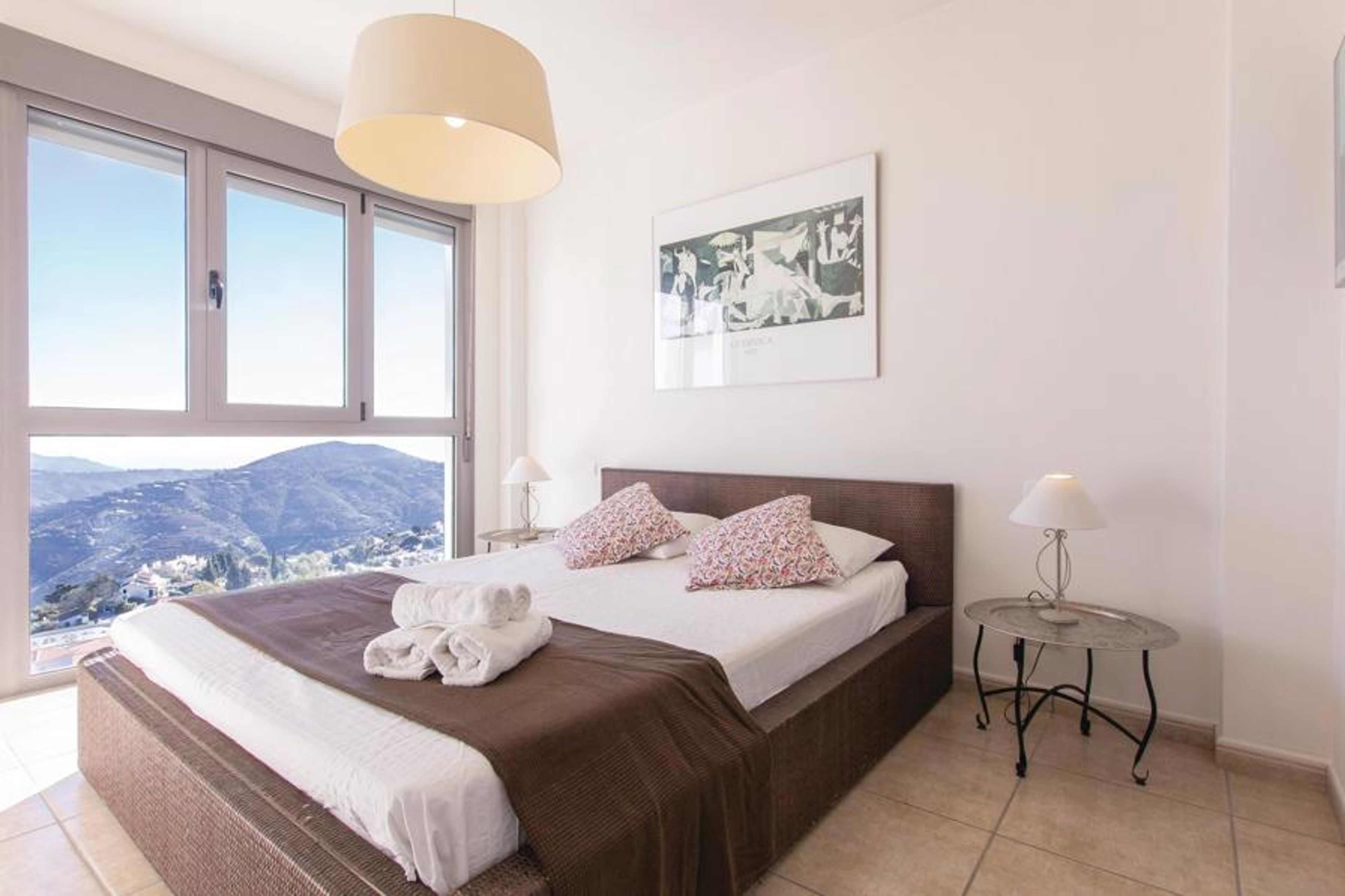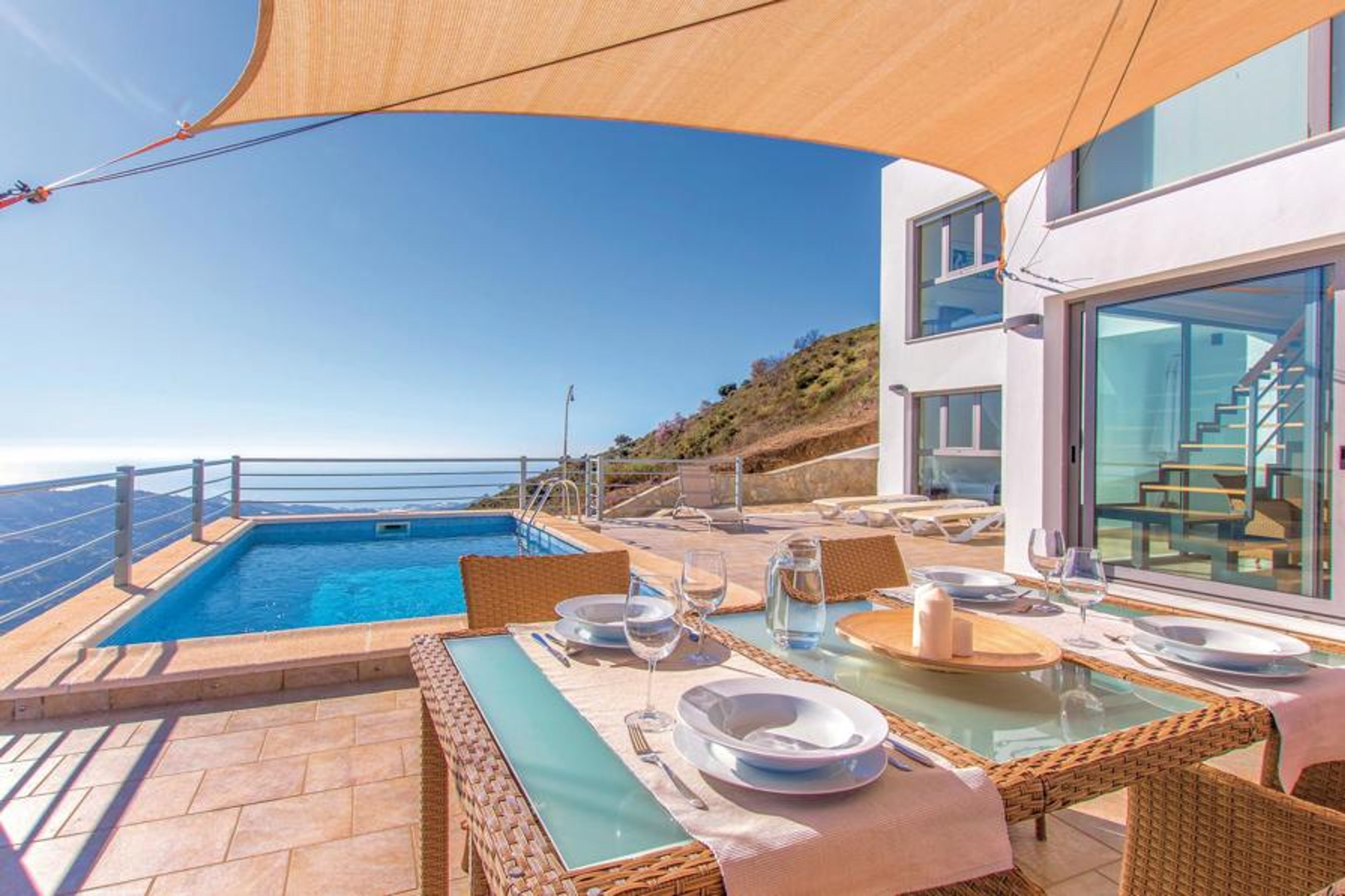Ultra-modern cottage with large windows overlooking spectacular scenery. The fully equipped kitchen offers enough space to prepare your meals. All bedrooms on the second floor are furnished with selected taste and the master bedroom offers a privileged view of the pool and the Mediterranean Sea. The beautiful terrace with awning and exquisite garden furniture directly opposite the pool area, invites to cozy get-togethers and romantic meals with stunning views of the nearby mountains and the typical white cottages of the villages and the coast. Try the typical rural cuisine in Cómpeta and try for example the "migas" or just take some of the delicious tapas for the small hunger. Enjoy a promising vacation with a guarantee of well-being at the highest level! The house, built on a slope, can only be reached via several stairs (56 steps). The access to the house is via a steep dirt road, which is only asphalted in places.