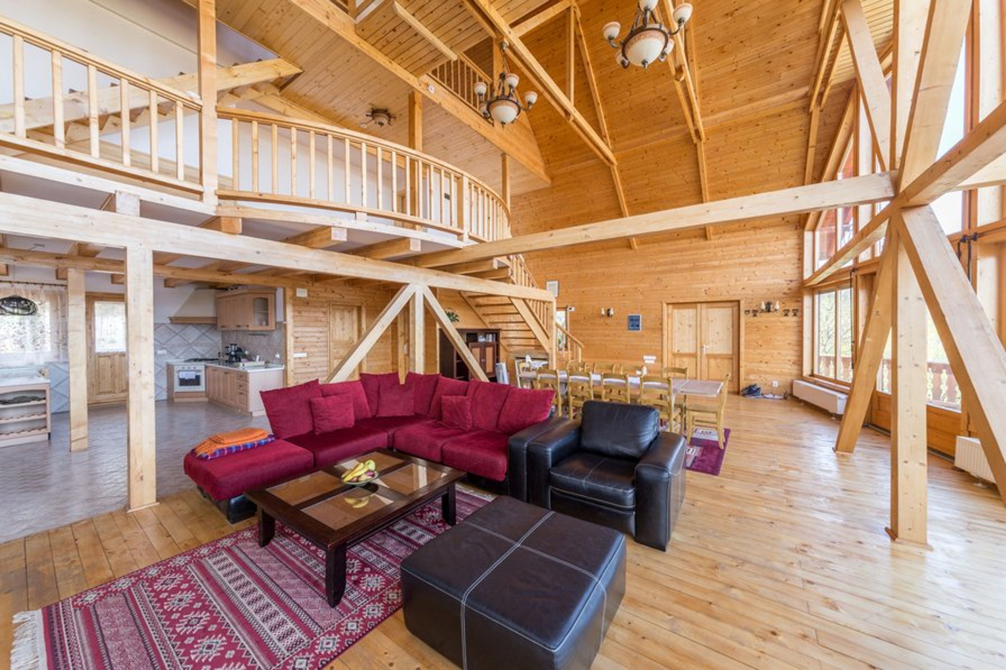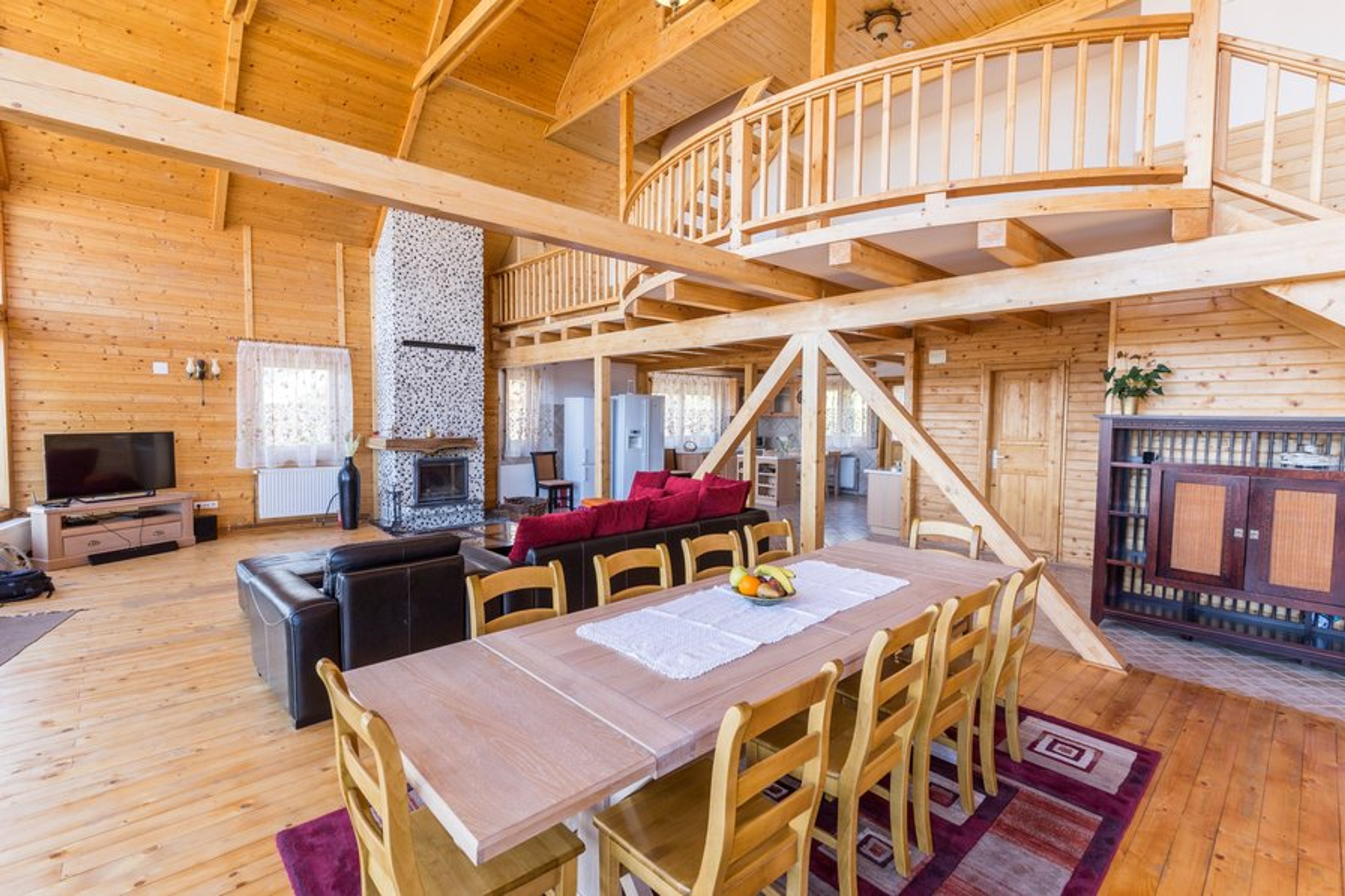 Carpathian Log Home2 will comfortably accommodate 10 people in the 5 double bedrooms, with space for 4 extra persons on the sleeping sofas in the livingroom. All bedrooms have ensuite bathrooms, they're large and well lit, with amazing views to the Bucegi and Piatra Craiului Mountains. You will enjoy the smell of wood in the whole chalet, the solid wood furniture and the fine bedding will ensure a good rest. All bedrooms are fitted with a flat screen tv with cable channels, plenty of storage space, blackout curtains and exterior shutters, balconies, plenty of space for an extra bed.