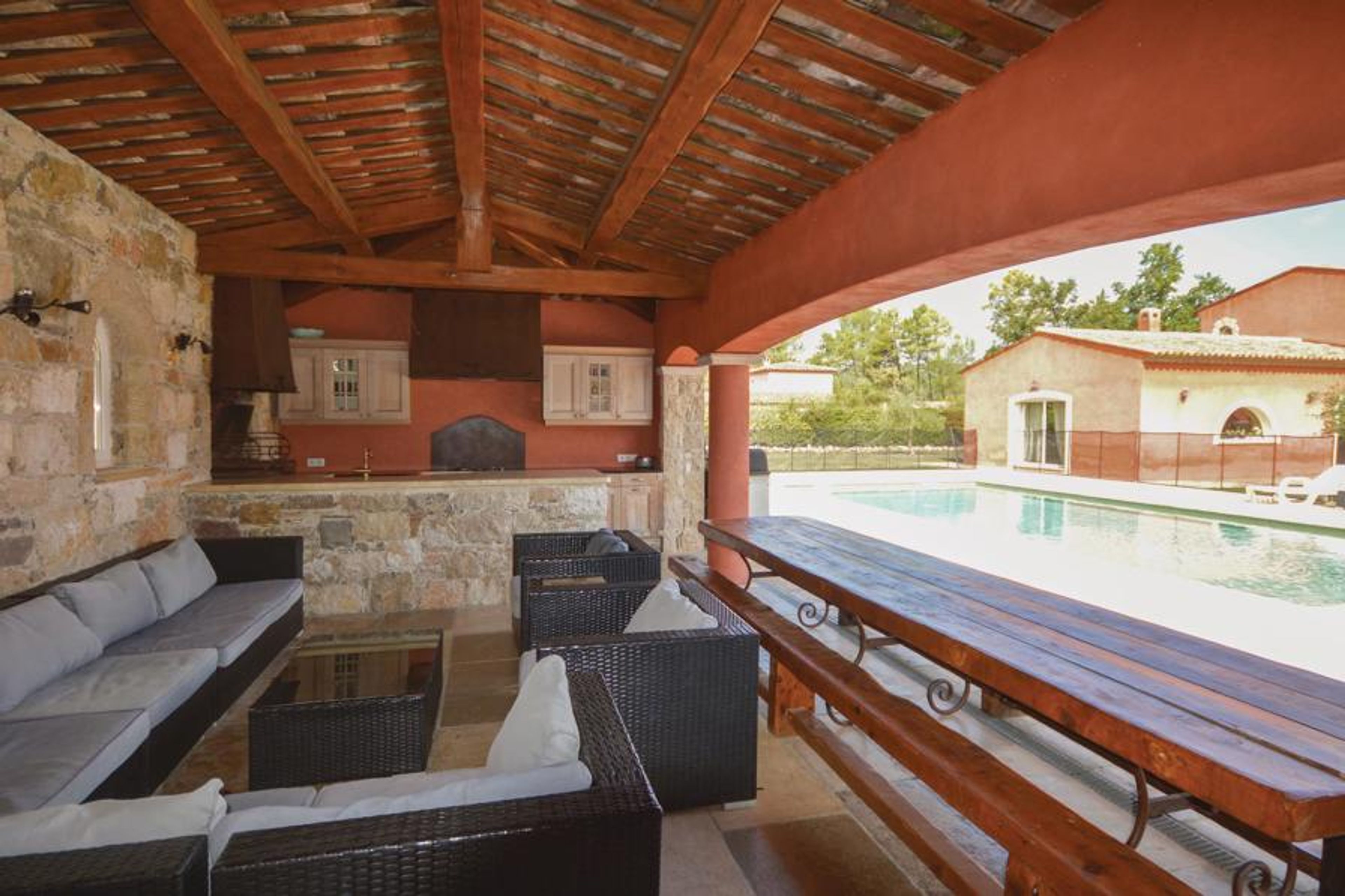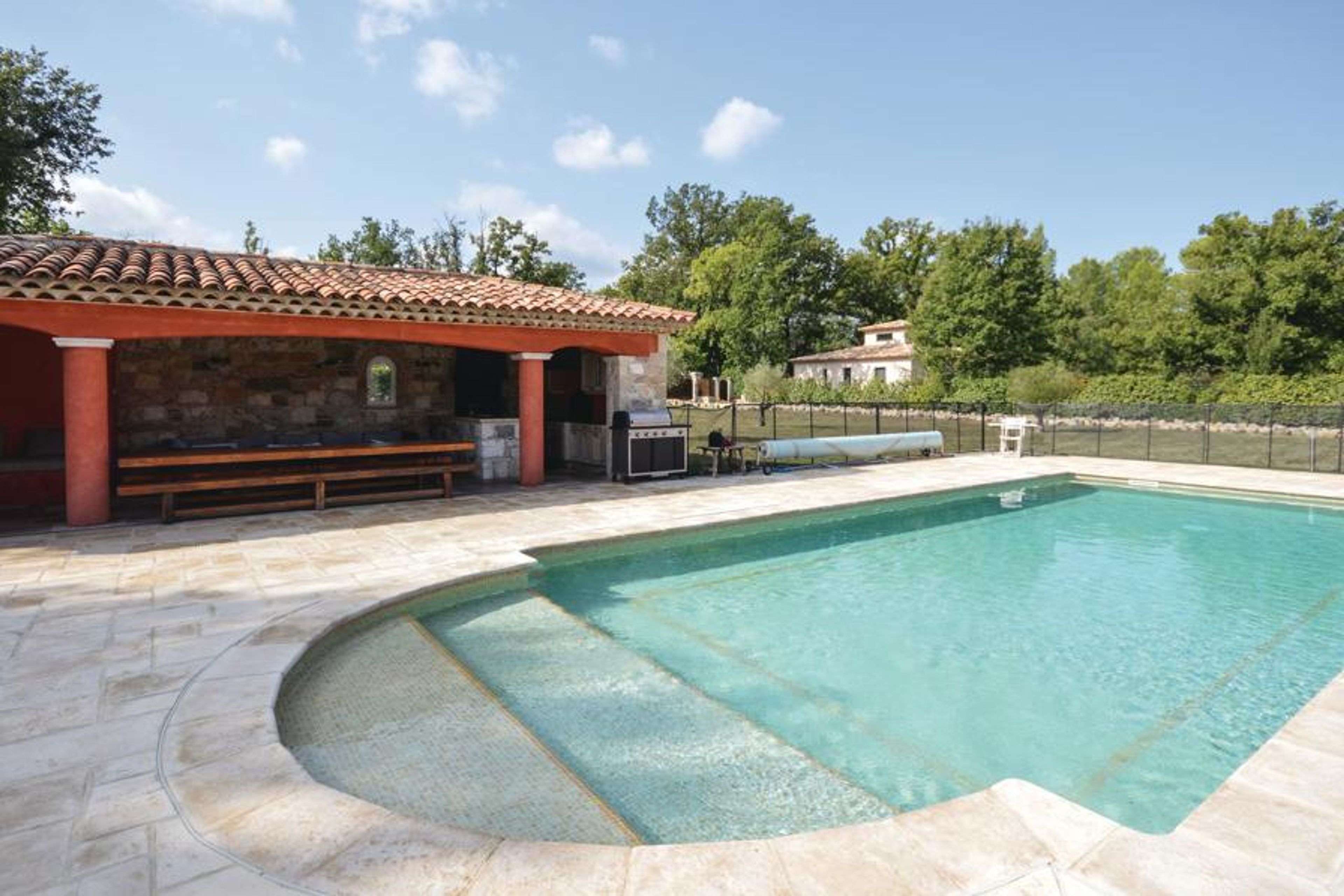 This Mediterranean villa in a warm red color and with many round arches underlining its original construction opens its doors to you on an immense plot just outside a charming village. An imposing fireplace in an 80 m² salon and an open and fully equipped kitchen, together with a partially covered terrace in the style of a ground walkway and an almost oversized fenced pool, make this property one of your most beautiful vacation destinations ever. Spacious rooms with precisely selected furnishings are distributed around the Roman staircase that takes you to a small upper floor. Beautiful tiles decorate the major part of the house, in the remaining part a tasteful parquet was laid. Callian is located a few kilometers from Fayence and not far from Cannes and the Litoral. Protected by an eletronic gate, the house is located in a rural setting a good 2 km outside the village.