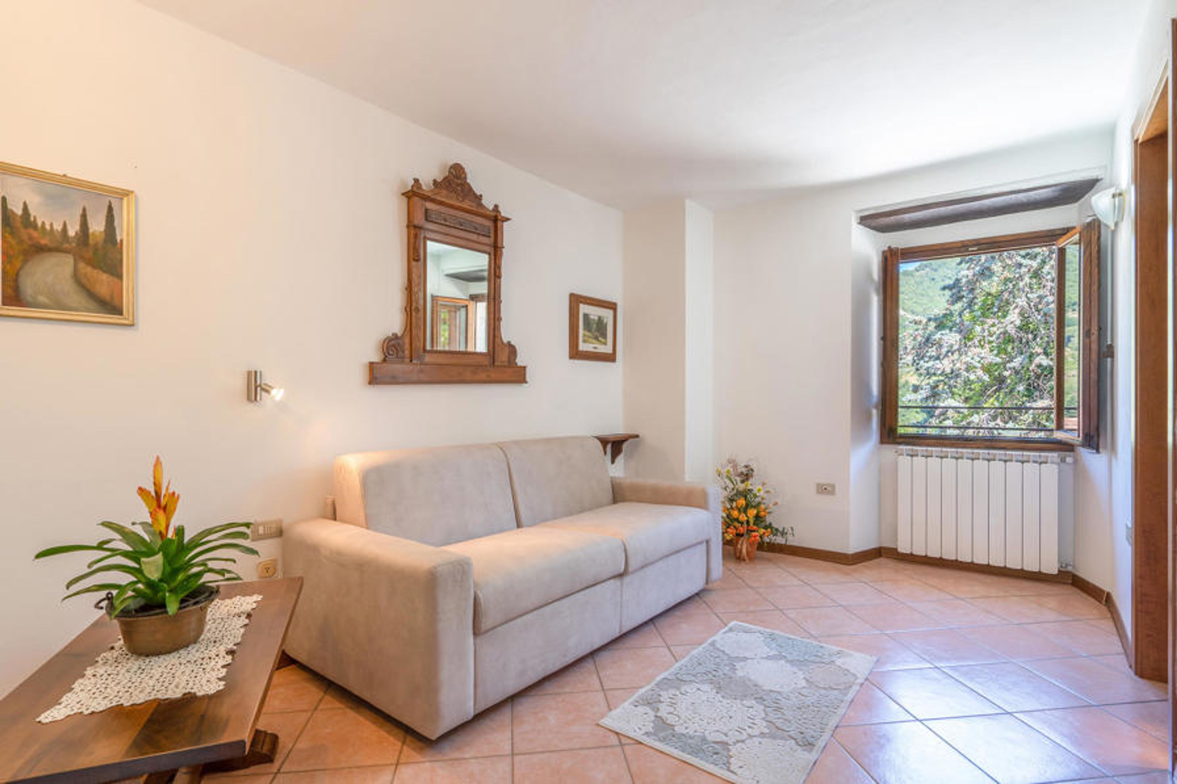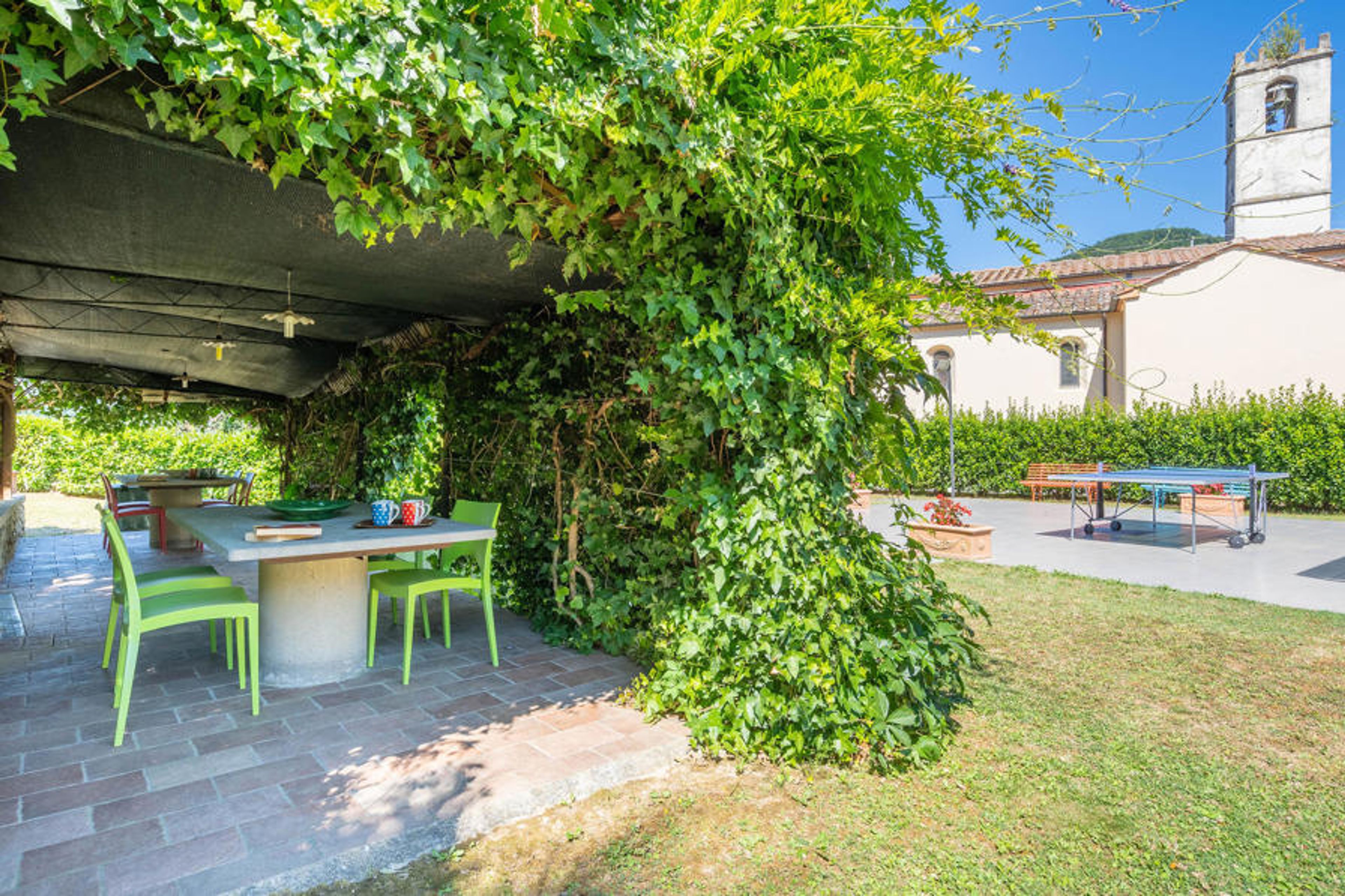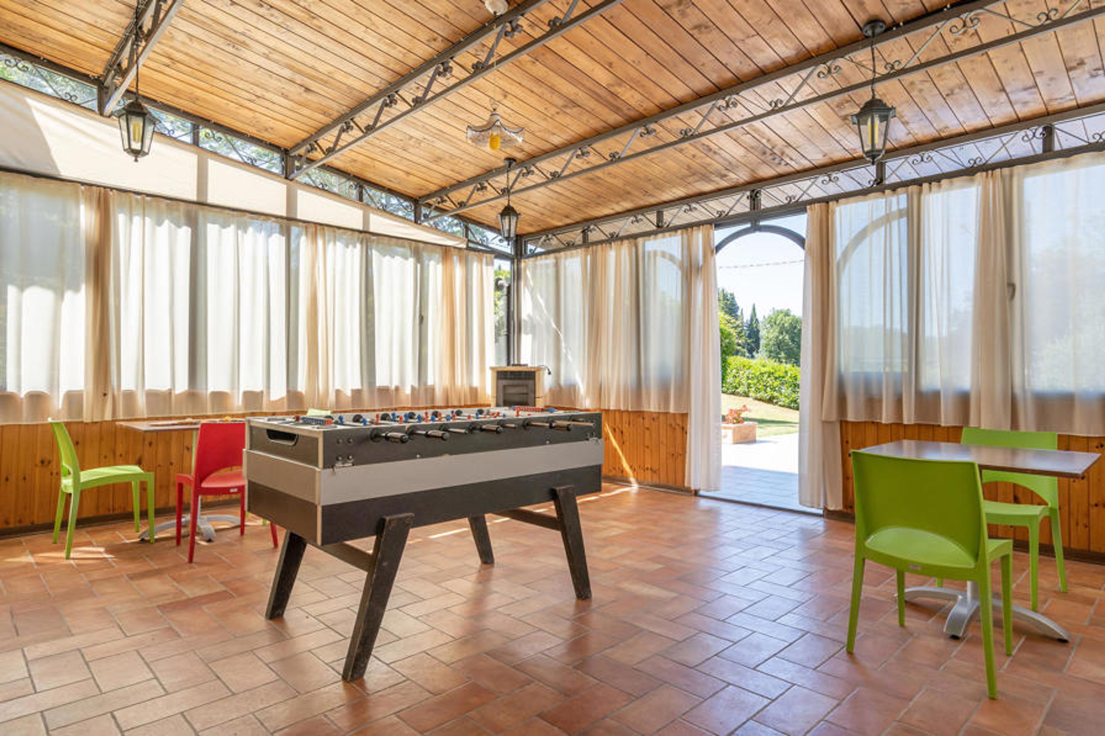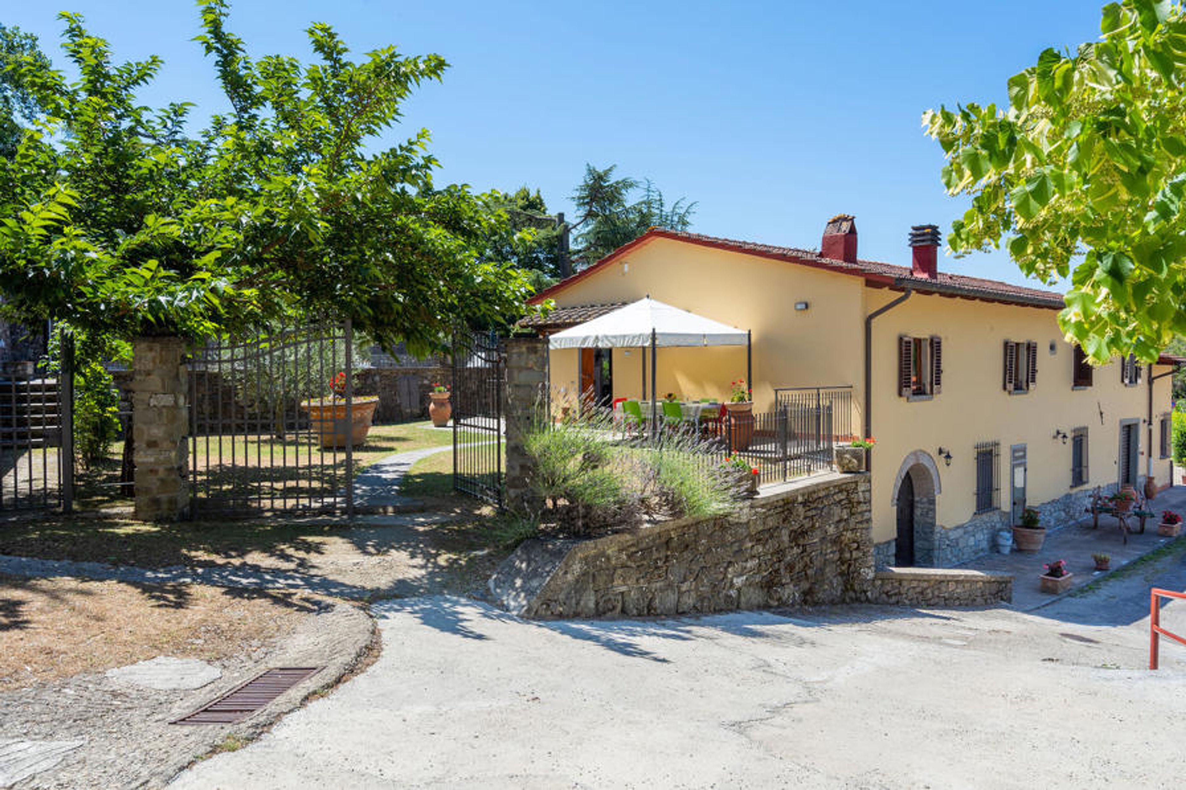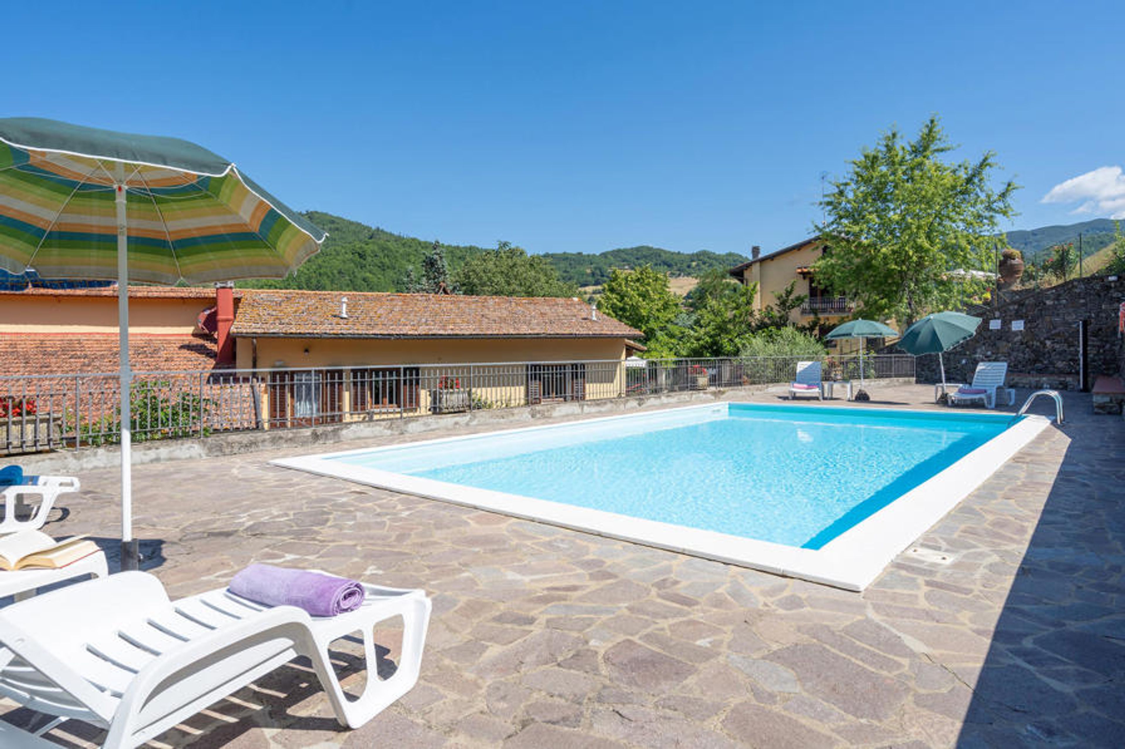 About 8 km from Dicomano, this vacation home is located in a romantic side valley in the Mugello, on the edge of a small hamlet. You enter the kitchen-living room through the front garden and the terrace; the various bedrooms and bathrooms are adjacent. On the first floor guests can enjoy a covered terrace with table soccer. Above the house is the private sunny pool area (salt water) with sun loungers and umbrellas and with charming views of the little church opposite and into the small valley. This house is ideal for a group that likes to relax and exercise outdoors. On the large property there is a children's playground, table tennis a shady pergola and - a little further away - a whole playing field for ball games and kicking! Not enough: there are 6 mountain bikes waiting on site for sporty guests, because the area is perfect for trekking and biking through the nearby natural park of Casentino/Monte Falterona. There are small towns, medieval castles and monasteries to discover, including local specialties with porcini mushrooms, truffles and good sheep's cheese. The friendly owners live in the house next door and are happy to help and advise guests if needed. For a contrasting program, a trip to Florence is worthwhile: take the Mugello train, which departs from the nearby town of Dicomano. Along the special Muraglione road, popular with motorcyclists, you can reach the Adriatic coast: San Marino (about 2 hours) and Rimini (90 minutes). Or relax for a day in the thermal baths of Castrocaro (about 50 minutes by car). Dicomano with stores, pizzeria, bar 8 km.
