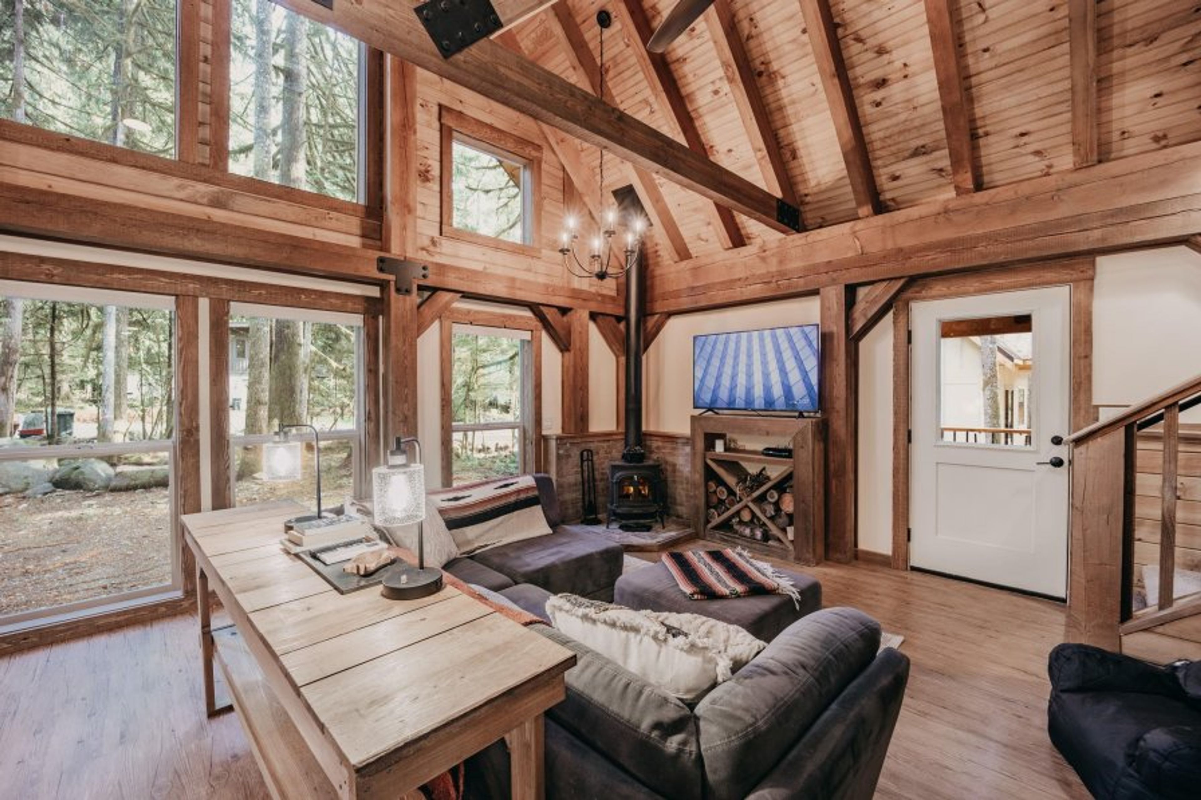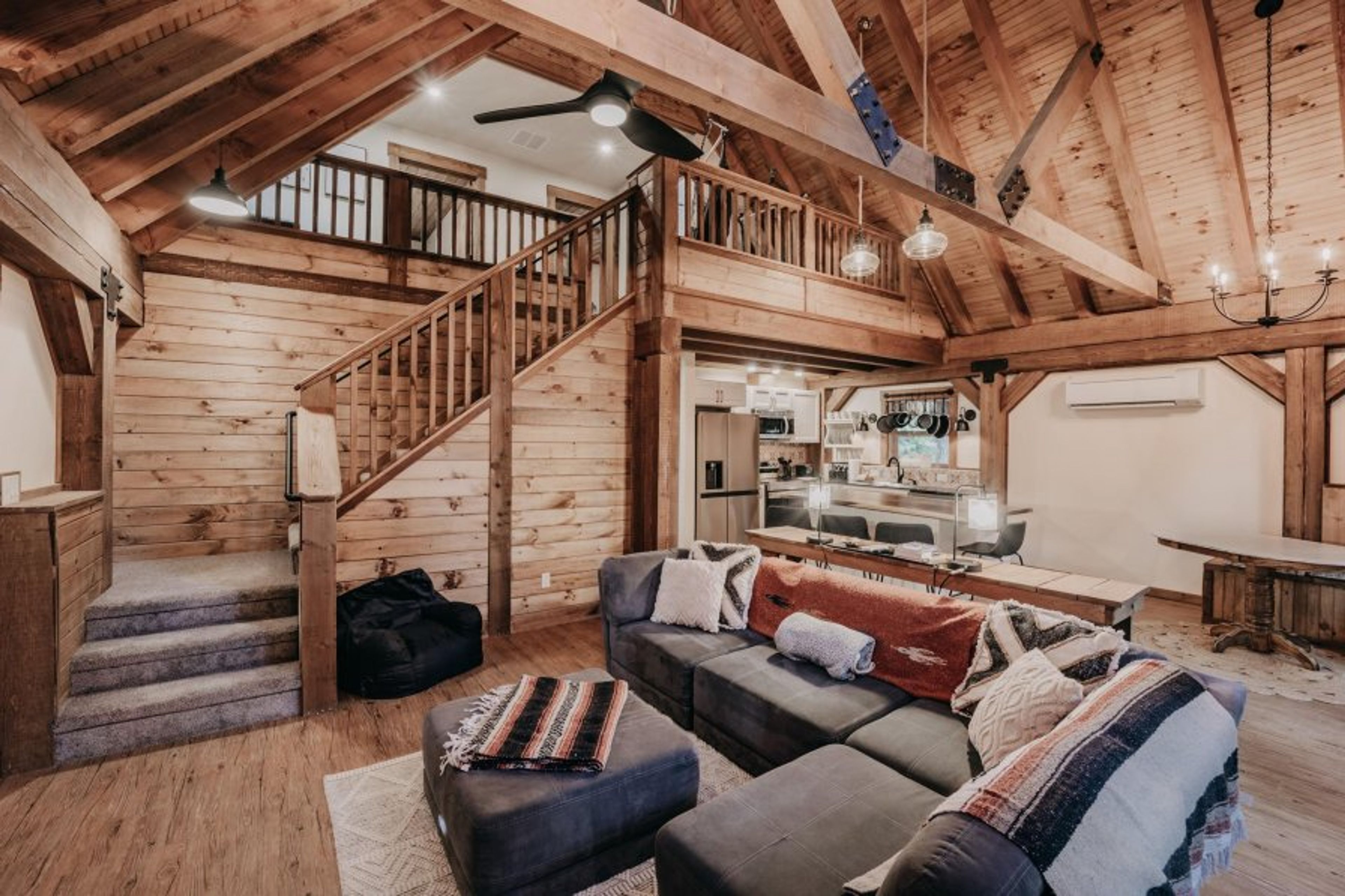 Your family will have a wonderful time making lasting memories while staying in this brand-new rustic/chic 2-story, 3-bedroom, 2-bath home. Lovingly hand-crafted from timber sourced on the premises, this brand-new and beautiful home personifies a modern-day rendition of a “cabin-in-the-woods.” Upon entering the open living, dining, and kitchen area with vaulted ceilings and floor-to-ceiling windows offering great territorial views, you’ll be thrilled with all of the incredible attention to detail including a custom kitchen island workstation/breakfast bar with seating for four, plus a separate table/seating area for two, a higher-end LG stainless appliance package including a dishwasher, a farmhouse sink, a comfy corner group sofa facing a freestanding wood fireplace, (firewood provided) and a large flat screen monitor. A hallway then leads into a mudroom with plenty of space for gear storage, plus a full-size capacity stack washer and dryer. Next, there’s the primary bedroom with 1-queen sized bed, a flat-screen monitor, and a slider that leads to the backyard area with a generous-sized deck featuring a gas grill and a post and beam-covered hot tub. There’s also a full-bath ensuite. Ascending the staircase to the top floor reveals a loft sitting area, one bedroom with 2-twin-sized beds (perfect for kids and singles), and another bedroom with one full-sized bed and a flat-screen monitor, plus another full bath. Don’t fret about those warmer summer temperatures, as this cabin is equipped with a ductless heat and air conditioning system. This pet-friendly, (2-Pet Maximum, No Exceptions) WIFI* equipped and monitored family vacation property will sleep up to 6 persons (ENFORCED Maximum Occupancy!).