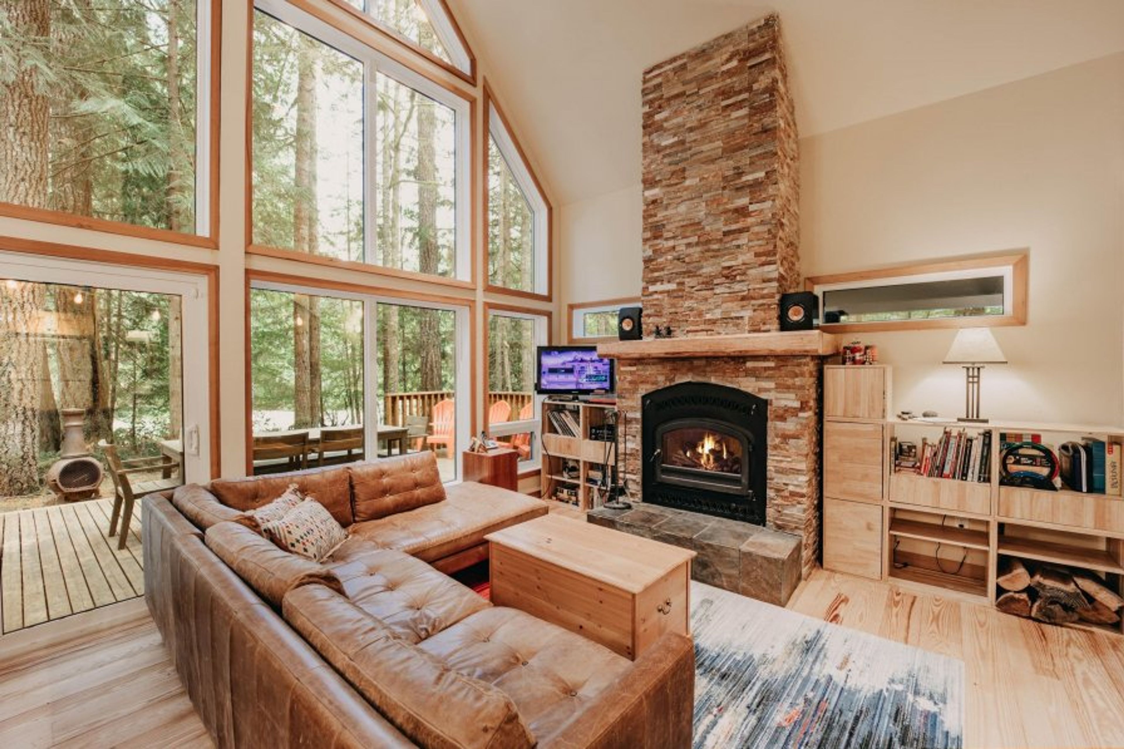 Summer and winter alike, your family will have a great time while staying in this 2-story, 3-bedroom, 2-bath classic NW cabin. The first floor features an open-concept living, dining, and kitchen area with vaulted ceilings and a grand easterly exposure provided courtesy of floor-to-ceiling windows. The living room features a brick hearth fireplace (firewood provided) for cozying up to, along with a flat screen monitor with Roku and a comfortable sectional couch. This is augmented by a fully equipped kitchen, including a dishwasher, a wraparound counter/breakfast bar, and a dining table with optional seating for up to eight persons. A short hallway leads to a bedroom with two full-sized beds, one full bath, and a mud/laundry room with a stack washer and dryer. Ascending the staircase to the second floor reveals one bedroom with 1-set of standard-sized bunk beds, a master bedroom with 1-queen sized sleigh bed, and a nicely crafted ¾-bath. Just outside, east of the main floor, there are sliding doors that access a nice deck for sipping your favorite beverages and taking in the splendor of Mt. Baker, while just outside, west of the main floor, there’s a small porch with a pathway to a private HOT TUB! Don’t forget Fido, this pet-friendly (2-pet maximum. No exceptions) and WIFI* equipped family vacation property will sleep up to 8-persons (ENFORCED Maximum Occupancy!).