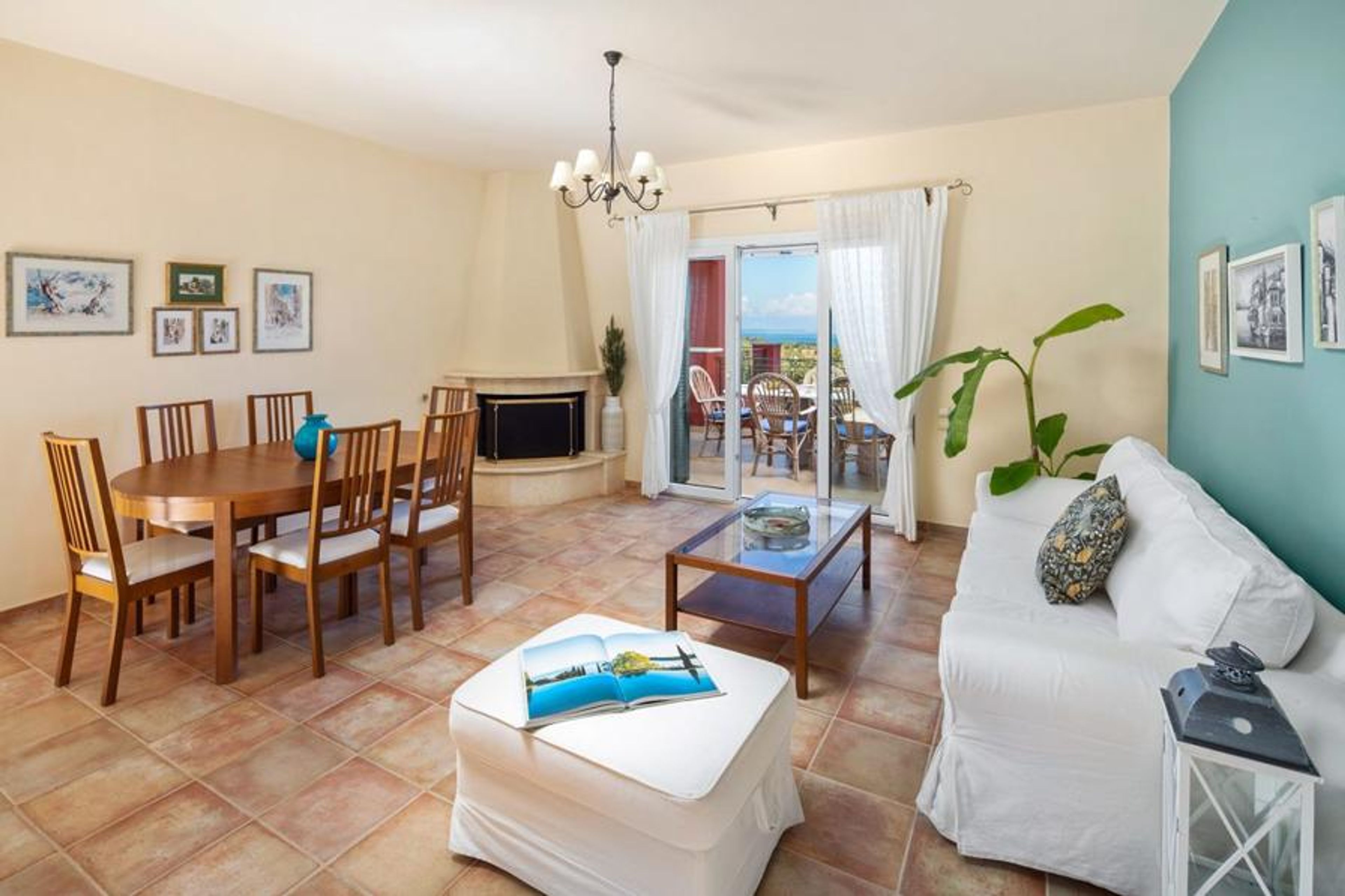 - Open-plan living room with fireplace and sliding doors to pool terrace