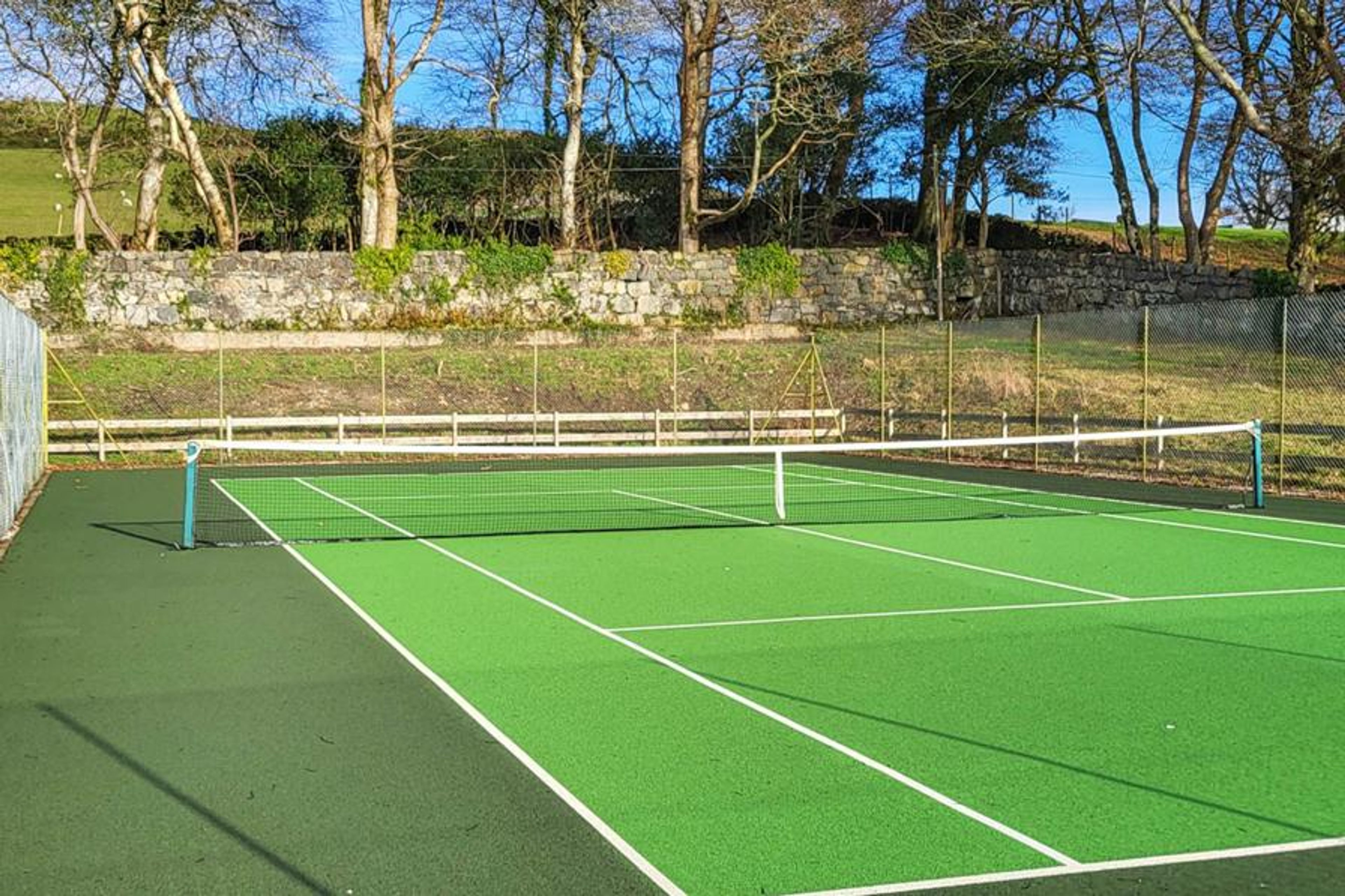 - Hard-weather tennis court, with views down to Cardigan Bay.