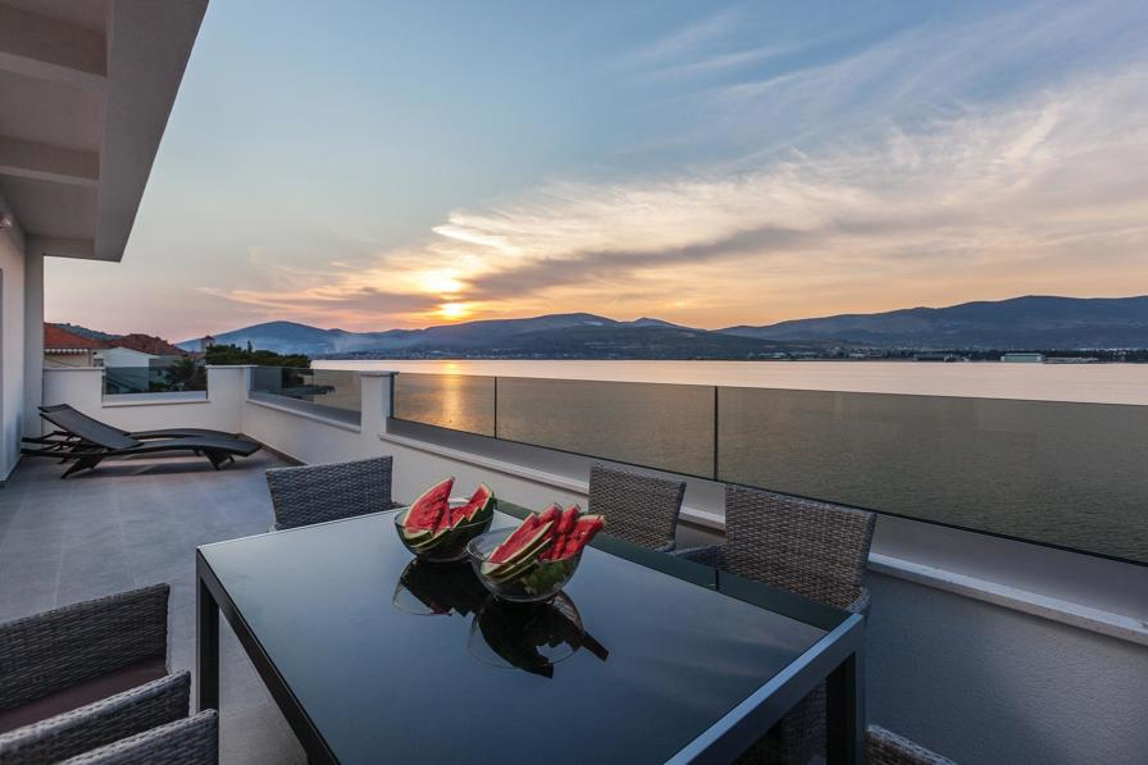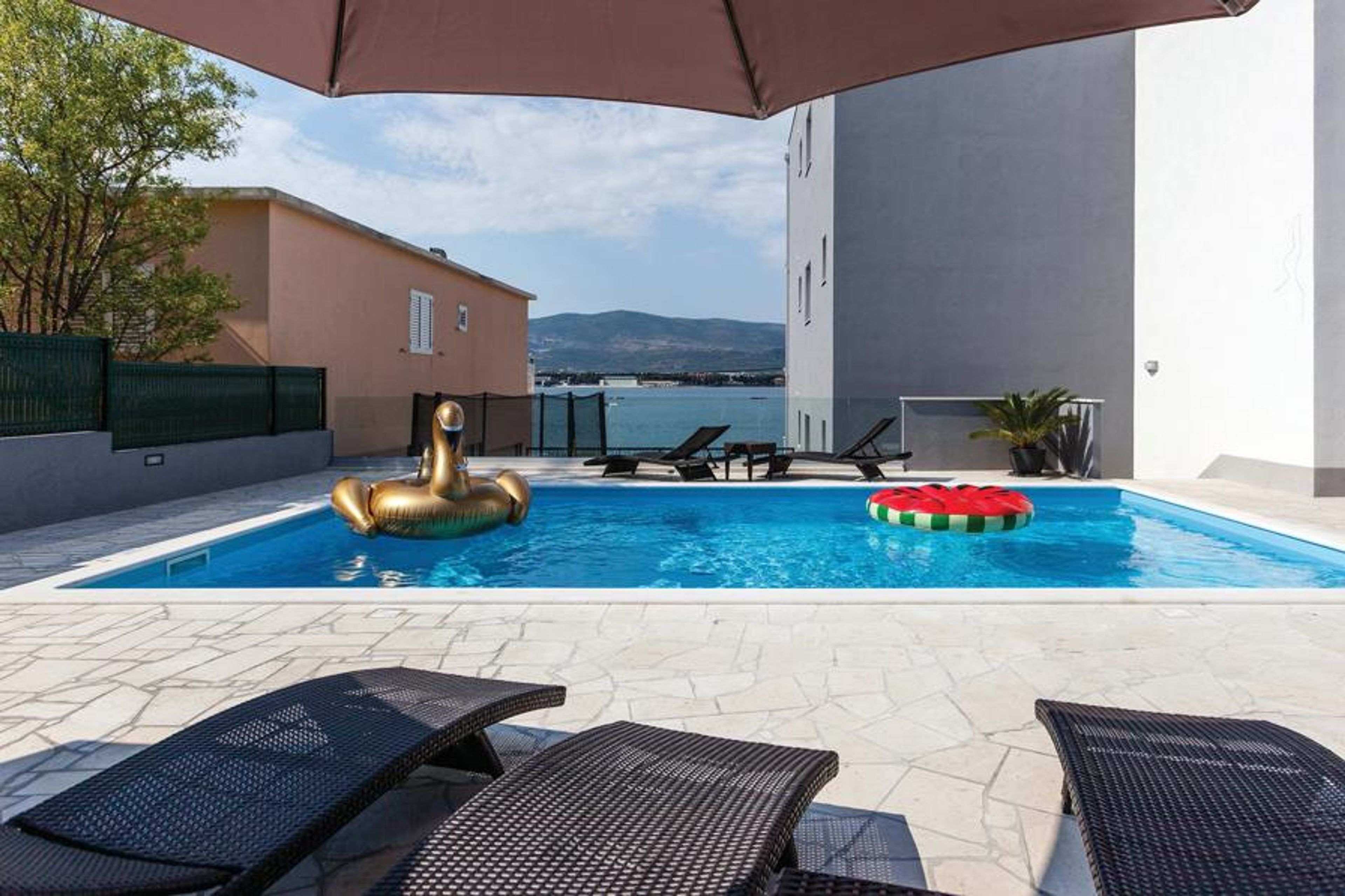 In Arbanija, the old village on the island of Ciovo, stands this large vacation home. The island is connected to the mainland by a bridge. The house consists of 3 comfortably furnished units with separate entrances, and is thus very suitable for a joint vacation of several friendly families. A beautiful pool with sundeck and barbecue terrace are available. The terraces offer a beautiful sea view. Explore the historic old town of Trogir, a city on the UNESCO World Heritage List, just 3 km away. Only 15 meters from the house you will find a beautiful pebble beach, there is also a restaurant in the immediate vicinity.