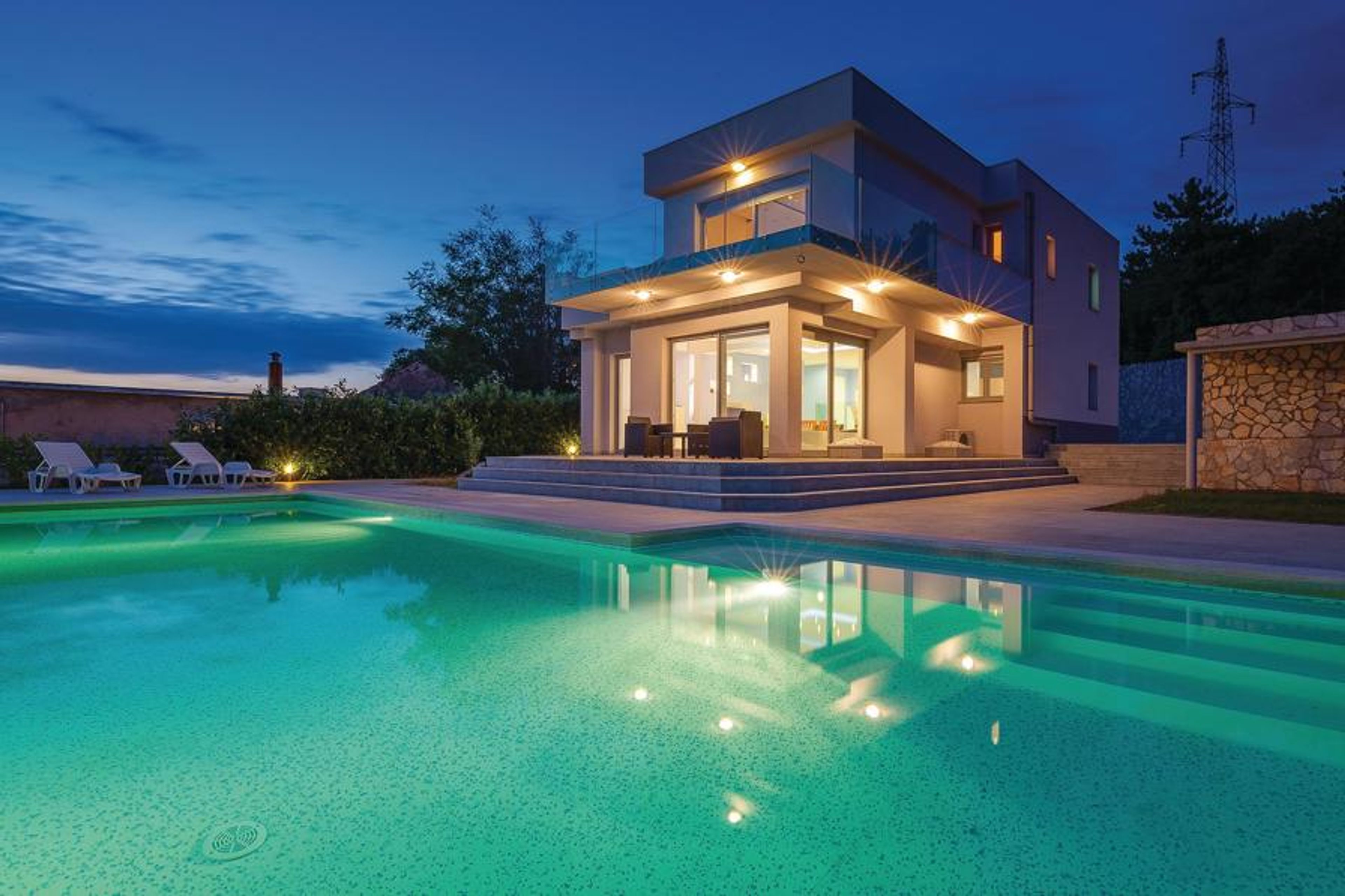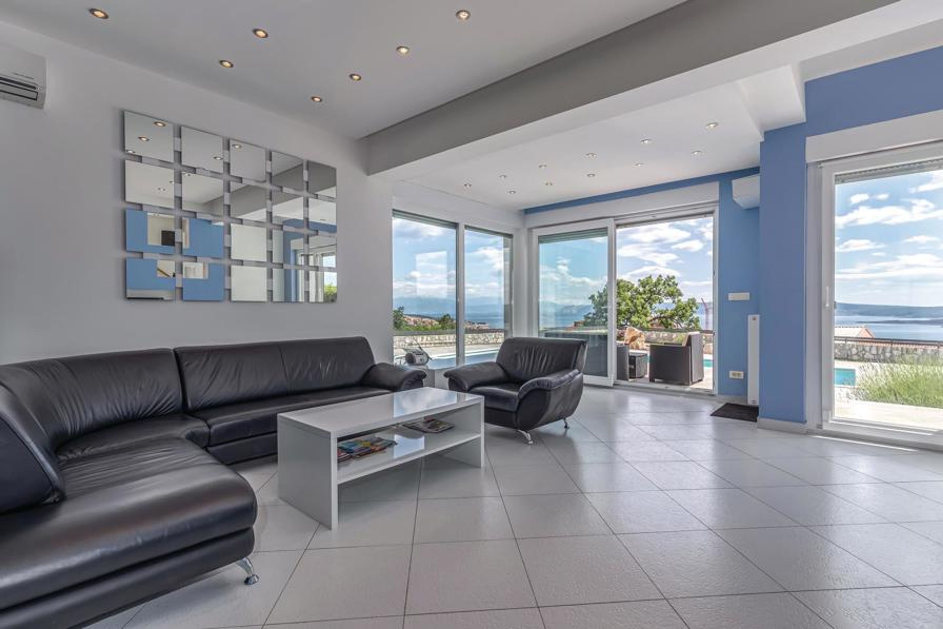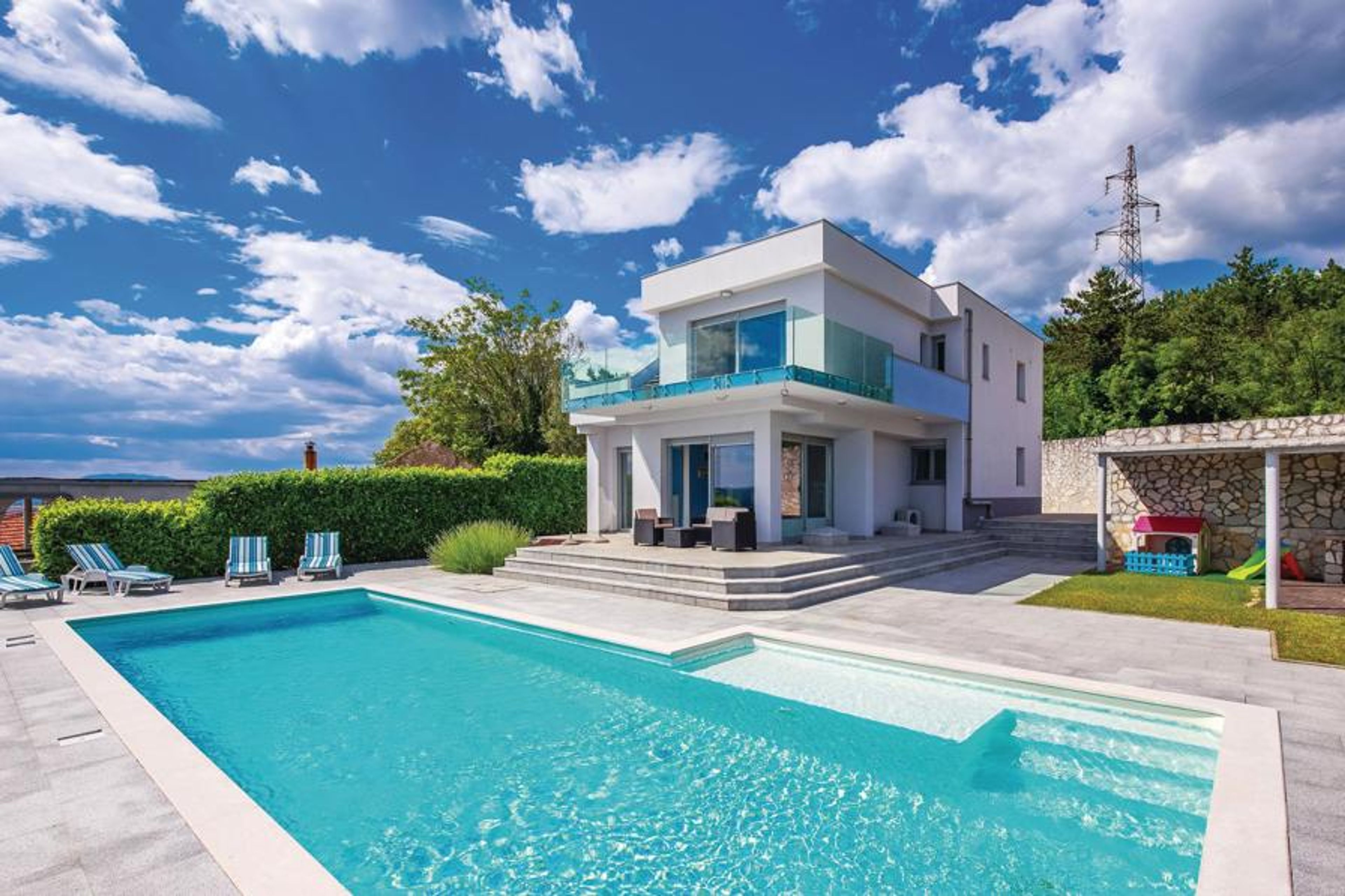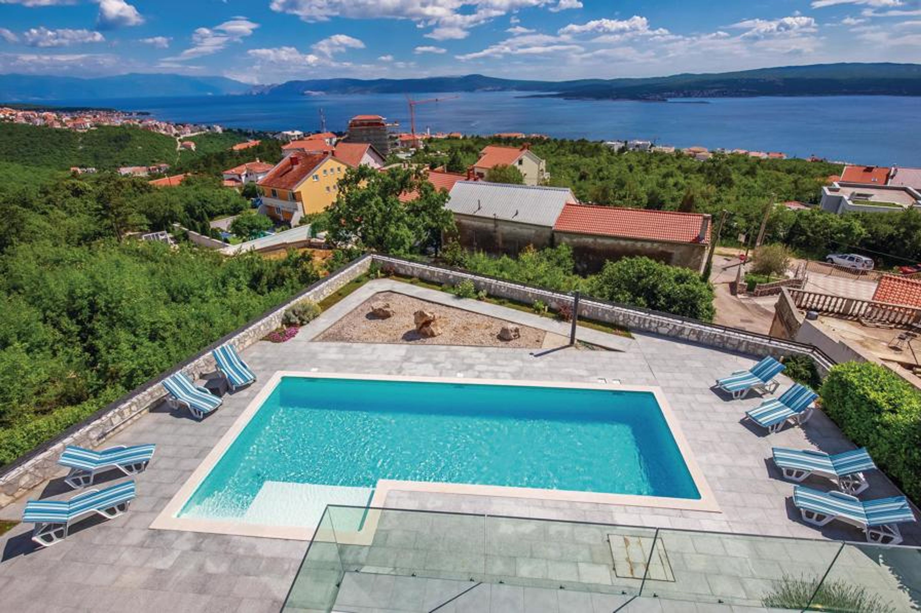 This exclusive villa is located in a quiet area of the famous town of Crikvenica, which has been known for tourism for over 120 years. Here you are offered all the possibilities for an unforgettable vacation, far from noise and hustle and bustle. The fenced property ensures peace and privacy to gain strength for new tasks. The house is very spacious and the interior reflects a successful symbiosis of elegance and modernity. On the ground floor of the house is the living room with kitchen and dining room. On the second floor are the bedrooms, as well as a passage room to the terrace. The fitness room in the basement invites to sports activities. From the living room you can access the well-kept property. Here, the outdoor pool offers welcome refreshment on hot days, which is further enhanced by the enchanting panorama of the sea and the rural surroundings. Every detail in this villa meets the high standards for an unforgettably beautiful vacation. The town of Crikvenica is rich in beautiful beaches, where young and old are offered many sporting and cultural opportunities. Especially in the summer months you can visit many events. One of the most interesting is certainly the Fish Week, where you can taste many traditional specialties. The festivities stretch along the sea coast, with a number of tourist resorts, such as Selce, Crikvenica, Dramalj and Jadranovo. The proximity of the airport on the island of Krk, the seaport of Rijeka, as well as the good road connection with Central Europe were important conditions for the early development of tourism, which has more than centuries of tradition on the territory of today's Crikvenica Riviera.