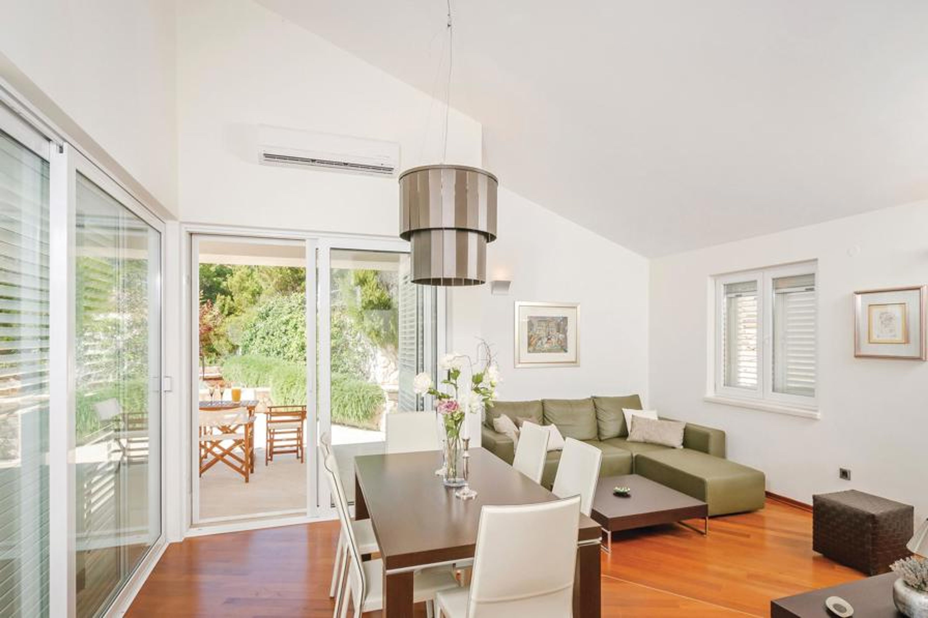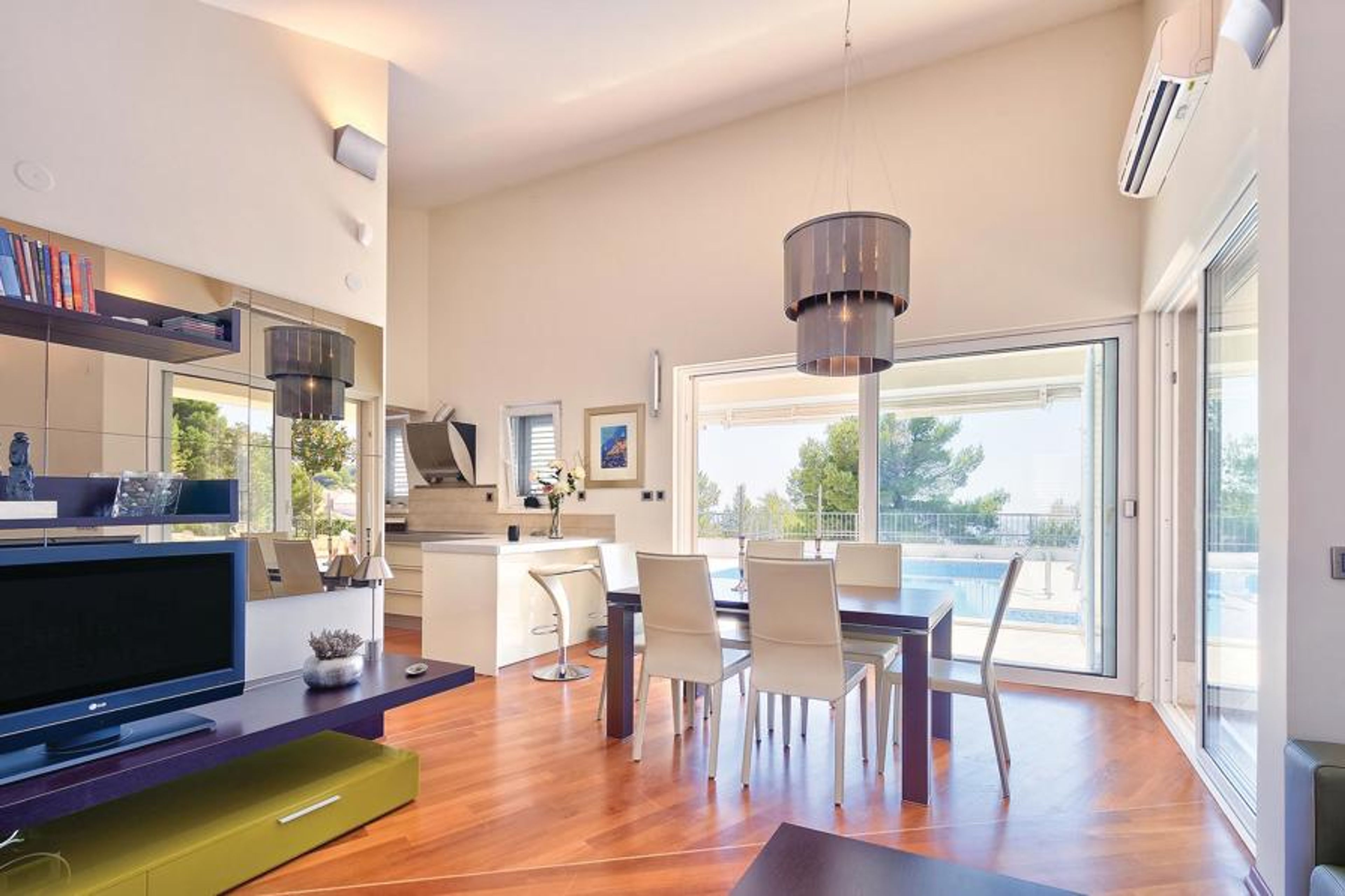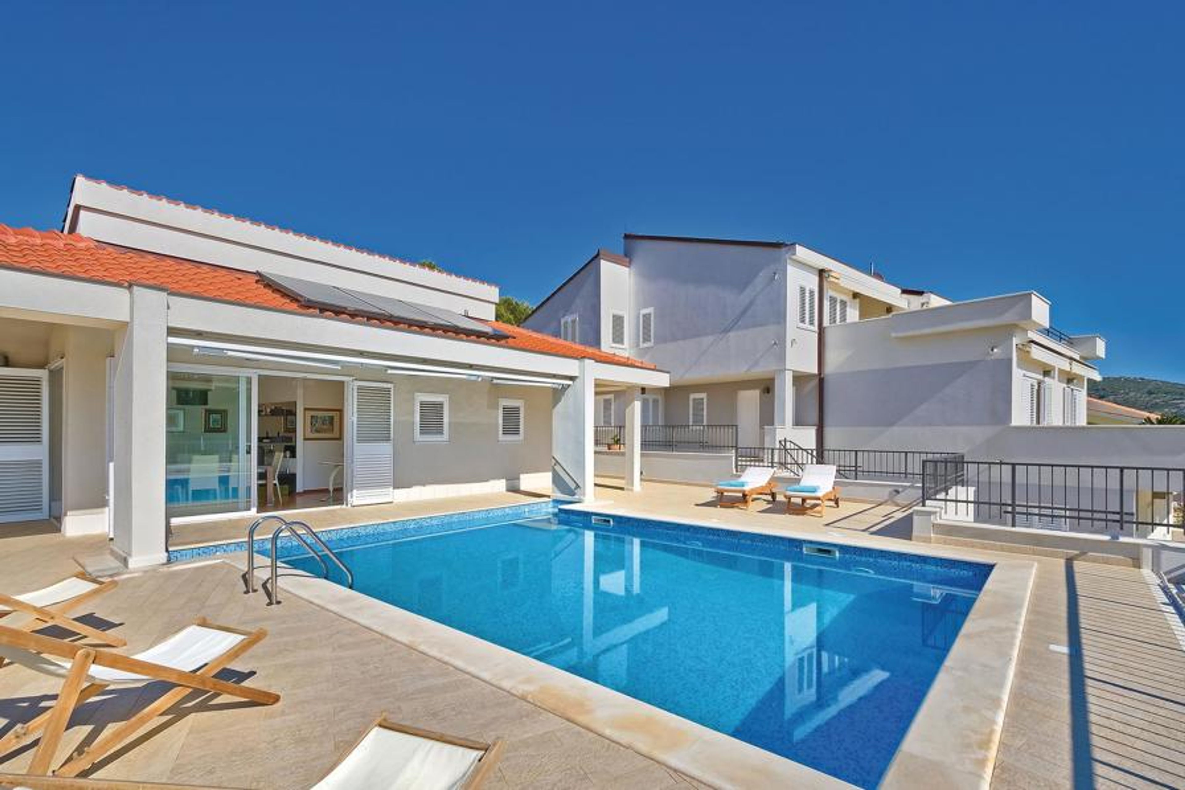 This beautiful, comfortable vacation home consists of three fully equipped apartments on two floors connected by an external staircase and a separate building with a kitchen, living room and bathroom with direct exit to the terrace with pool. Here you can relax with a unique view of the sea and the countryside. The house is ideal for a relaxing and luxurious vacation of several friendly families. The pebble beach, suitable for children, is decorated with crystal clear water. The nearby town of Primosten is one of the most beautiful destinations in the Adriatic. On the picturesque peninsula you can find authentic taverns with local specialties, discover bars near the sea and scout charming stores. Visit the cities of Sibenik, Trogir and Split or discover the natural beauty of this region, which is home to the two national parks, Krka and Kornati.