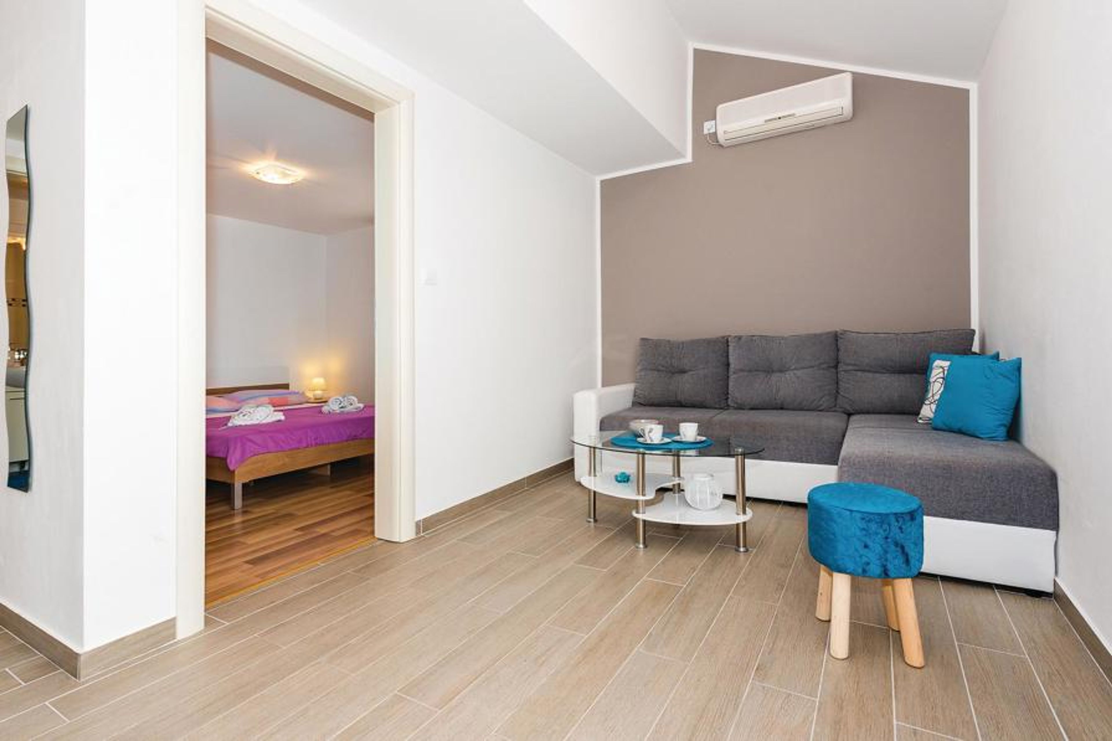 This cosy and tastefully furnished holiday apartment is located on the first floor. Dolac is not far from the popular holiday resort of Primoten. Rooms on two floors with spiral staircase, sloping roof at approx. 100 cm. The balcony offers a beautiful view of the sea and the surrounding area as well as the nearest pebble beach, which is only a few hundred metres away. A shared barbecue is available on the property. In enchanting Primoten, there are bars and restaurants serving local specialities along the promenade. The medieval town of ibenik and the Krka and Kornati national parks are also worth a visit.