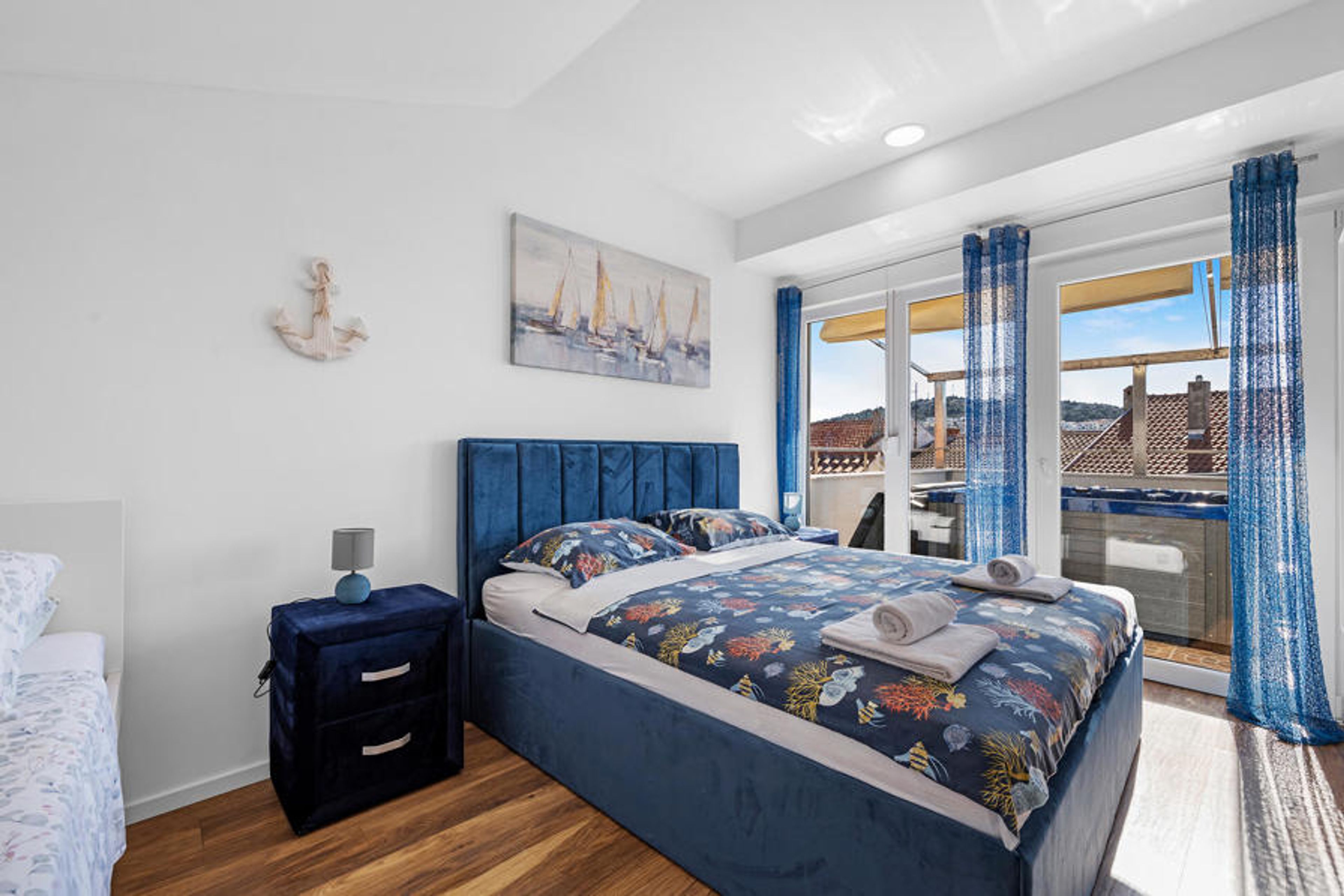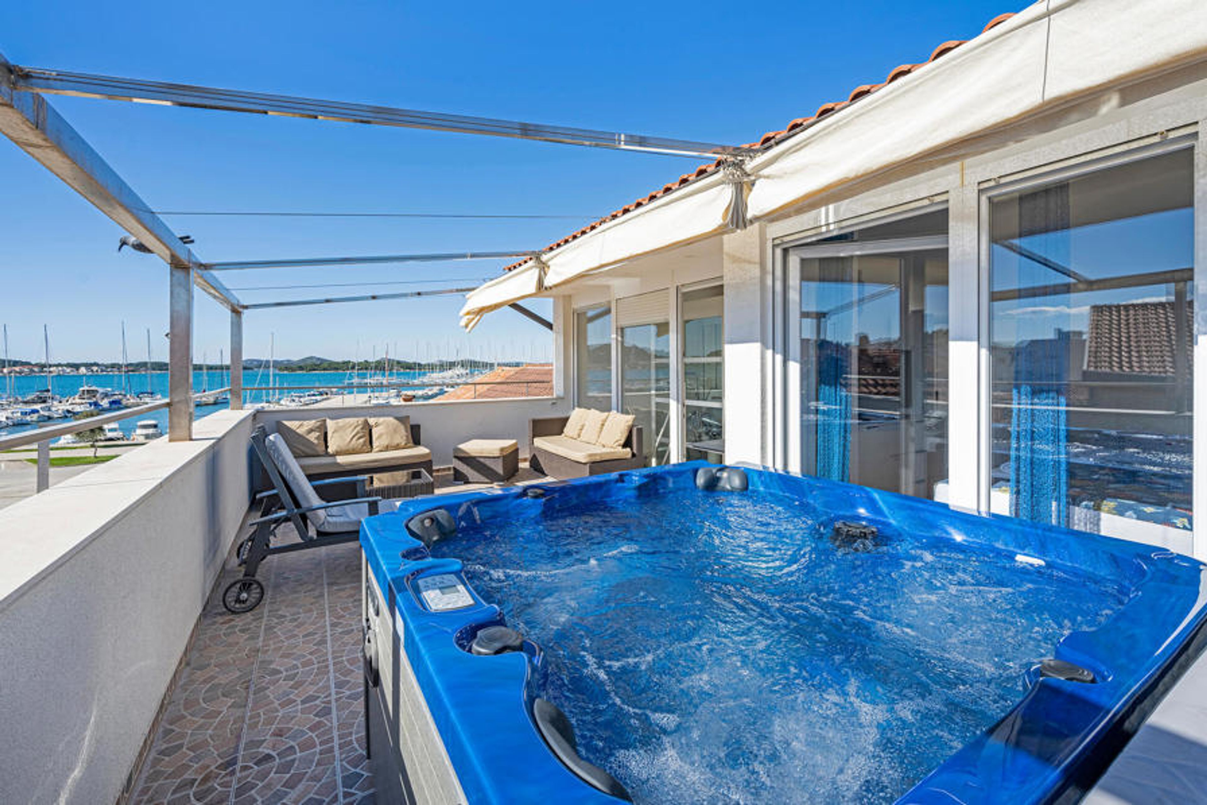 A combination of modern architecture and old walls awaits you in this tastefully furnished vacation home, located directly by the sea in the village of Murter. The island of the same name is connected to the mainland by a bridge. The semi-detached house extends over three floors, which are connected by interior stairs and an elevator. Thus, the domicile is suitable for guests with disabilities, with the exception of two bedrooms and one bathroom. Enjoy the view of the sea and the city on the spacious roof terrace with Jacuzzi. The island is known for its beautiful beaches and its proximity to the Kornati National Park. Taste traditional specialties in the island's restaurants and konobas and experience the charm and flair of Dalmatia.