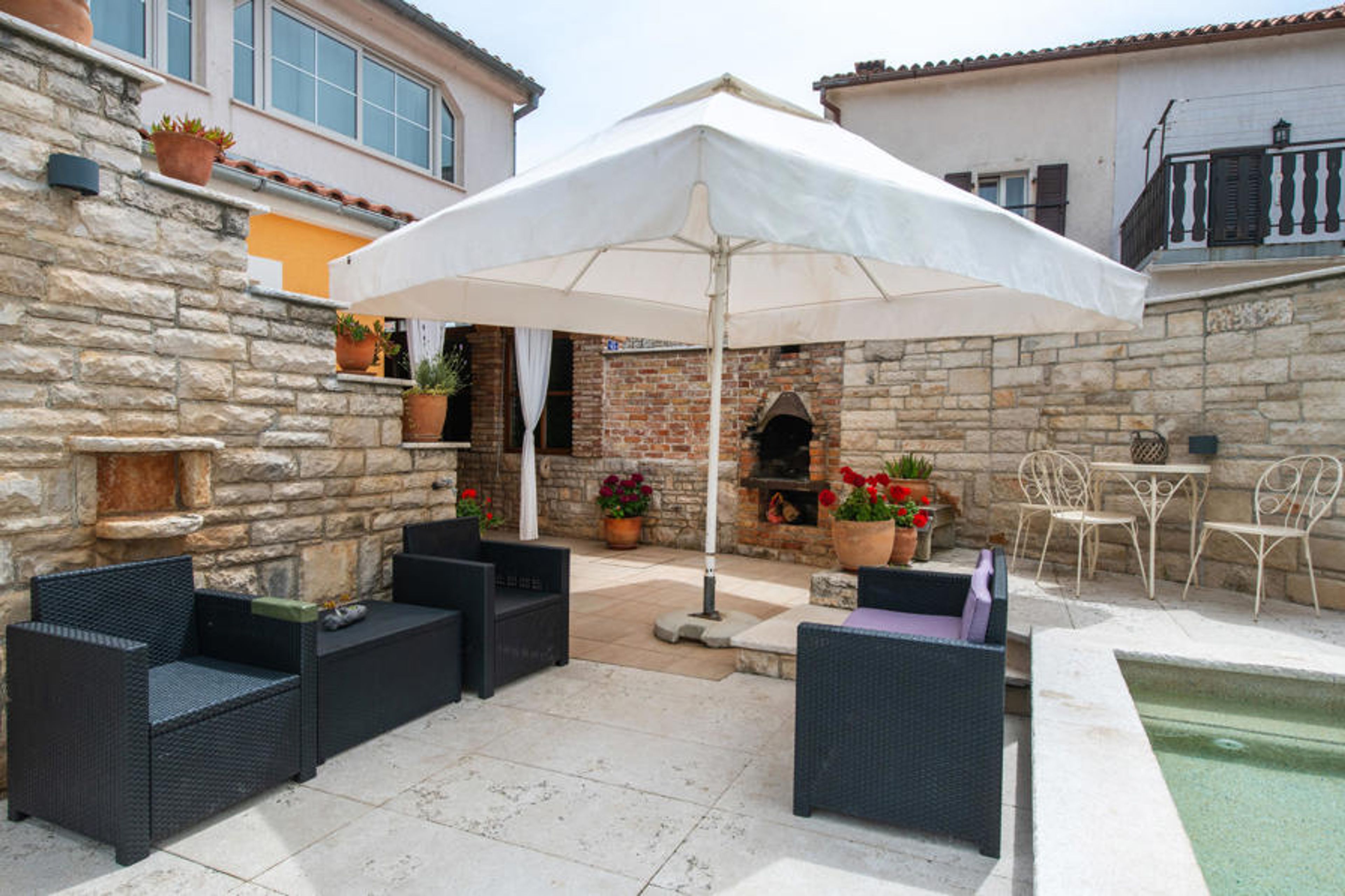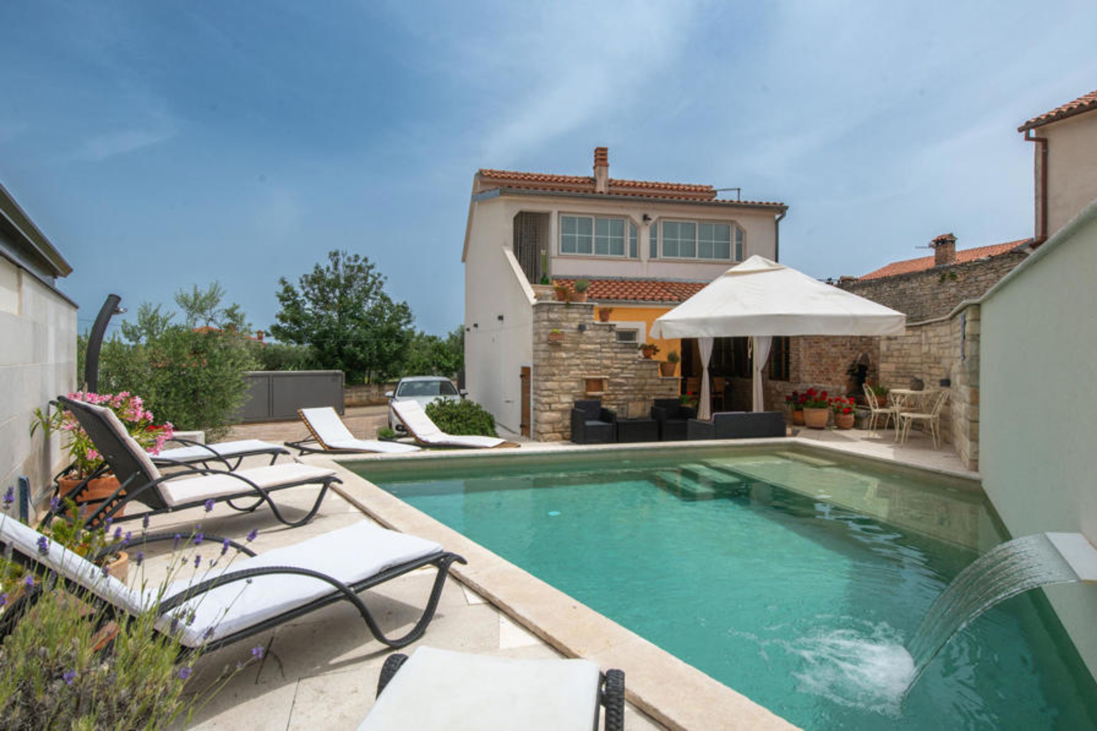 This two-storey house with pool is situated on the east coast of Istria in the small village Kavran. The two floors are connected via external stairs.