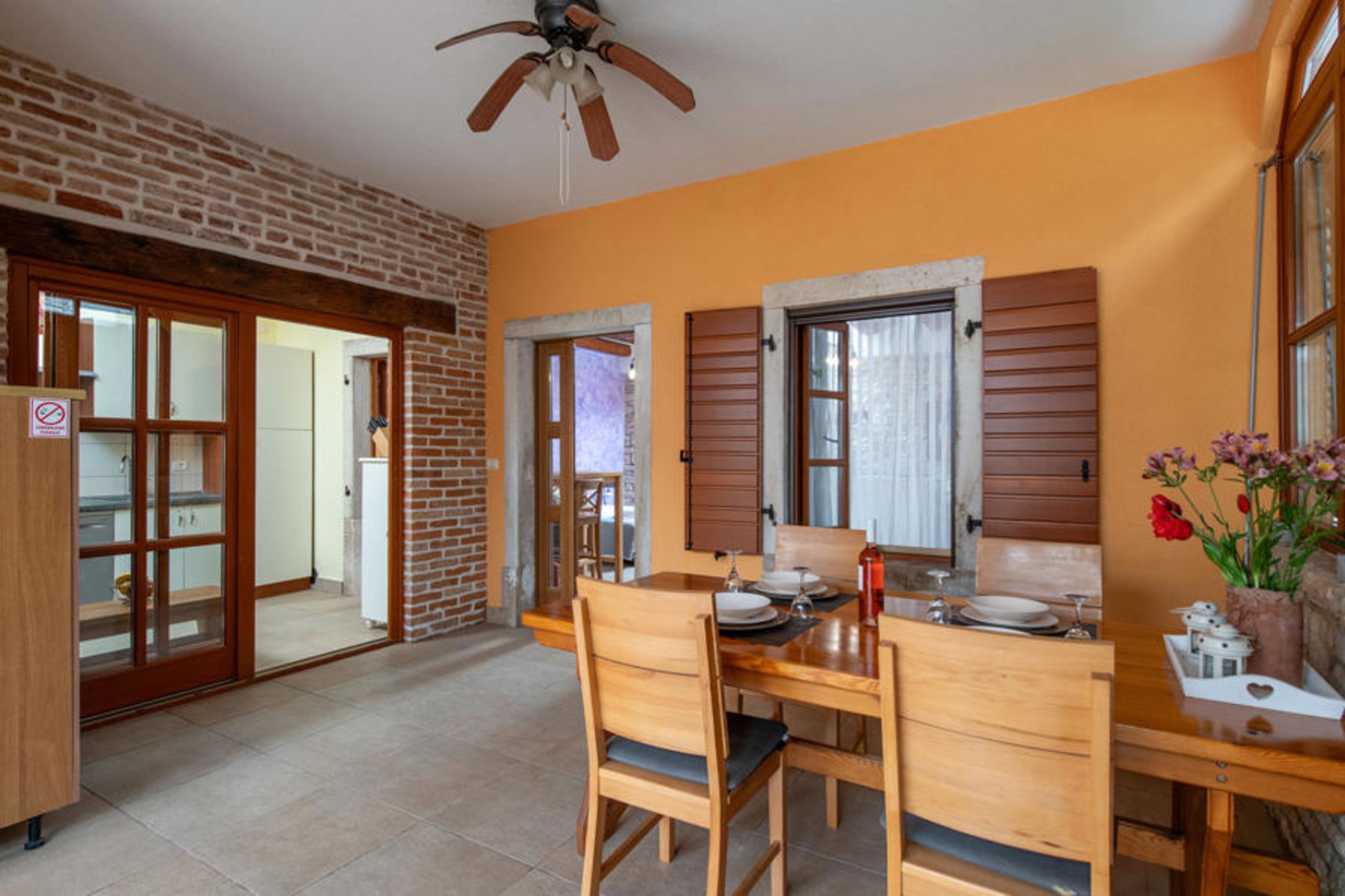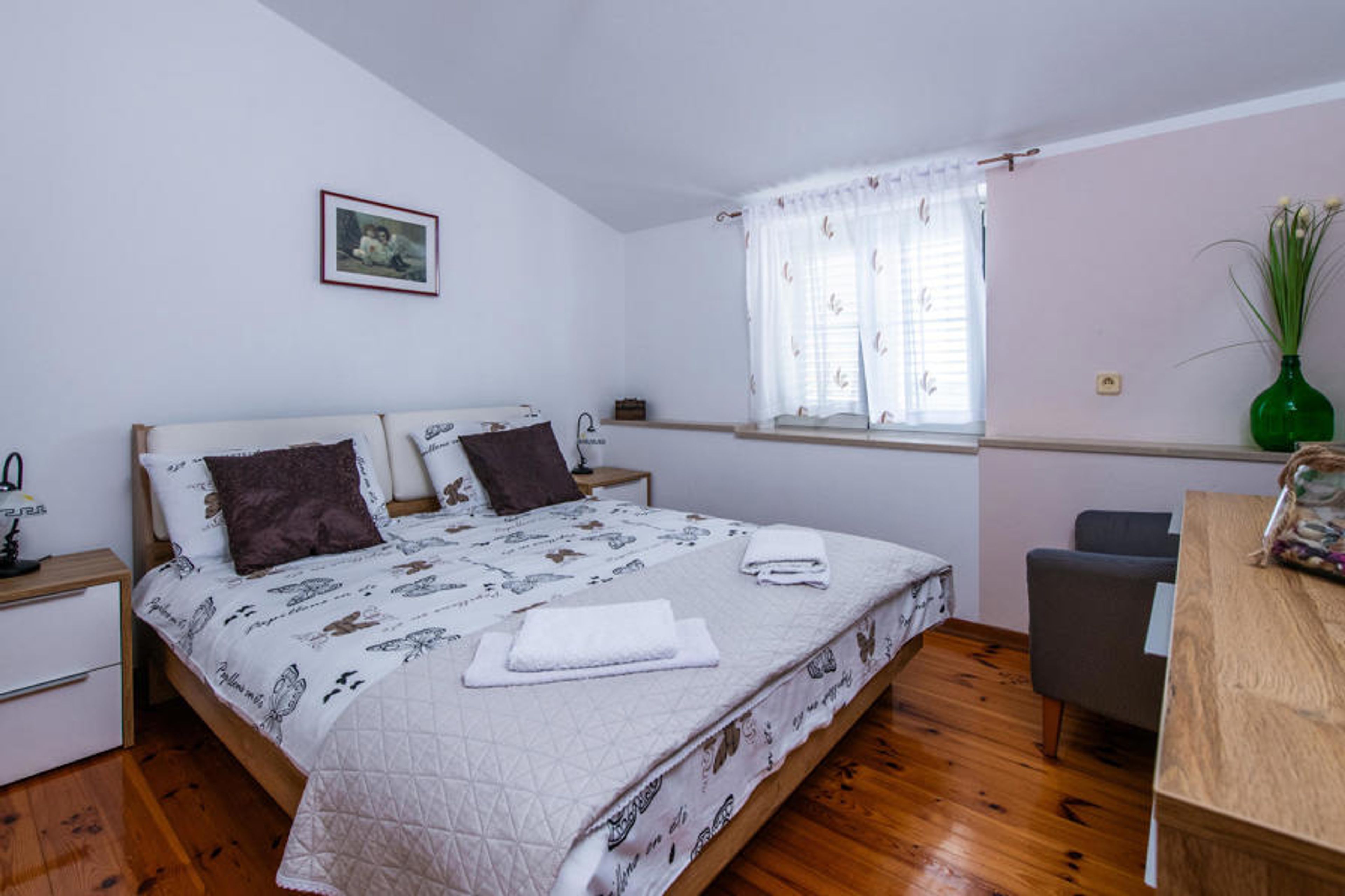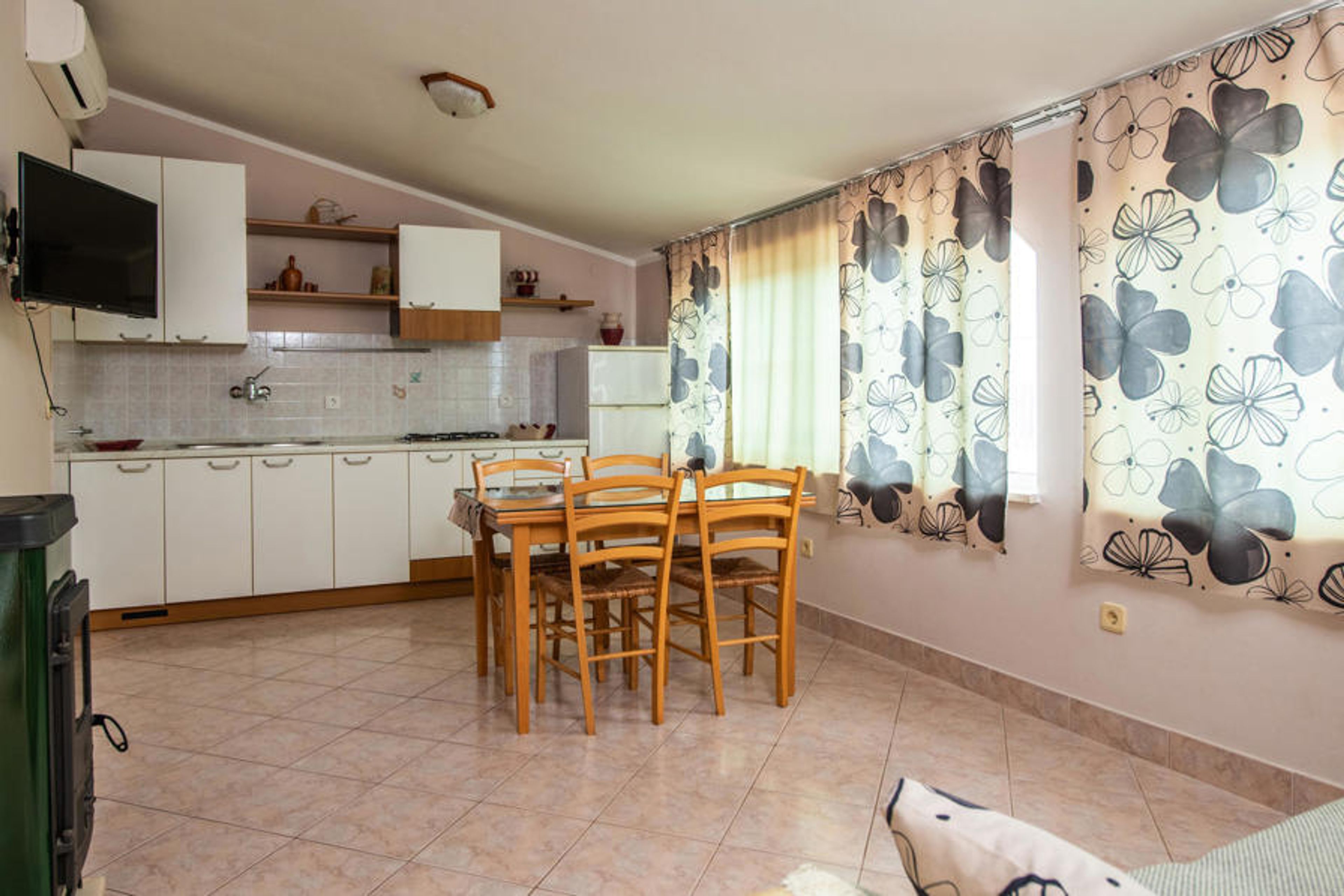 On the east coast of Istria in the small village of Kavran is located this two-storey vacation home with only outside stairs. On the second floor are two bedrooms, each with a bathroom, kitchen, dining and living room for socializing. On the ground floor there is another bedroom with bathroom and the fully equipped kitchen, with exit to a beautiful covered terrace and barbecue. Here you can really enjoy the evening hours. Nearby is Duga Uvala, where you can also use wellness offers. The vacation property is ideal for nature lovers who prefer tranquility and avoid mass tourism.