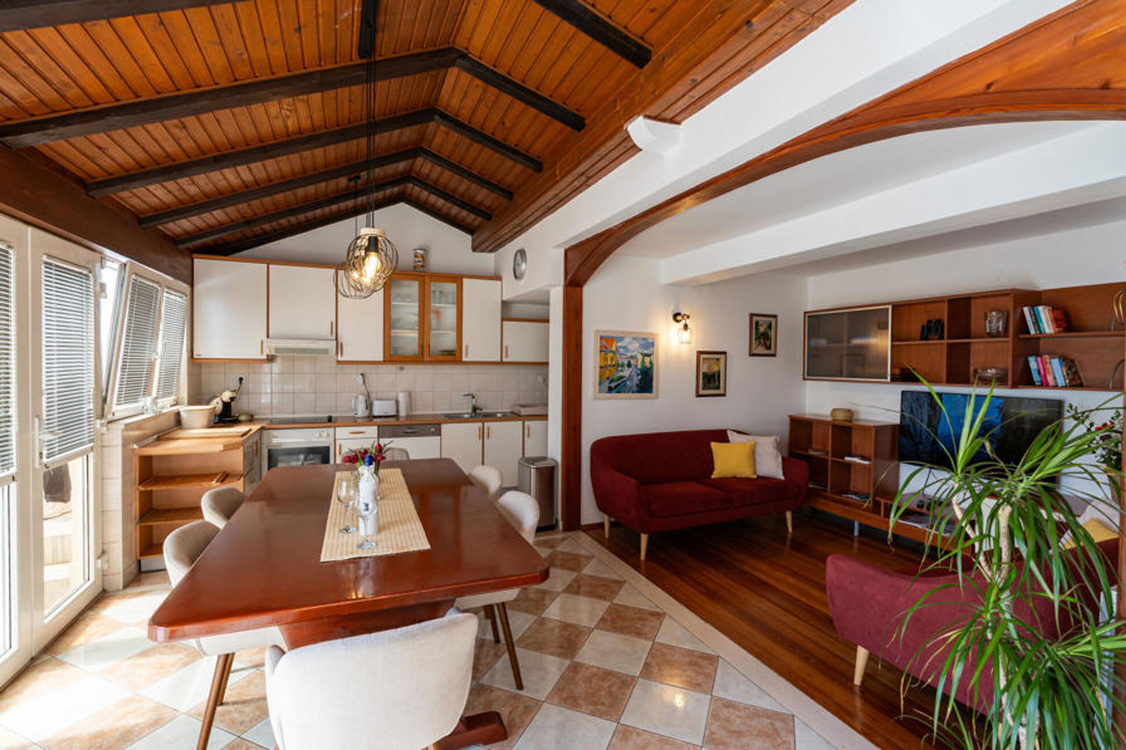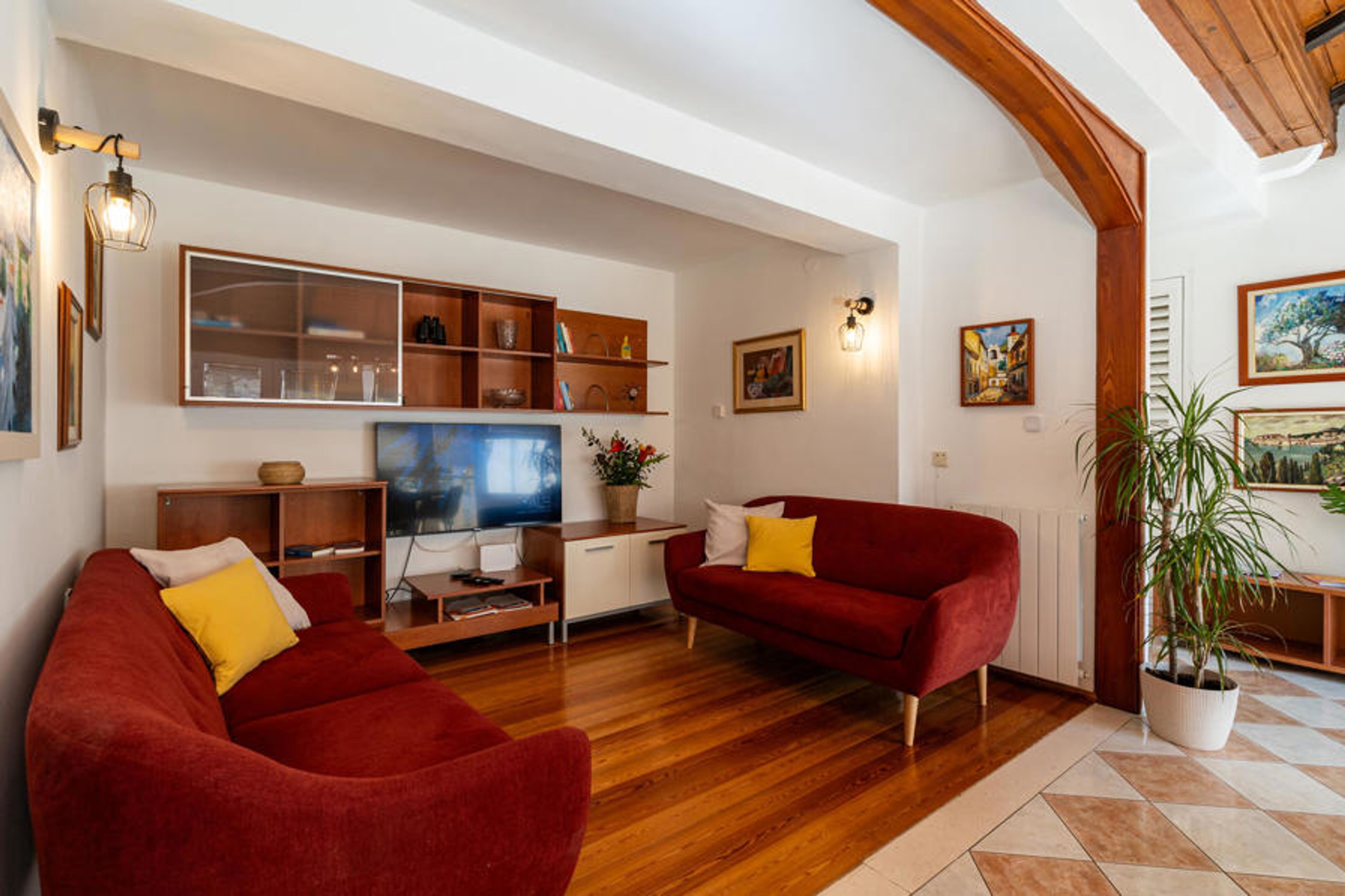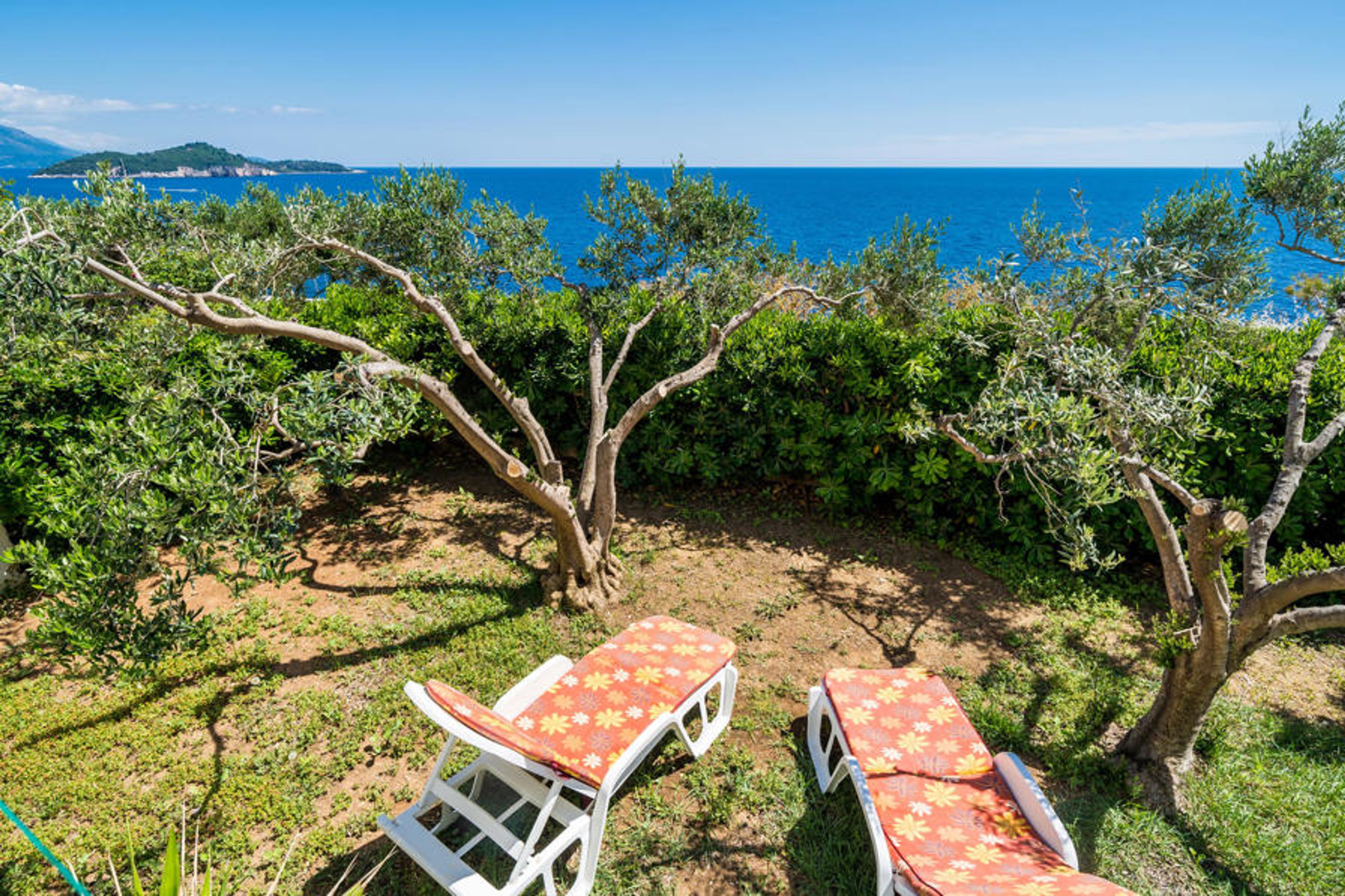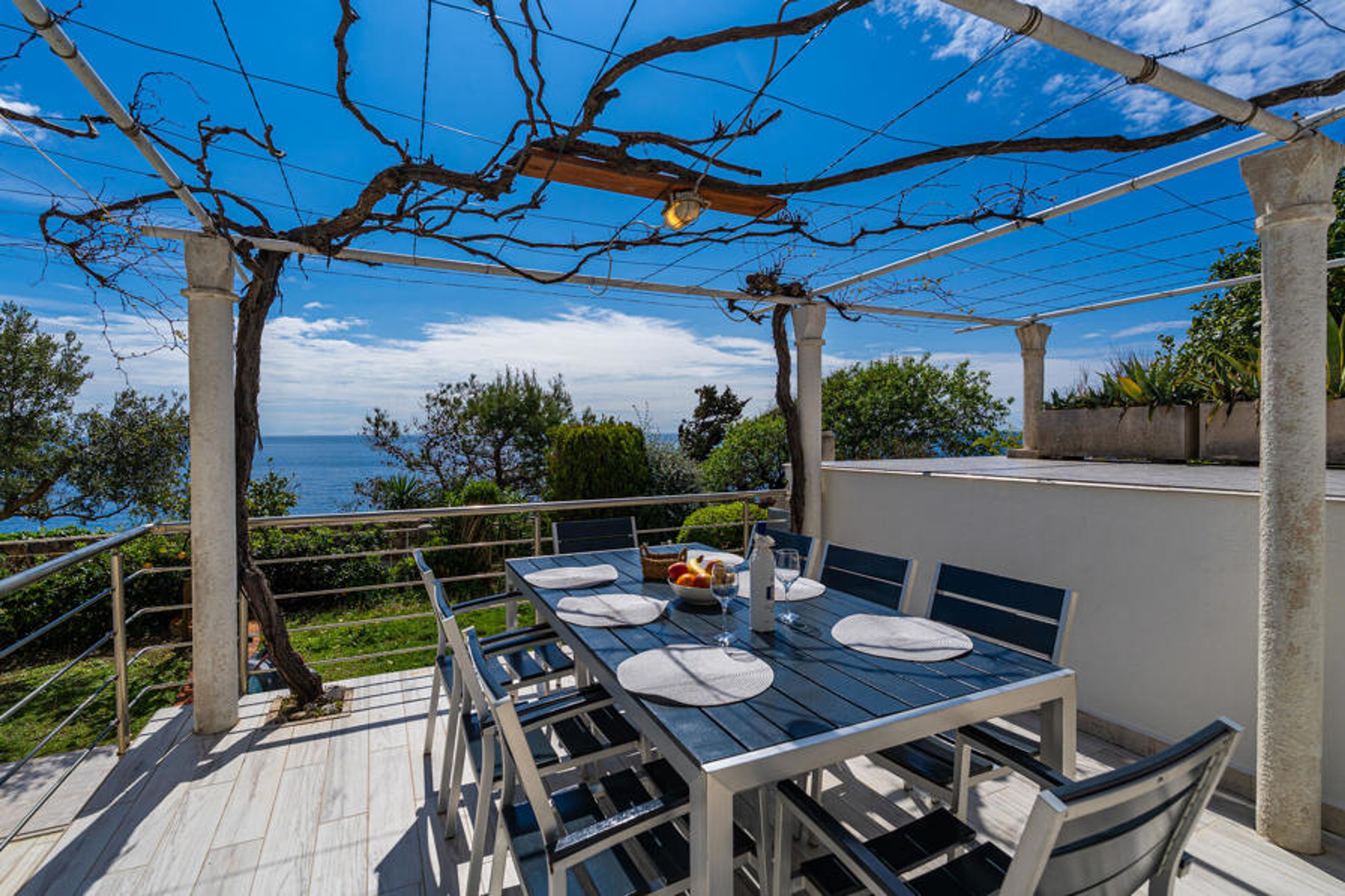 Spacious four bedroom vacation apartment on the first floor of a small residential building, first row to the sea and with panoramic views. It is ideal for a larger family with children. You live just a few minutes walk from the beautiful rocky beach, which is located below the house. On the terrace with vines, quality garden furniture and in the beautiful garden with a shower and barbecue, you will definitely be able to relax. The interior is equipped with many appliances that you might need on vacation. You can reach the medieval old town after a 15-minute walk along the coast.