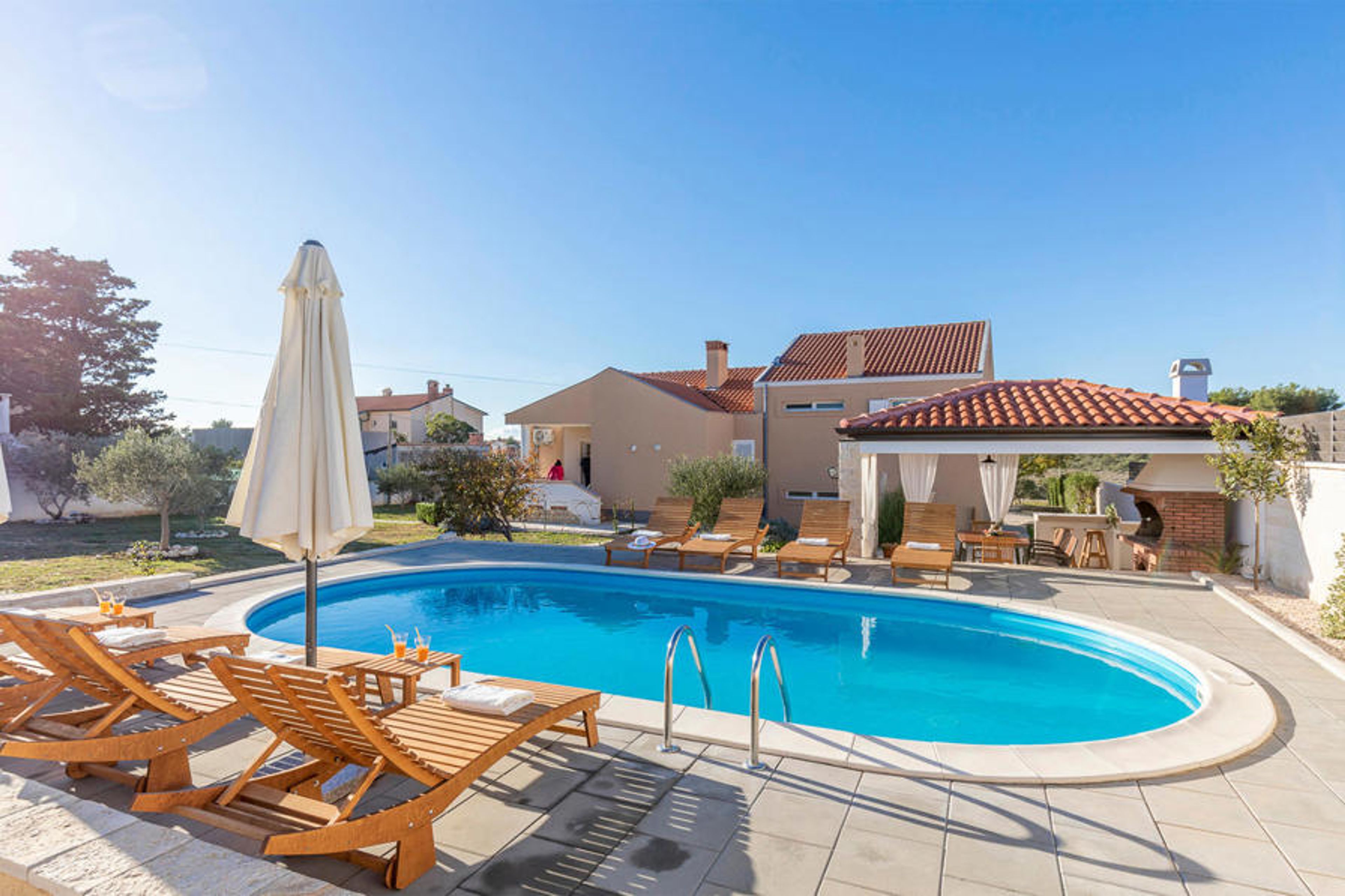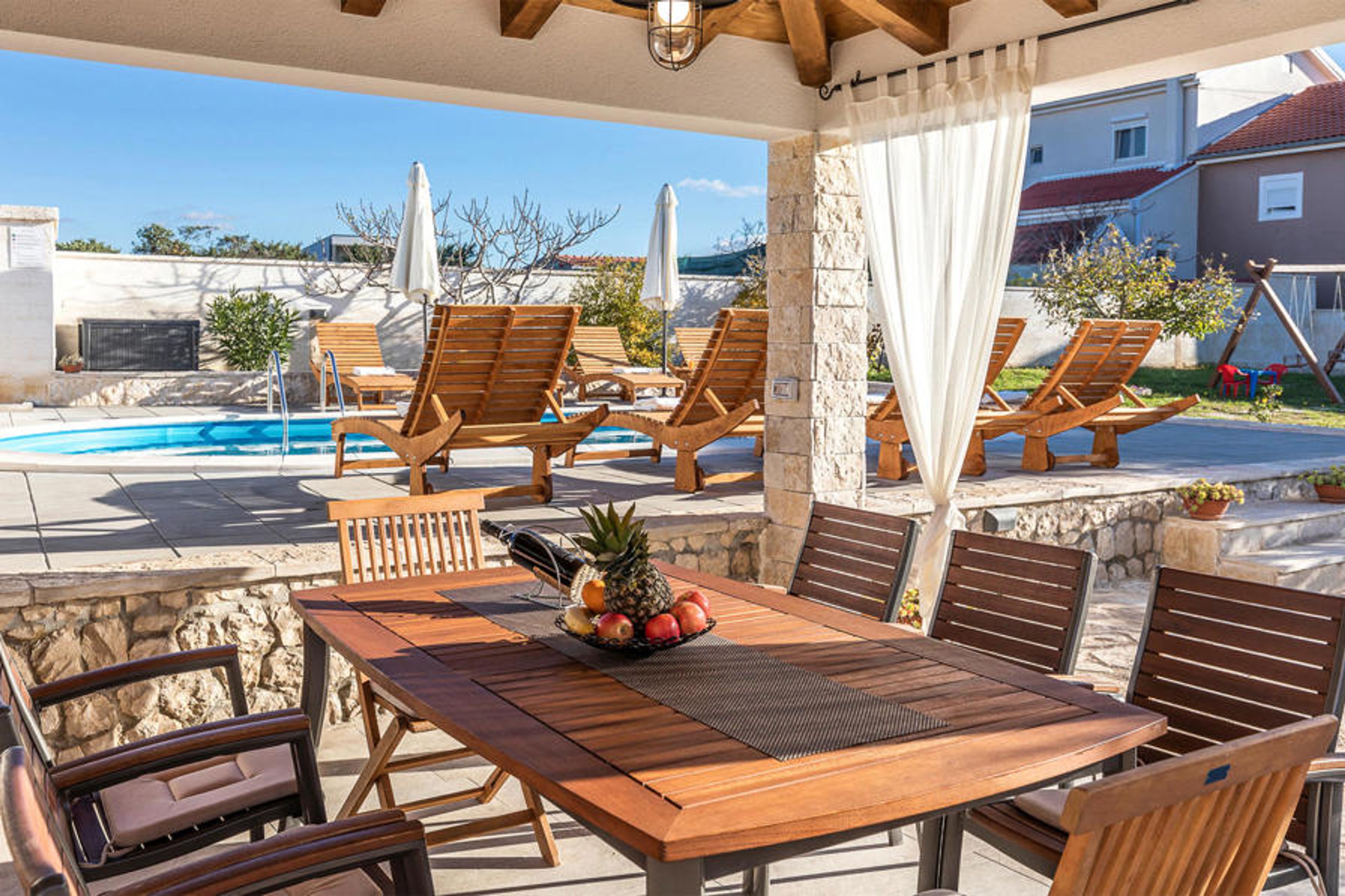 This spacious vacation home on several levels and then also with indoor and outdoor connections is located on a private estate in the village of Vrsi-Mulo. There are 2,000 m² of land at your disposal. The pool is located in the back of the house and is just for you. There is a large open and a covered terrace and a balcony with exit from one bedroom. The owner lives in a small annex on the property. Visit numerous sandy beaches in the neighboring villages of Zukve and Zdrijac in the direction of Nin. Also visit the city of Zadar with numerous cultural and historical sights.
