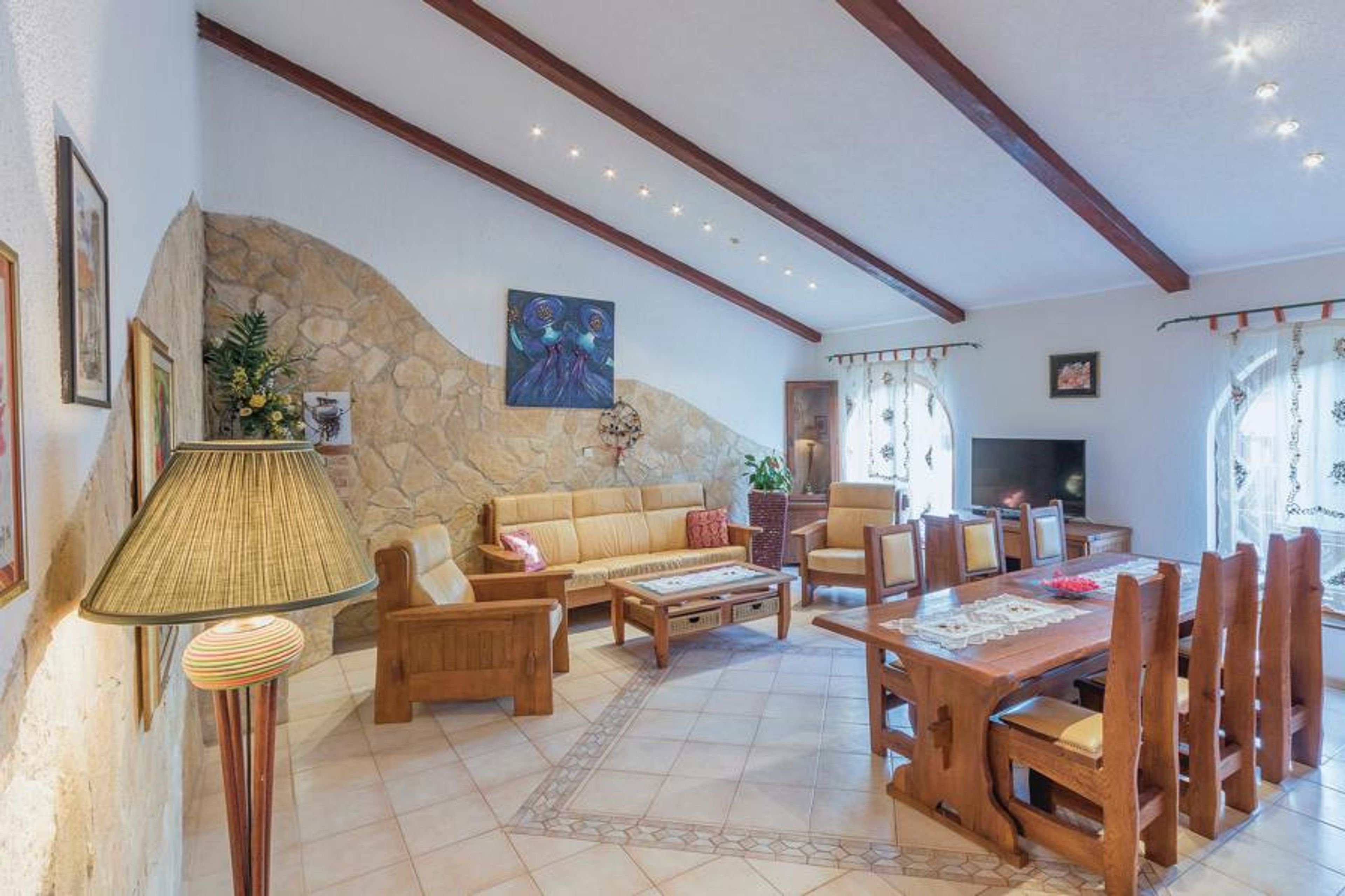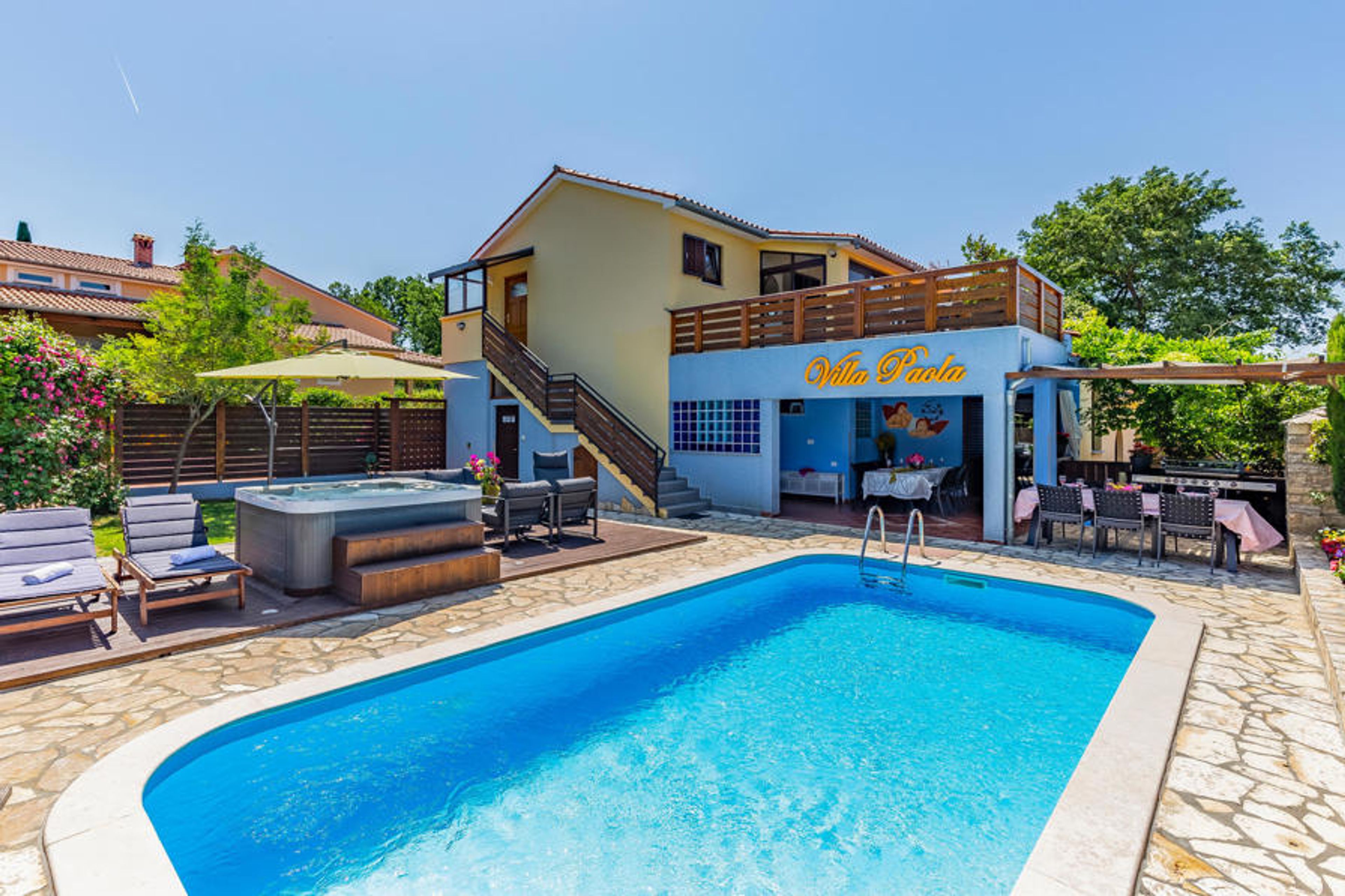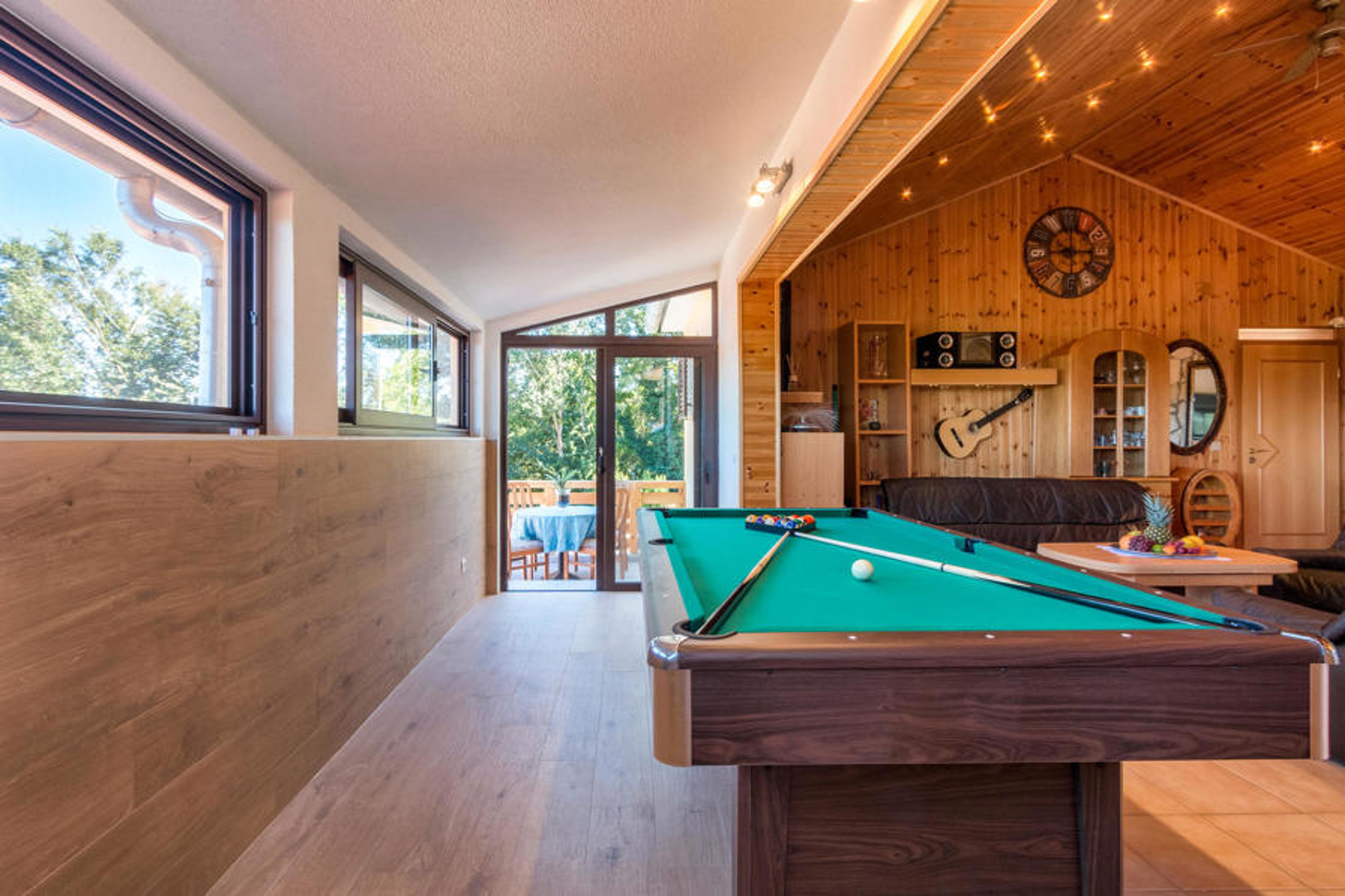 This beautiful and comfortable vacation home with pool and jacuzzi for six people is located in Loborika near Pula, surrounded by nature. Here you can spend a relaxing vacation. The interior of the house is divided into two floors, which are connected by an external staircase. On the first floor there are four bedrooms and four bathrooms, one of which has an outside entrance. Also, a large living room, dining room and kitchen with access to the covered terrace are located on the first floor. On the second floor there are two more bedrooms that share a bathroom, a kitchenette and a large living area where there is a pool table. The courtyard with pool is beautifully landscaped with lots of flowers. Relax in the large jacuzzi. The large covered terrace is ideal for dining and socializing on summer days.