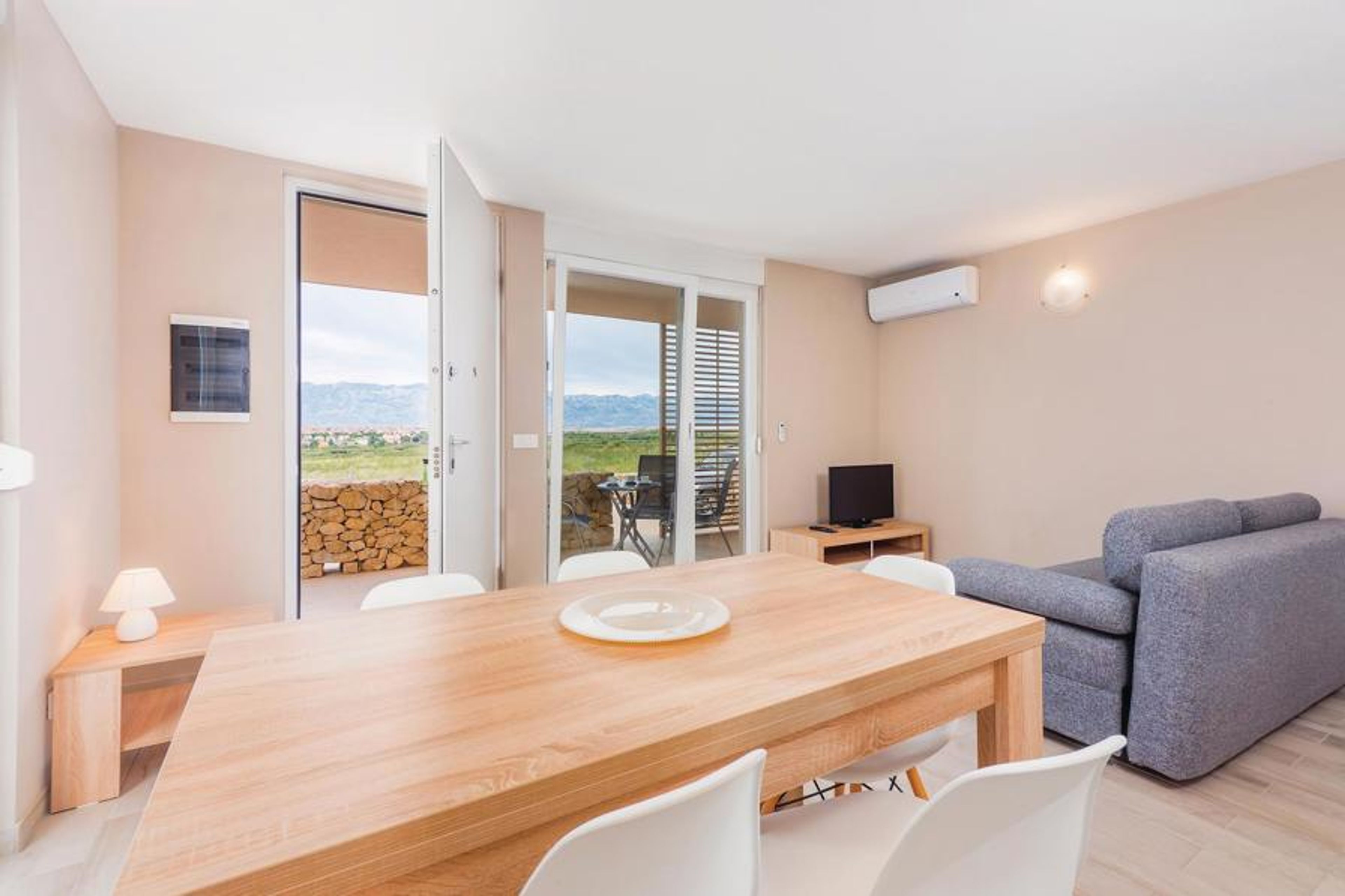 In a beautiful location, outside Povljana and with a magnificent view of the sea and the countryside, are these contemporary apartment houses with a shared pool and additional amenities. Each apartment house consists of several well-equipped apartments. The island of Pag is connected to the mainland by a bridge and is full of beautiful pebble and sandy beaches, excellent restaurants, entertainment especially for young people, natural beauty and cycling paths. Taste traditional dishes, such as the widely known Pag cheese and the excellent roast lamb. A visit to the old town of Zadar is also recommended. On the promenade, the sound of the sea is transformed into sounds by the sea organ, and towards the west, a carpet of lights accompanies the sunset. On the last kilometer the path consists of gravel.