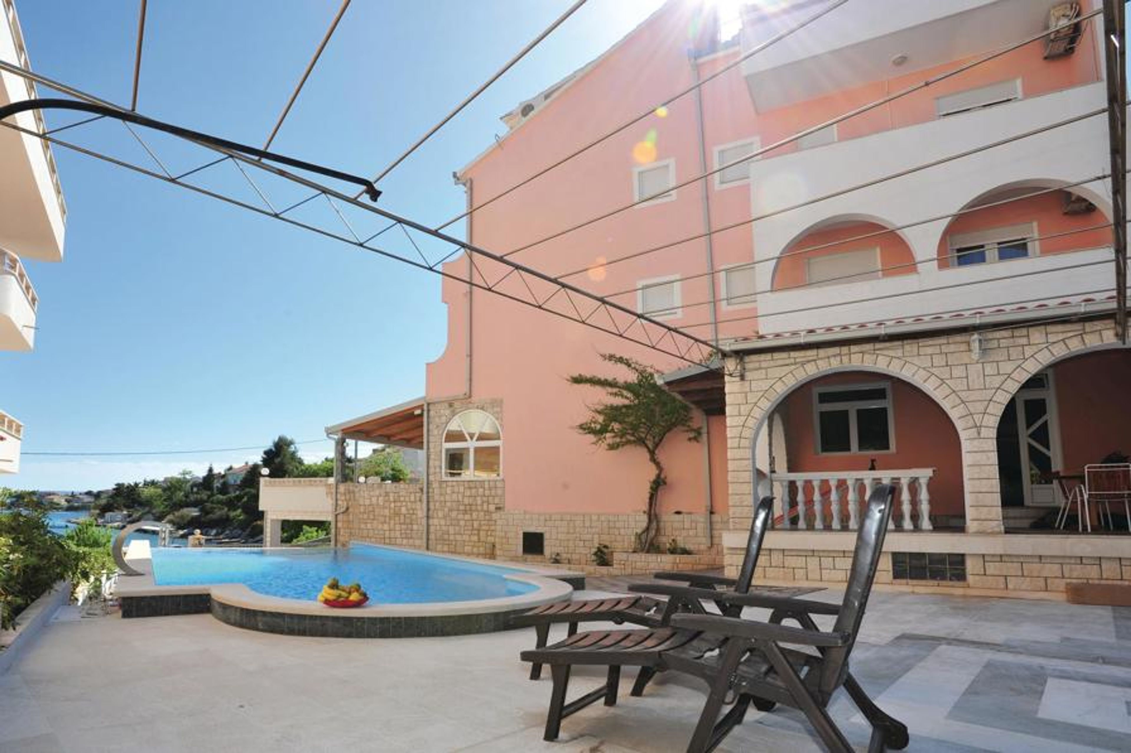 On the island of Ciovo and right on the pebble beach is this very comfortable and large vacation home with swimming pool. From the house you have a great panoramic view of the sea, which you will surely enjoy from the terraces. On the first floor are the large professional kitchen, the comfortable living and dining area and the large terrace. On the floors there are a total of eight bedrooms with private bathrooms. In the hot summer days, the pool provides welcome refreshment with great sea views. In the village of Okrug Gornji there are numerous bathing beaches. Thanks to the bridge you can quickly reach the mainland and the historic town of Trogir with numerous cultural monuments, as well as a rich leisure and entertainment program.