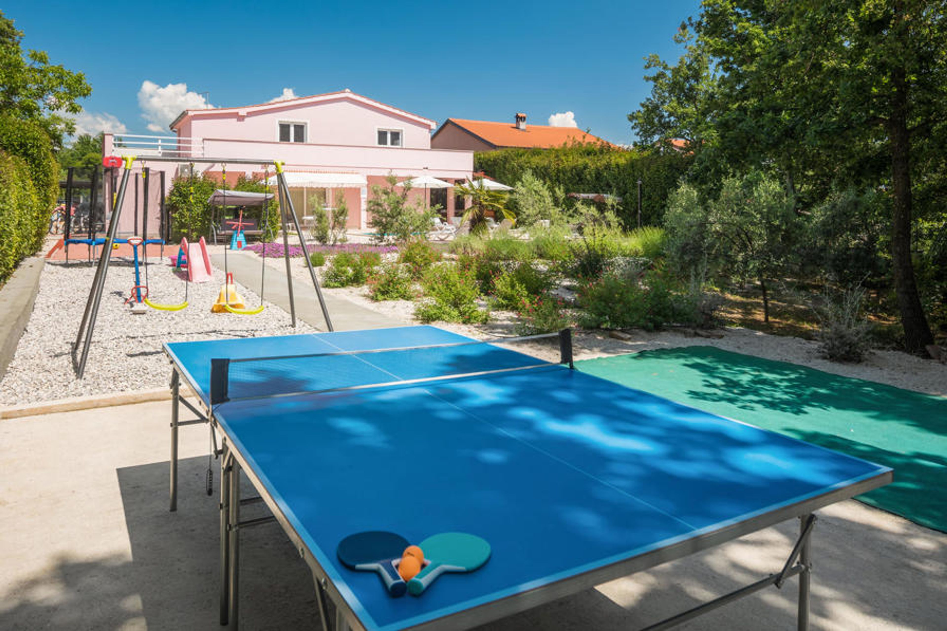 This modern ground level vacation home with private swimming pool is located in the quiet village of Kadumi, near Porec. With the 5 bedrooms and 4 bathrooms, a spacious living room with dining area and the kitchen, it offers enough comfort for a relaxing vacation. In front of the house, in the fenced garden, there is a children's playground and behind the house, in the middle of the greenery, you will find the swimming pool, sunbeds and the parasol, as well as a terrace with garden furniture. In the village itself is a konoba 'Kazeta', which is known for its good traditional Istrian cuisine. A few kilometers away is Porec. There you will find beautiful bathing beaches (e.g. Plava Laguna - the blue lagoon) as well as a lot of entertainment, let yourself be inspired by the cultural sights. The most famous sight of Porec is the Euphrasius Basilica. Active vacationers have bicycles at their disposal and an activity room with billiards, darts, table football and game table.