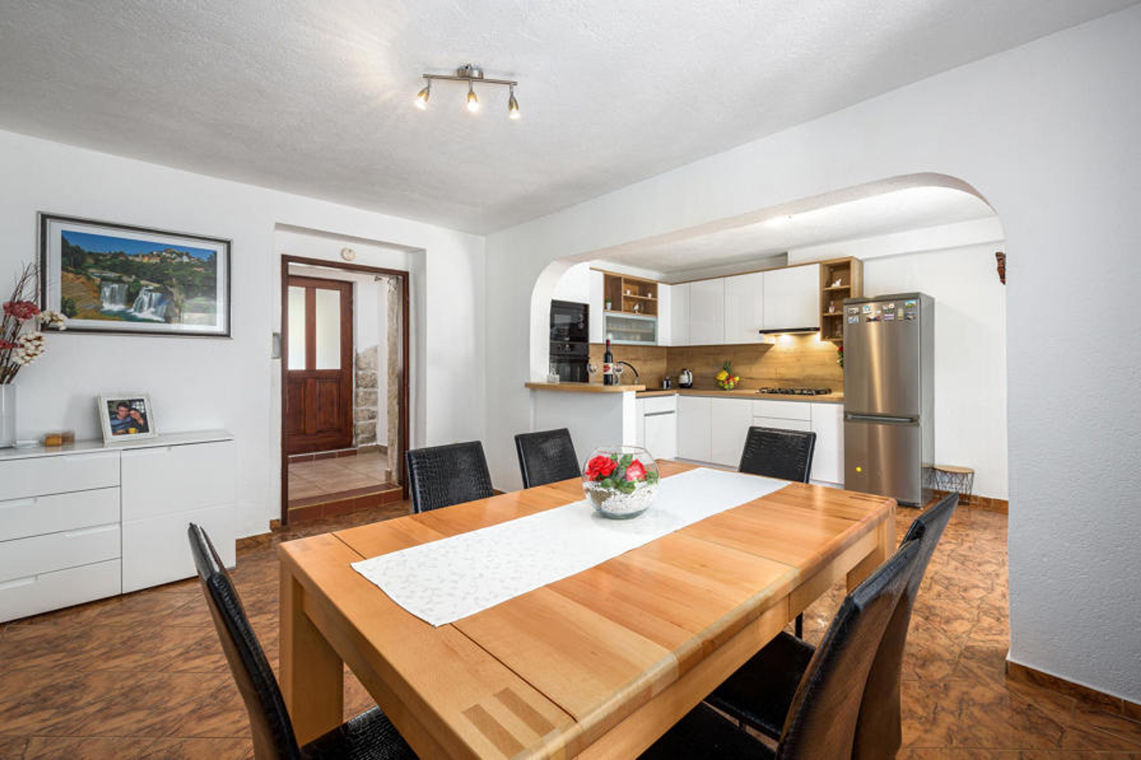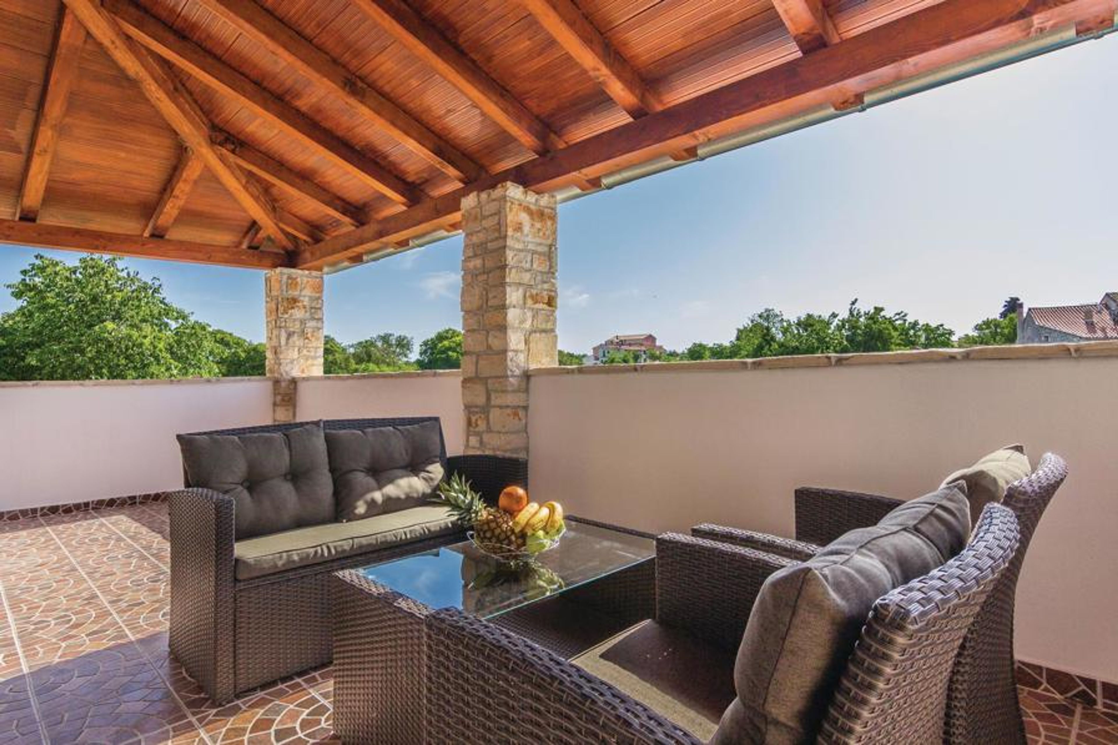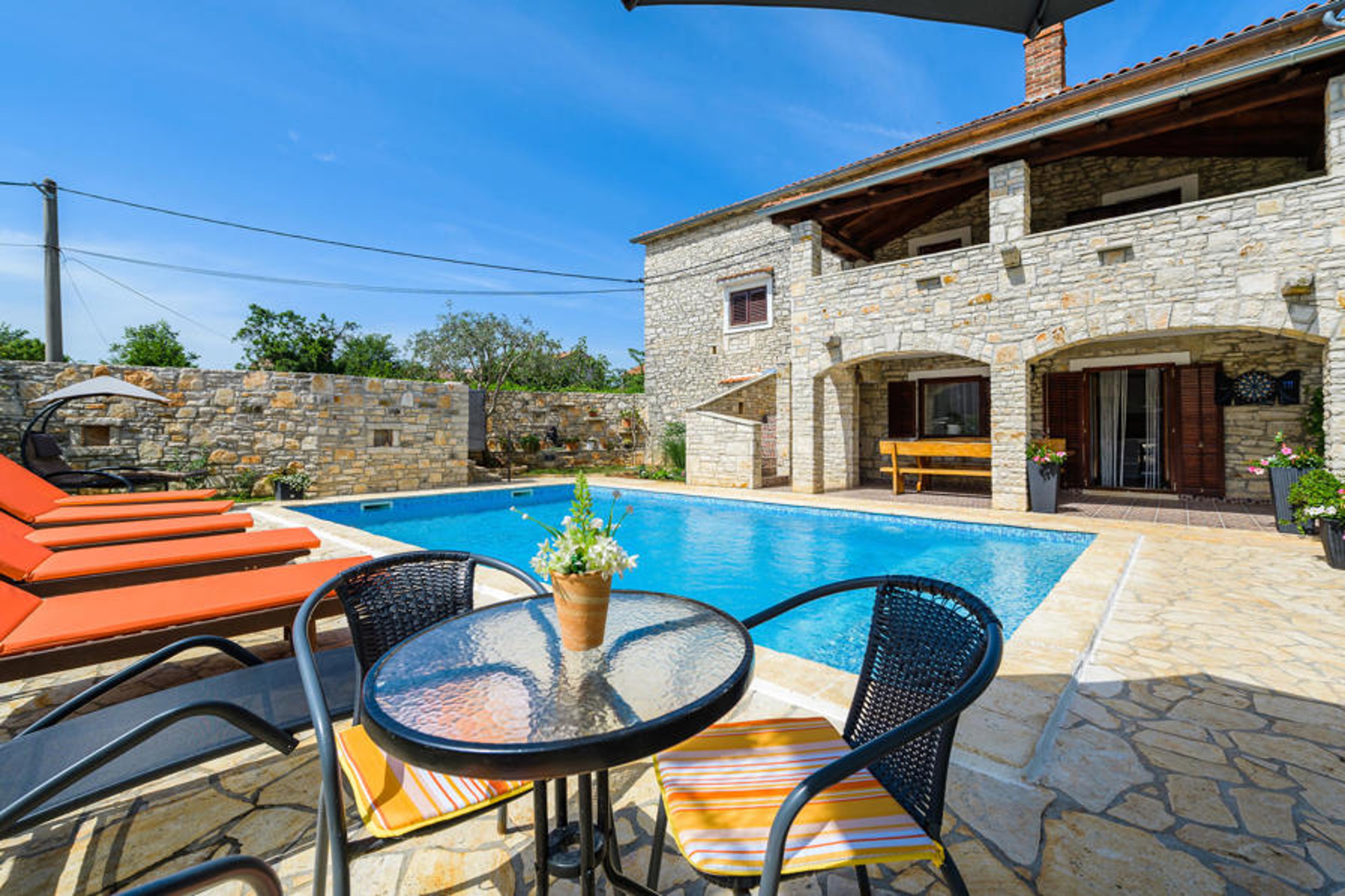 This traditional holiday home with pool has been renovated and modernised. It is located in the small village of abrunii, about 8 km from Vodnjan and 17 km from Pula. They have ground floor, 1st and 2nd floor. Minimum ceiling height in the attic is 150 cm. On the ground floor are the living room with kitchen and dining area, while external stairs lead to the upper floors. Bedroom no. 1 on the first floor has its own separate entrance. The house has several terraces and two garden areas. In the small part, in front of the house, there is an outdoor fireplace, the pool and the sun terrace are in the backyard.
