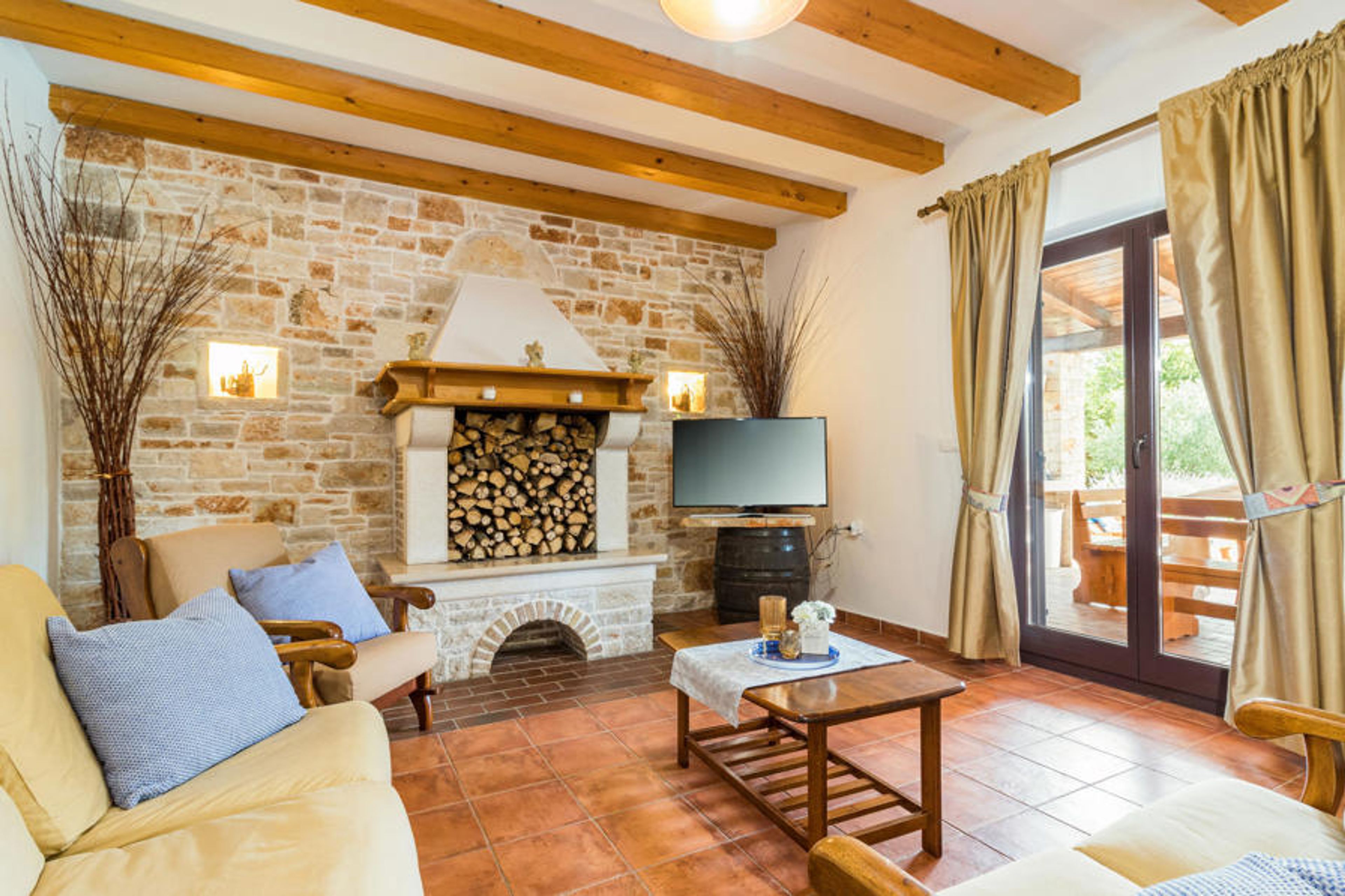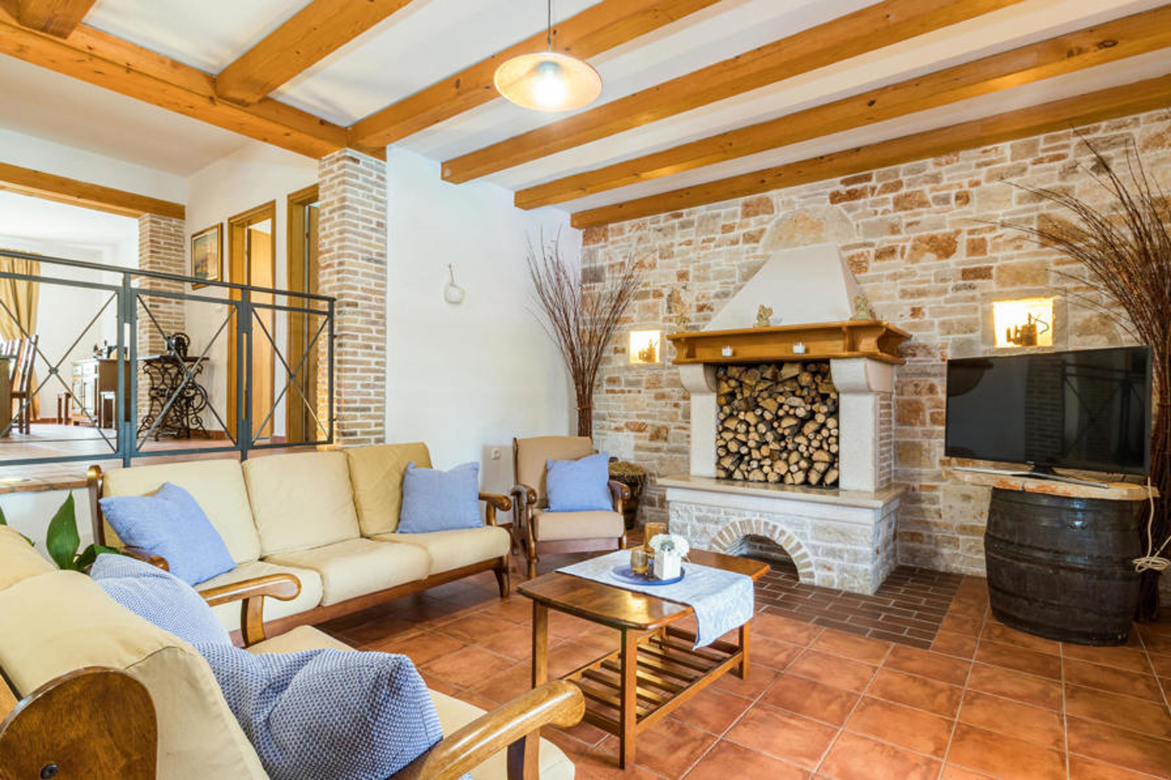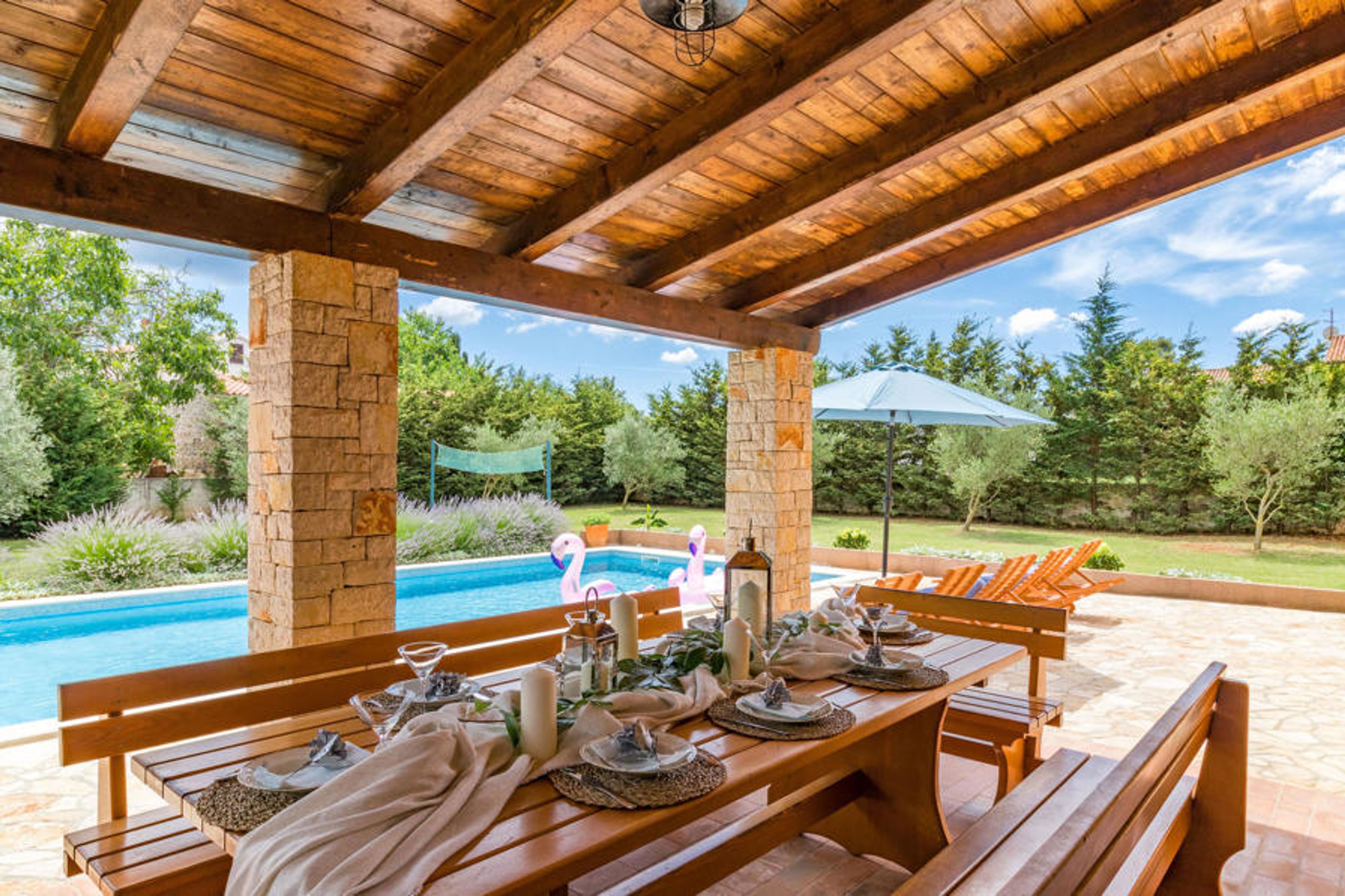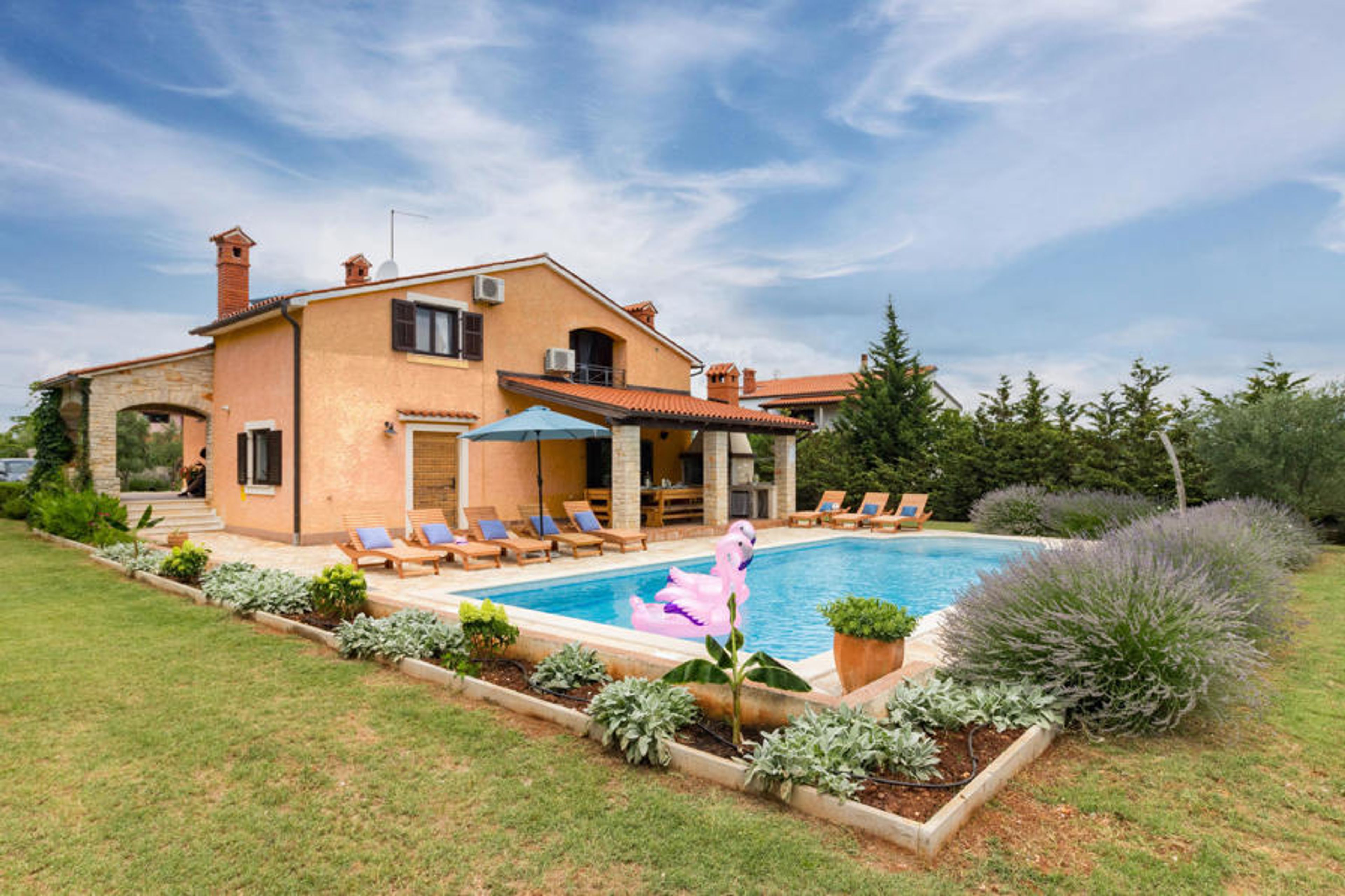 In the small Istrian village near the city of Pula is located the beautiful vacation home. The object was built very comfortable and with focus on quality. In the interior modern elements were combined with rustic ones. The large property is dominated by the beautiful outdoor pool and Mediterranean plants. The first floor, with large open living area and the fireplace in the middle of the room, will be the most visited part of the house, along with the kitchen and dining room. All bedrooms have air conditioning. The minimum ceiling height is 137 cm. At the wonderful outdoor pool you can sunbathe or play with your children and on the covered terrace a stone fireplace, sink and refrigerator are available. Visit the city of Pula and its sights, such as the amphitheater and the Temple of Augustus, or the Brijuni National Park, which is of historical importance for this area. The local restaurants and bars are known for their culinary specialties.