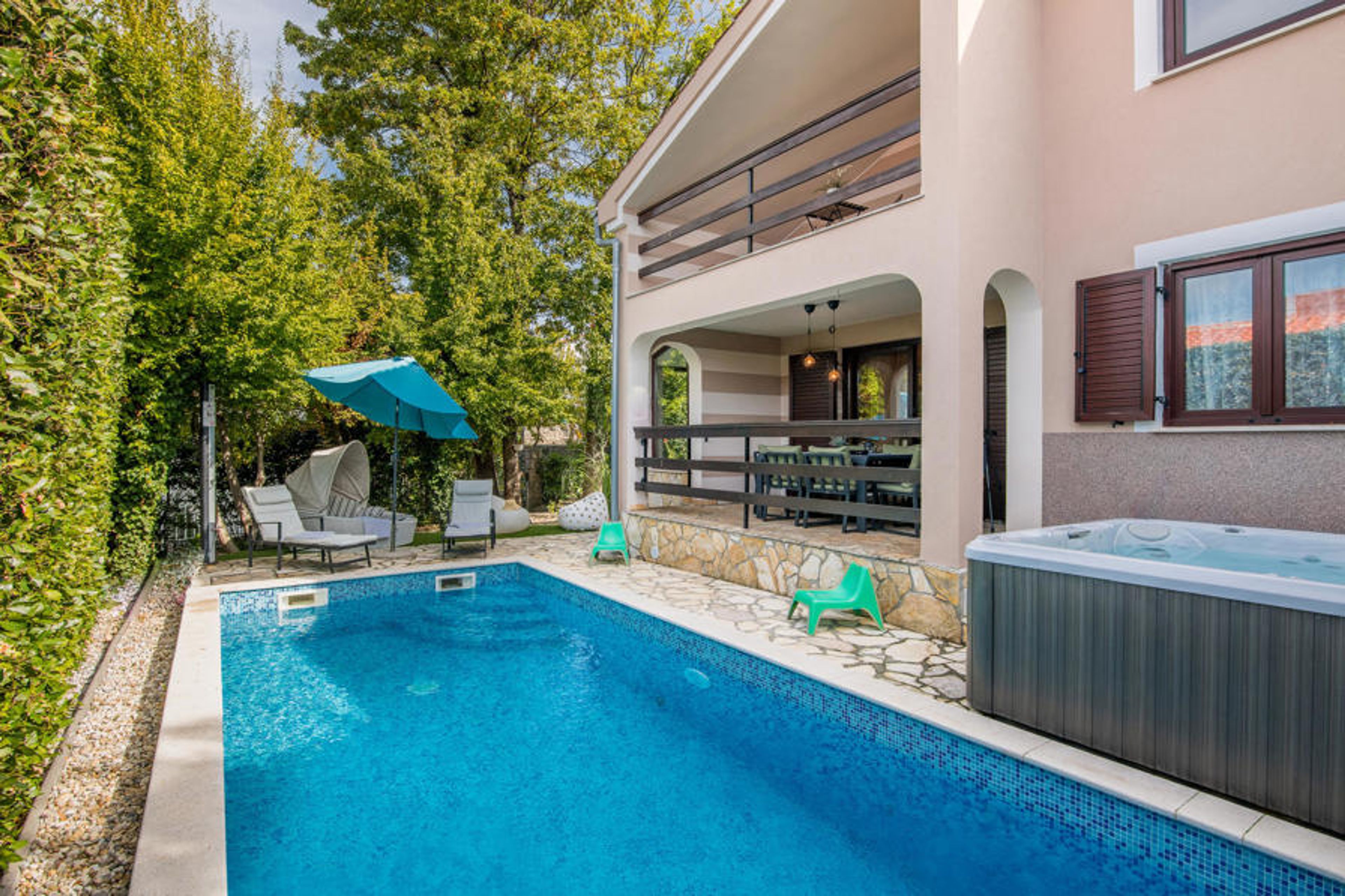 This friendly vacation house is located in the former fishing village of Njivice on the island of Krk, which has matured into a prestigious vacation resort. The house is located in a quieter part of the village, but still not far from the center and beaches. On the ground floor of the main house are the living area, as well as two bedrooms. A steep staircase leads you to the attic, with the lowest ceiling height of 80 cm, where there is another bedroom and a bathroom. In the basement you can spend sociable hours in the lounge. On the fenced property there is a small bungalow with a small kitchen, bathroom and living room. Refresh yourself in the swimming pool and relax while sunbathing while your children play.
