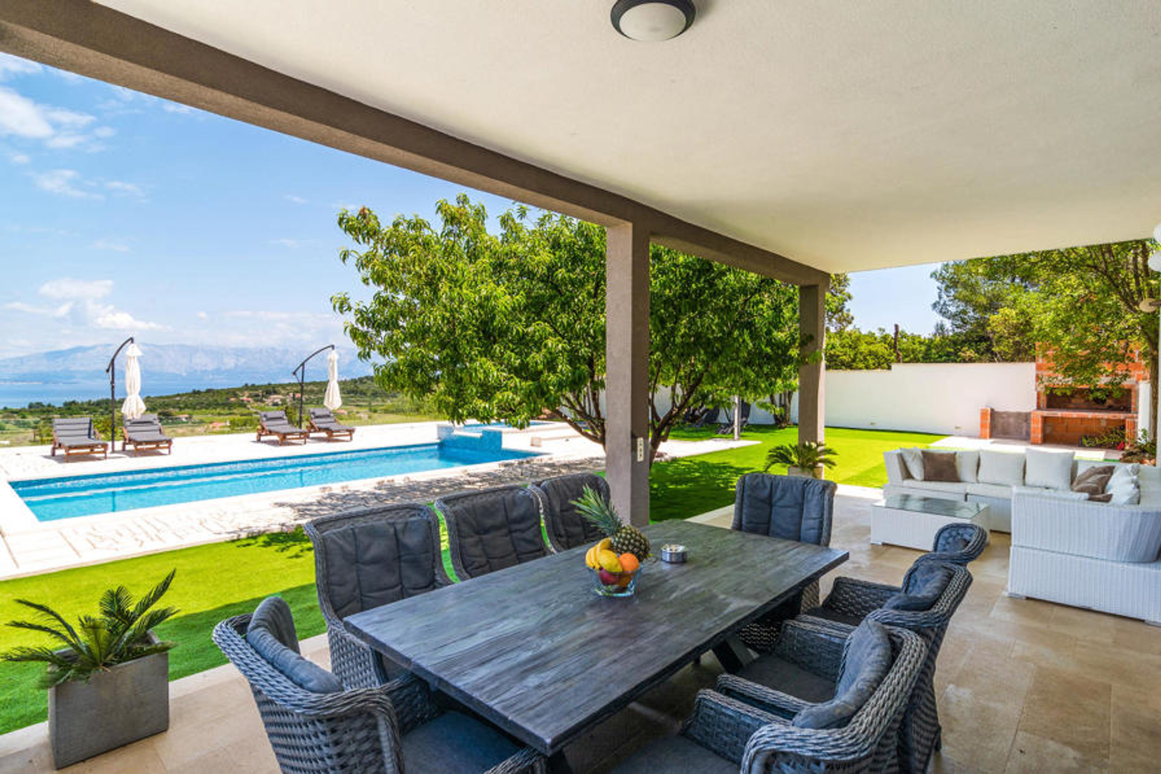 Spend a fabulous vacation in this modern furnished cottage in the inland of the island of Hvar, known as the Croatian island with most sunny days a year. The interior offers comfort through two bedrooms, a bathroom and the living room with kitchen. Outside you can enjoy the beautiful panoramic view from the covered terrace and pool area. The fitness room in the basement includes a shower. Nearby are very beautiful bays, such as the bay Zecja and Vela Stiniva. In addition to the garage there are two covered parking spaces available. Every year on the last weekend in August there is a wine festival in nearby Jelsa. Adventure lovers will find what they are looking for in Adventure Park Jelsa.