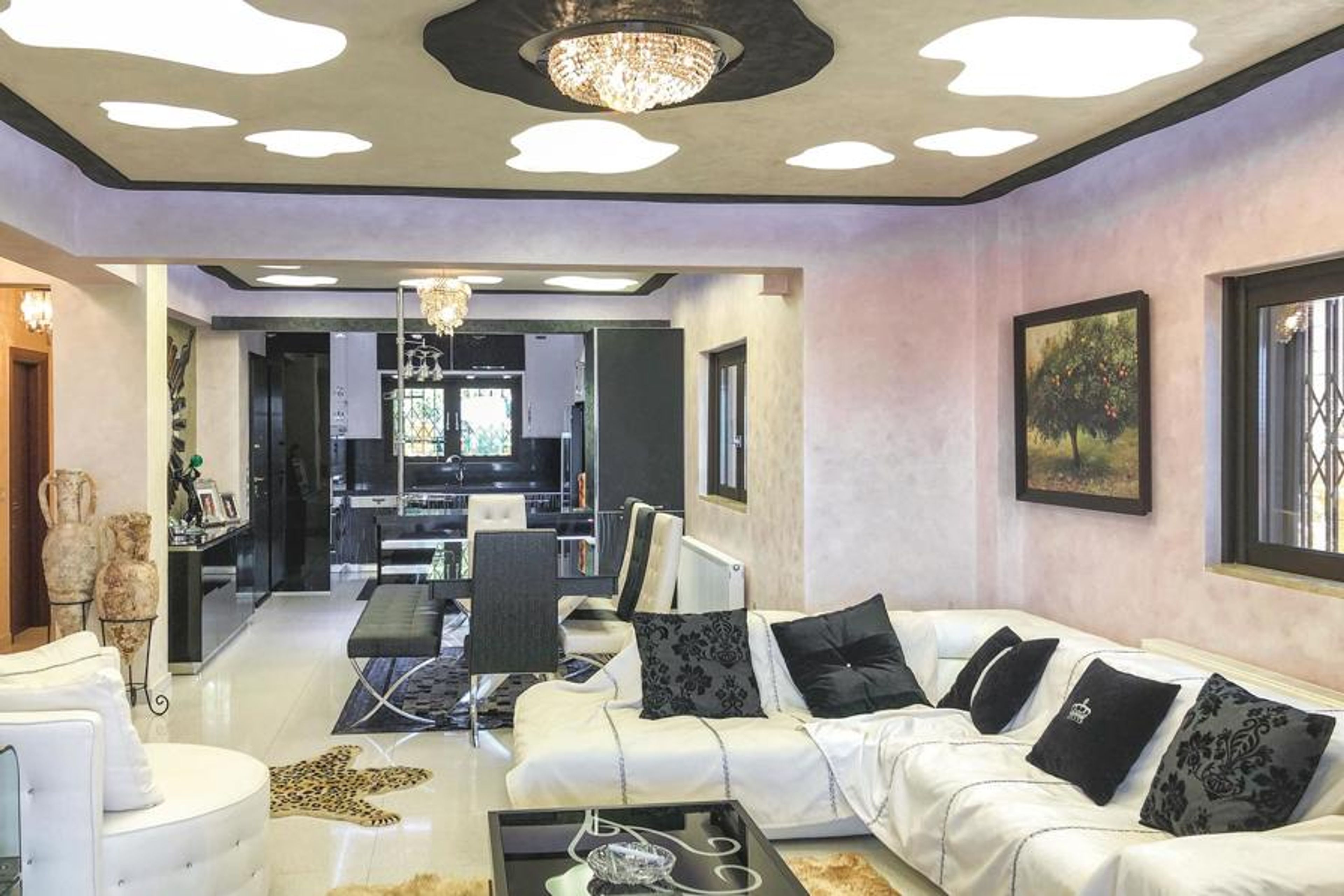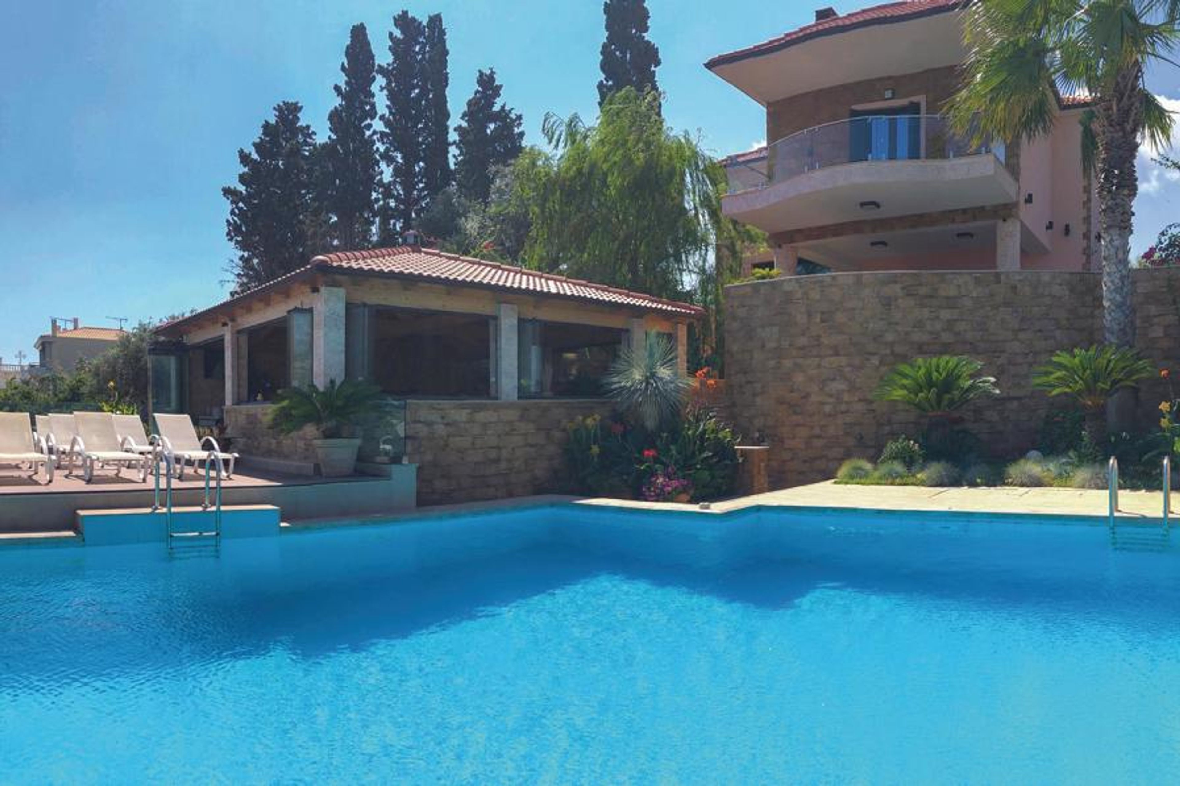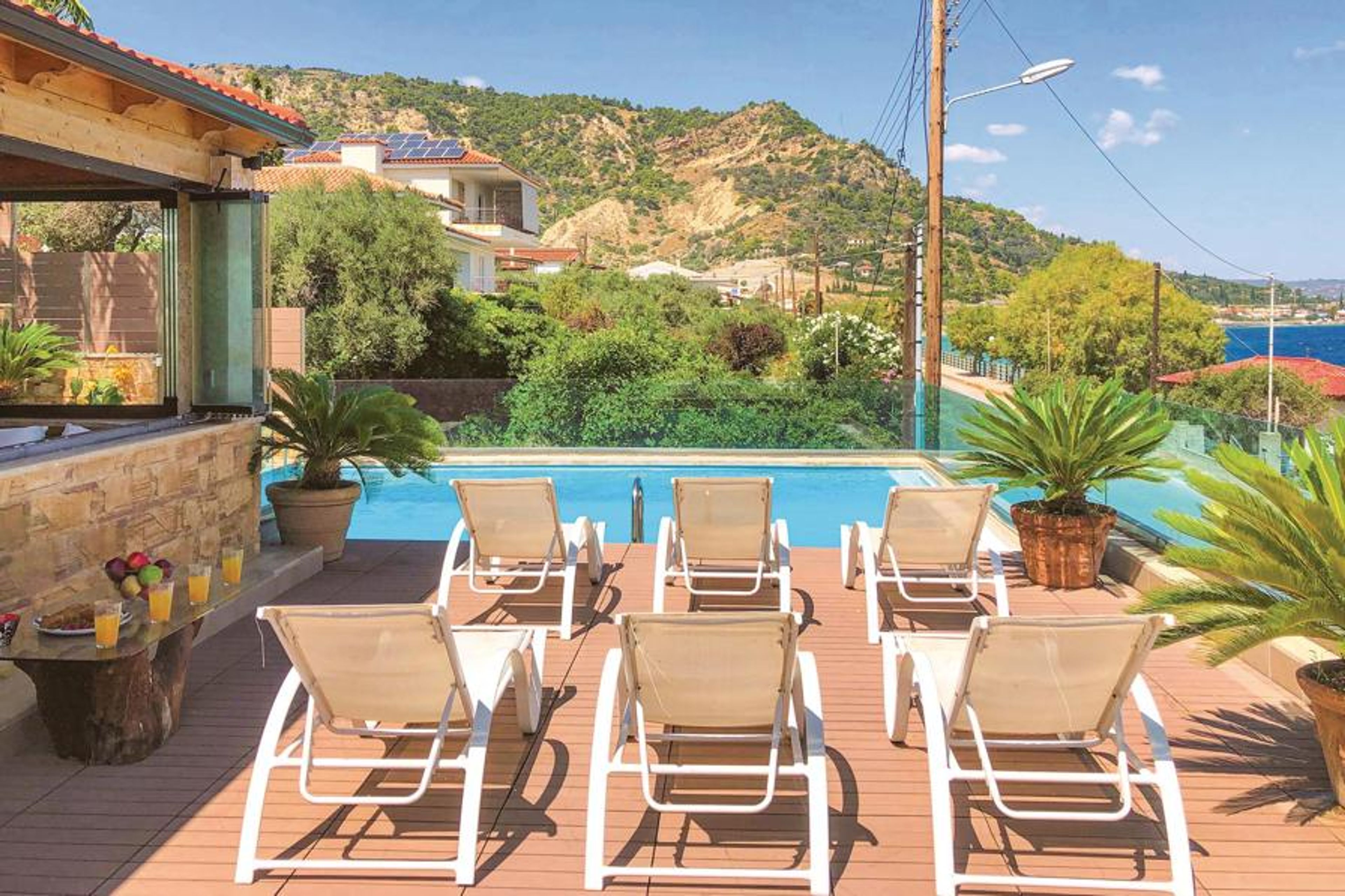 The luxury vacation home is located on the coast in Petalou in the Gulf of Corinth, less than 140 km from Athens. The vacation home is carefully decorated, with a mix of modern and classic style elements, and offers all the amenities for an unforgettable vacation in Greece. The house offers you 4 bedrooms, each with its own bathroom, two fully equipped kitchens and two living rooms. Outside, a beautiful covered atrium with bar awaits you next to the pool with hydro-massage, where you can dine together and enjoy the sea view. The garden charms with flowers, palm trees and olive trees that create an exotic atmosphere. Explore the area and the surrounding beaches and taste fish and local specialties in the numerous taverns.