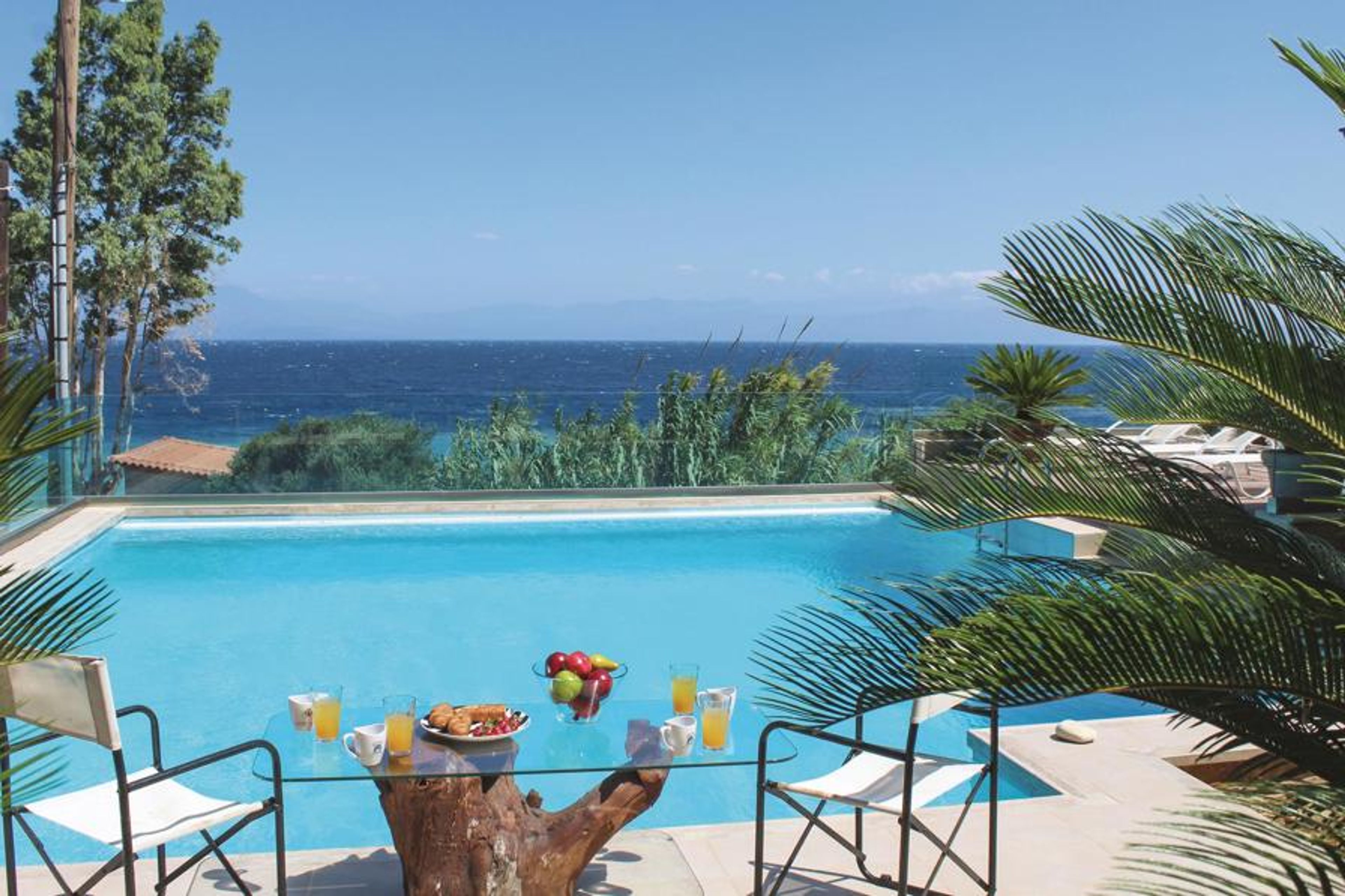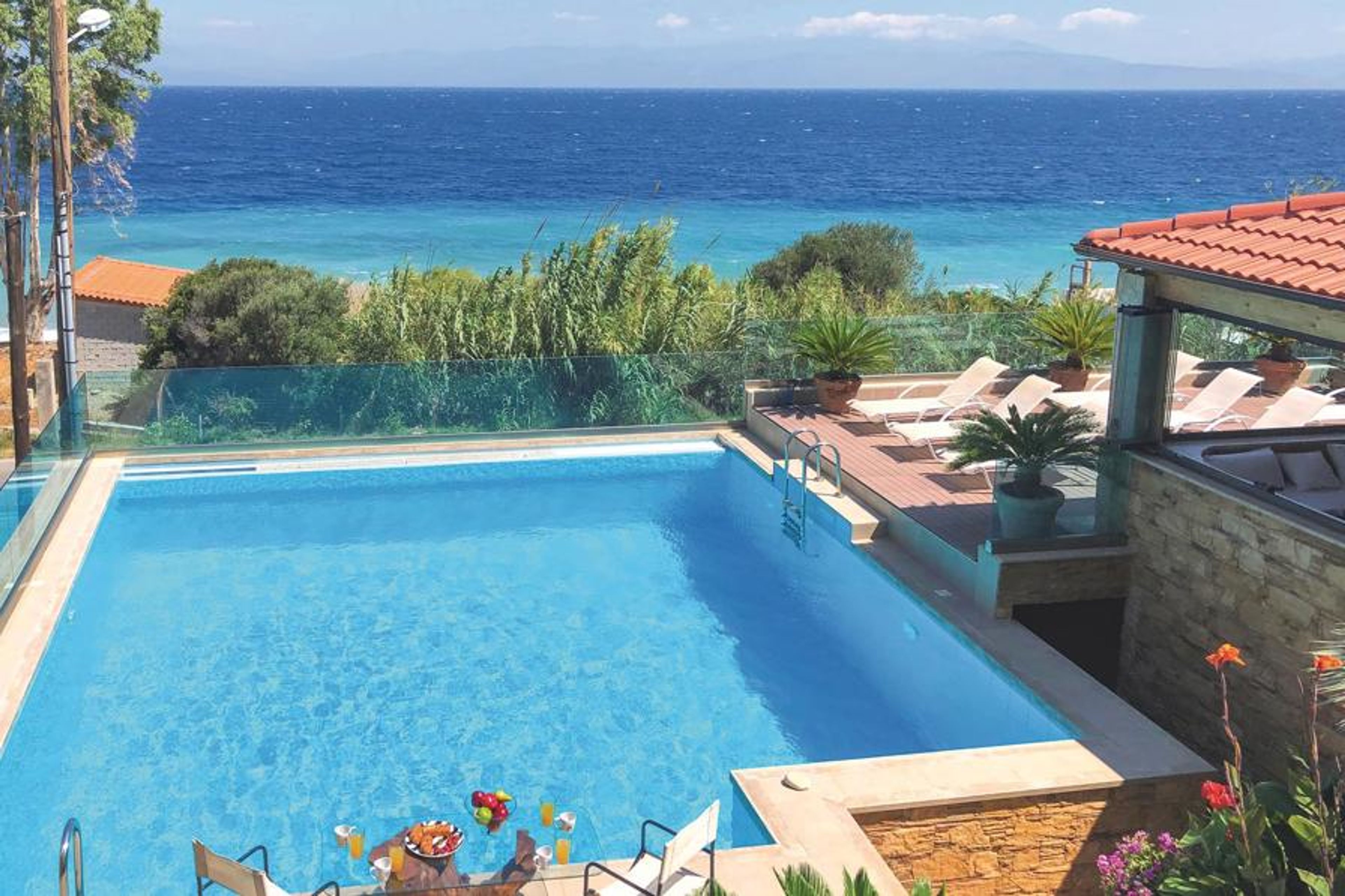 The luxury vacation home is located on the coast in Petalou in the Gulf of Corinth, less than 140 km from Athens.
