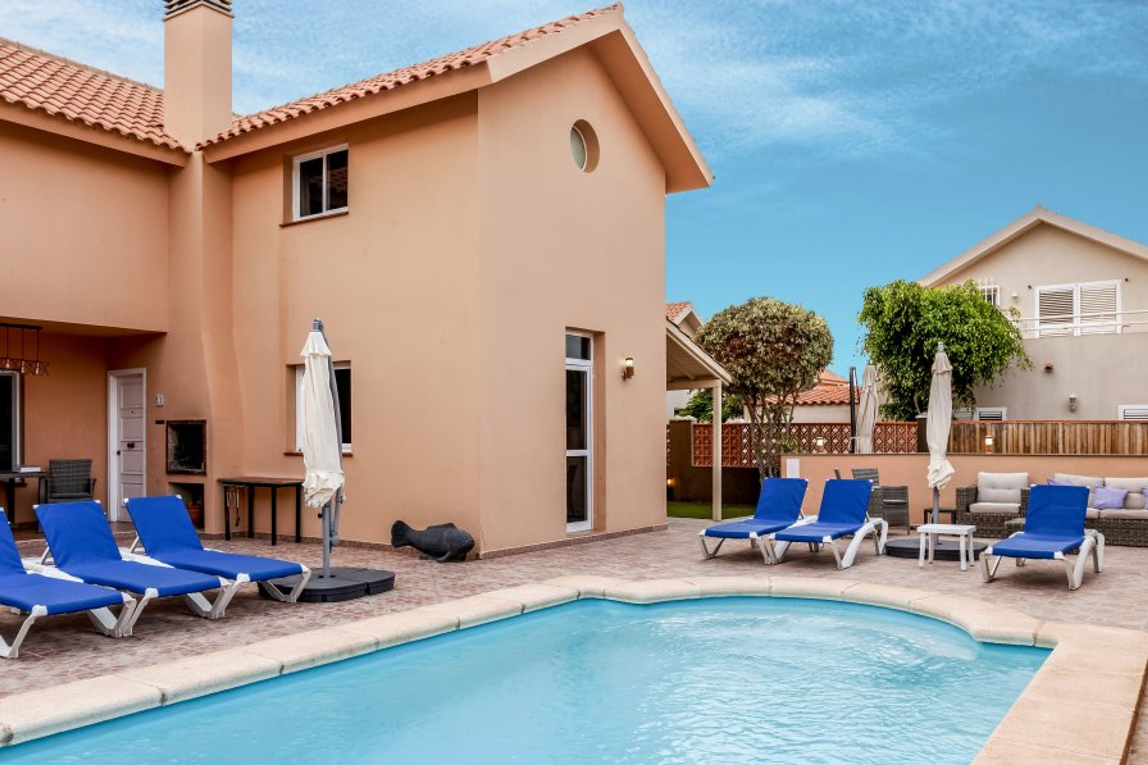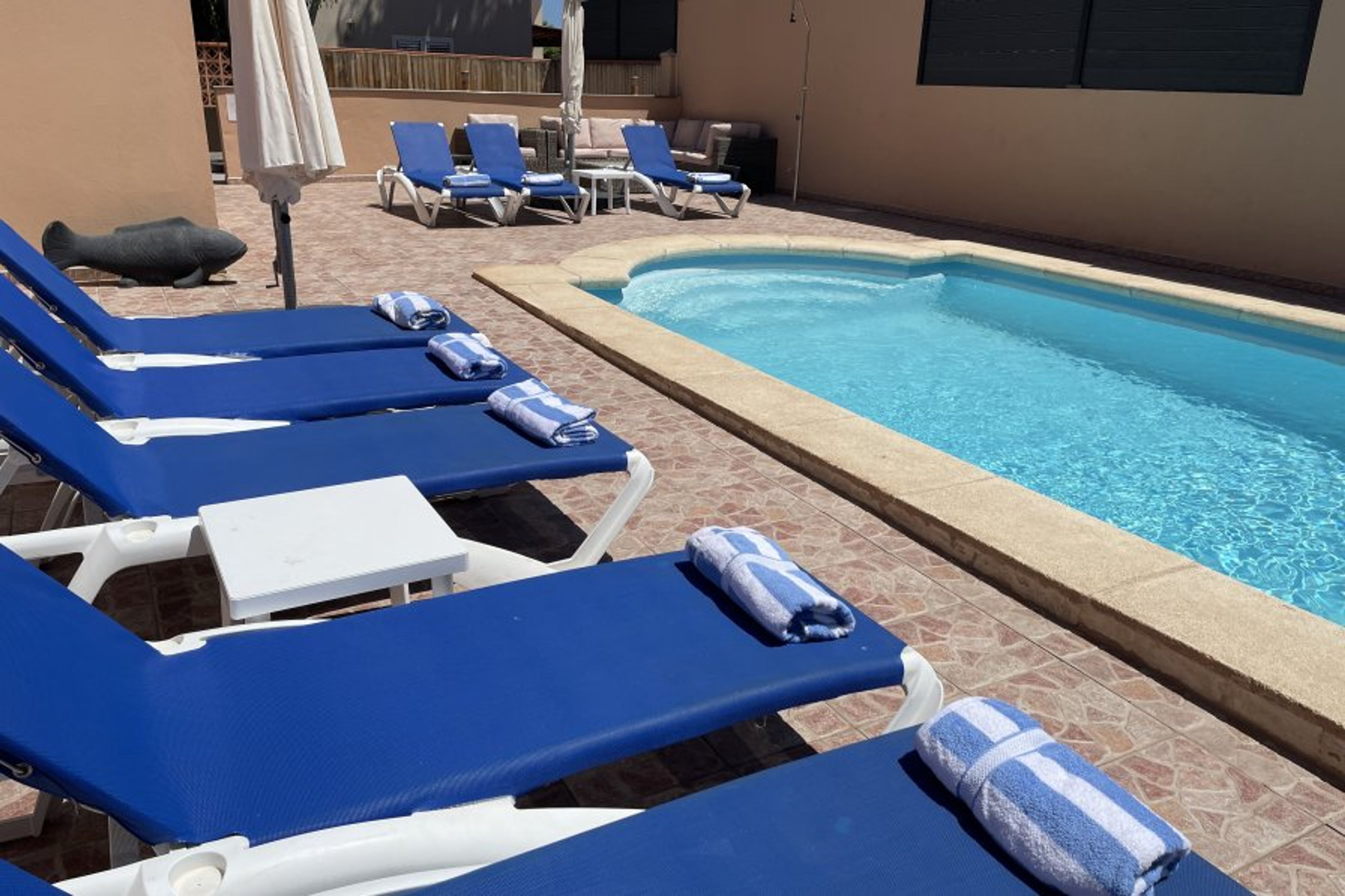 5 Bedrooms, air-conditioned, private heated pool, 2 lounges, 3 bathrooms in Corralejo, walkable to beach, town, harbour, supermarket and restaurants.