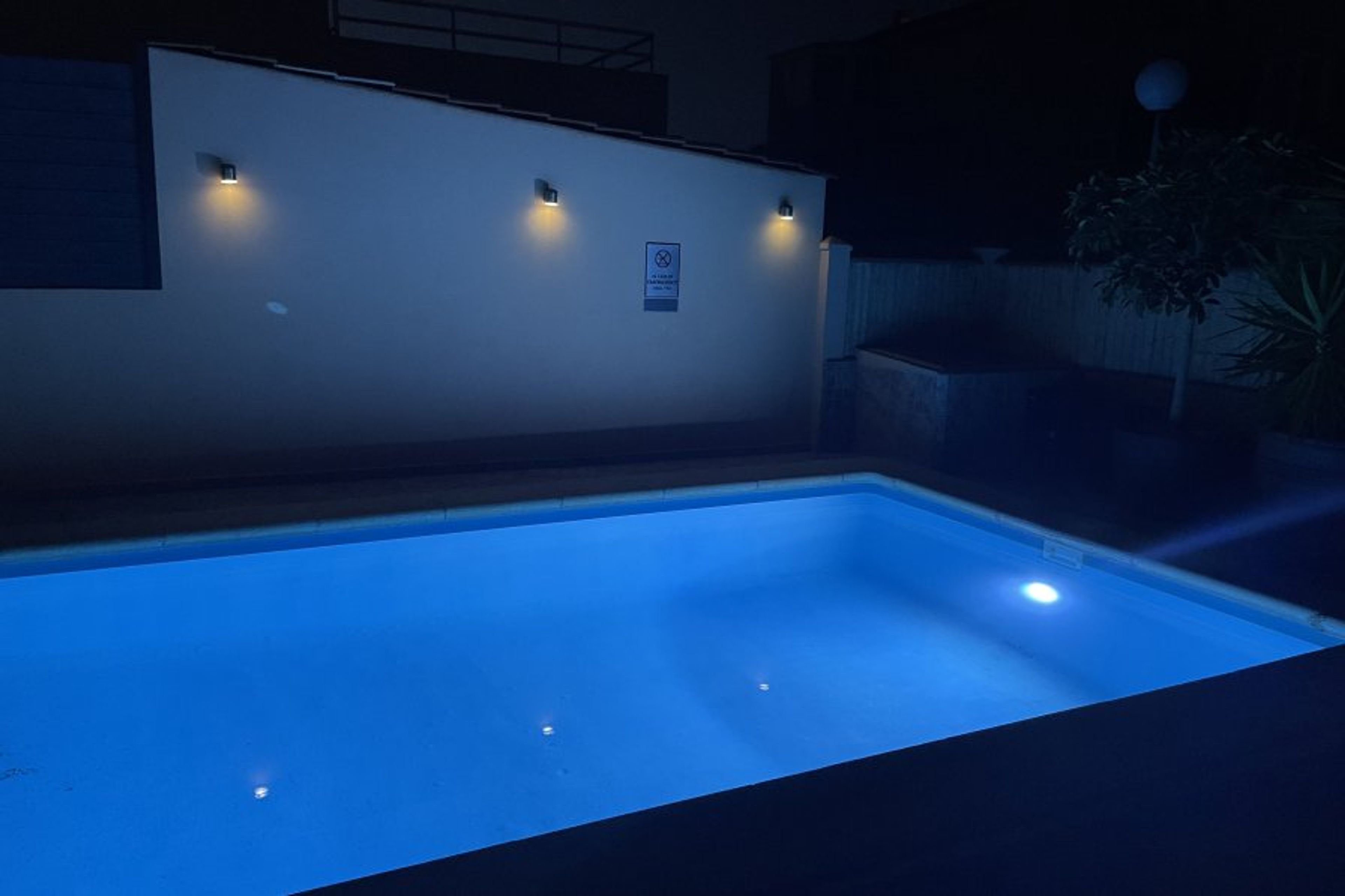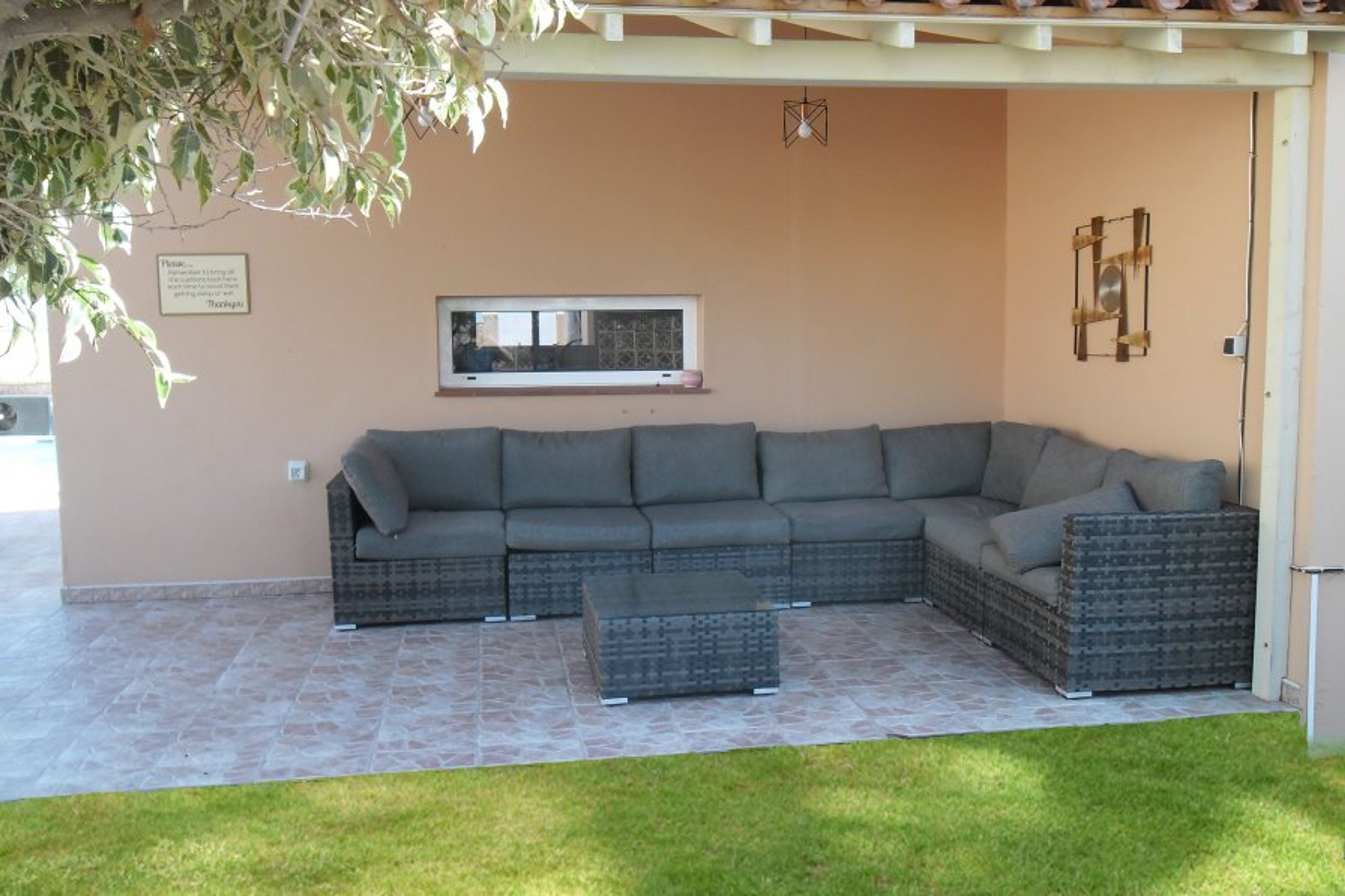 The outside of the villa consist of a lit, filtered, heated pool with depths from 1.1m to 1.4 metres. The pool is approximately 13ft by 28 ft in size. There are 8 adjustable sun loungers all provided with beach towels. There are also parasols both poolside and for the dining table and outdoor lounge. The pool area also provides a full size purpose built charcoal barbeque. There is a large 10 seater table and 10 chairs, together with outdoor sofas and chairs.. There is also a large wood and tile pergola which is a separate fully lit outdoor lounge with wicker sofas, chairs and coffee table.