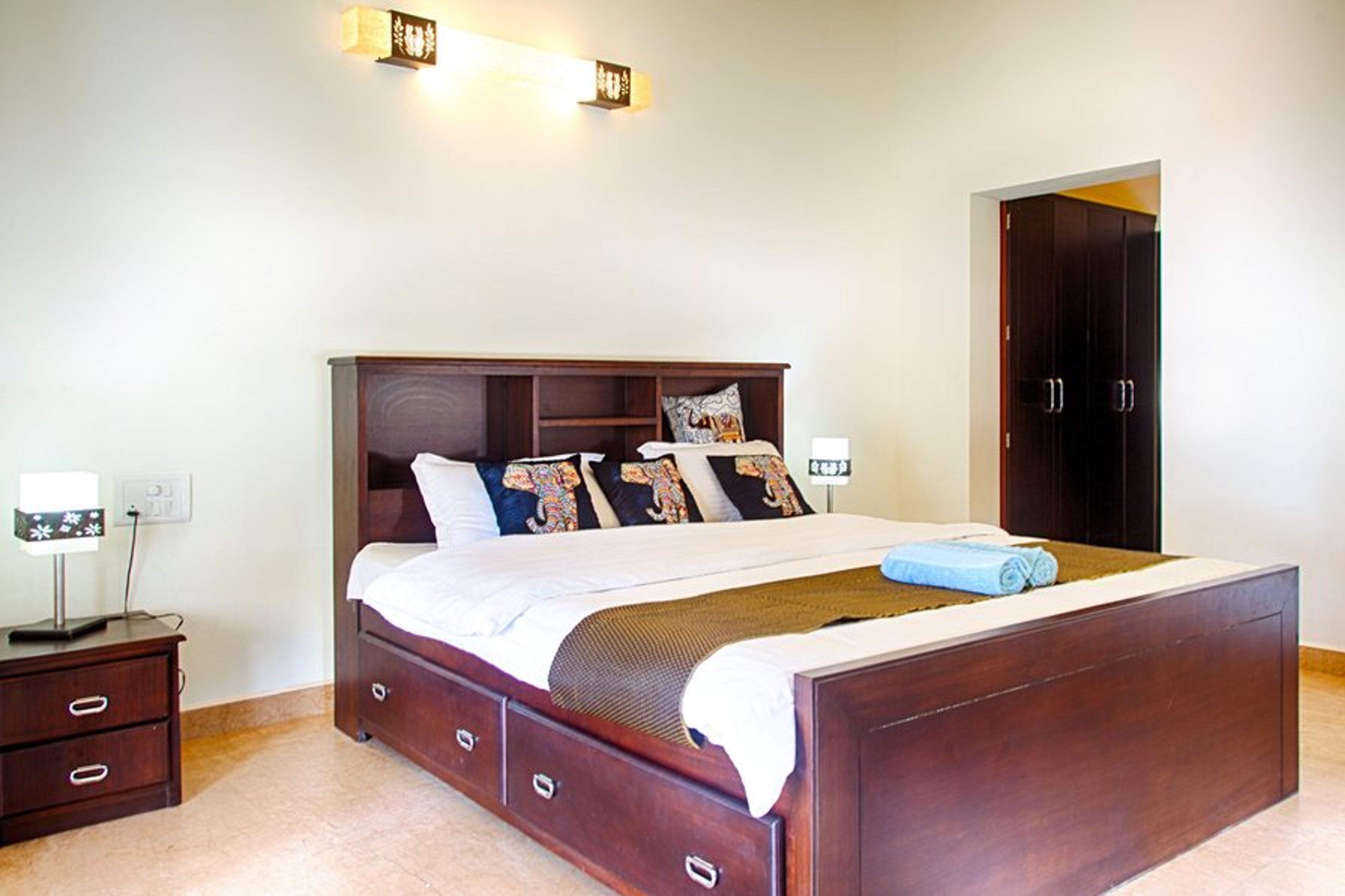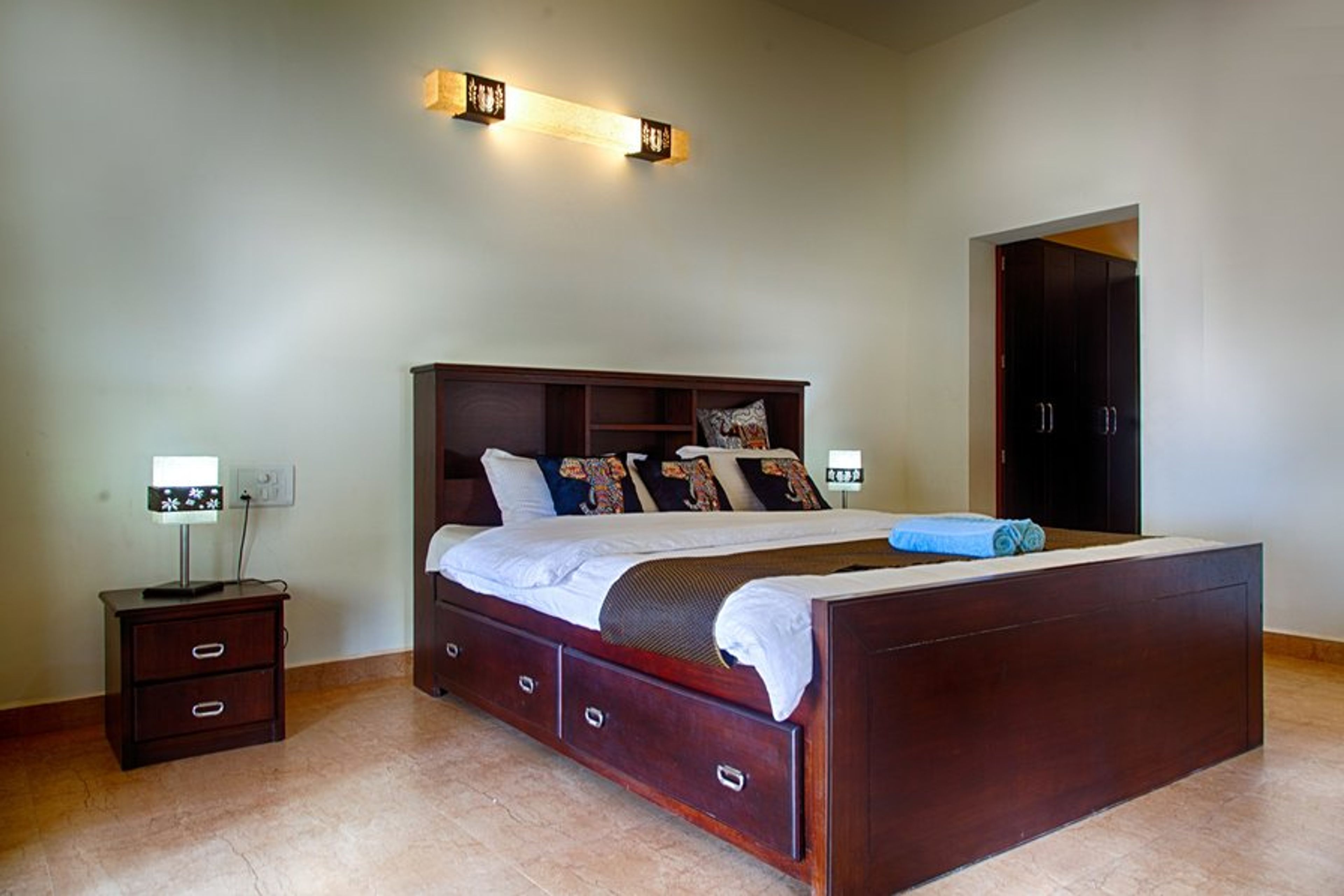 The large modern and fully functional kitchen of this villa for rent in Goa is everything you might need during your stay. Large refrigerator, water purifier, microwave, toaster, kettle, gas stove and cookware are provided for your convenience.
