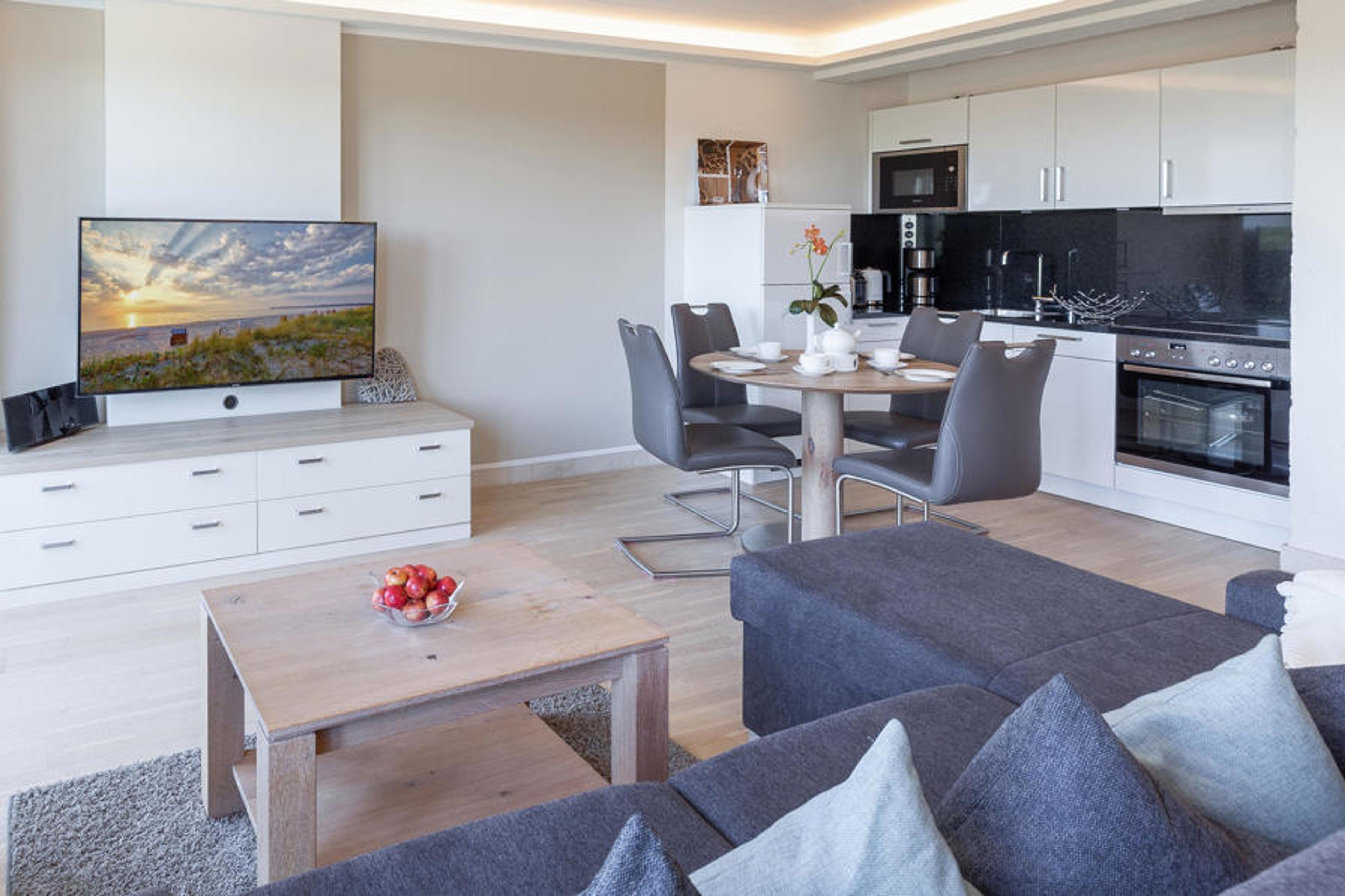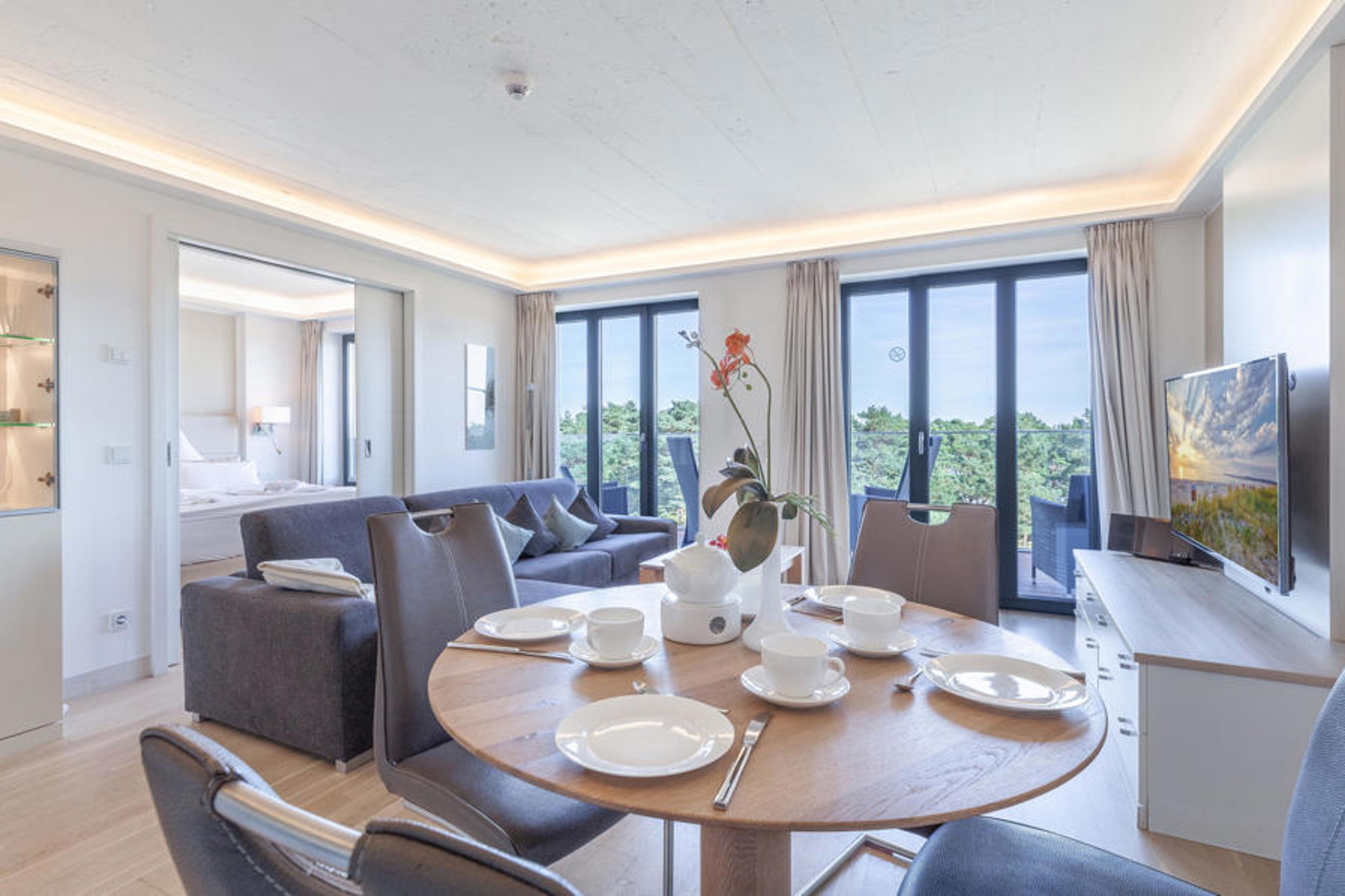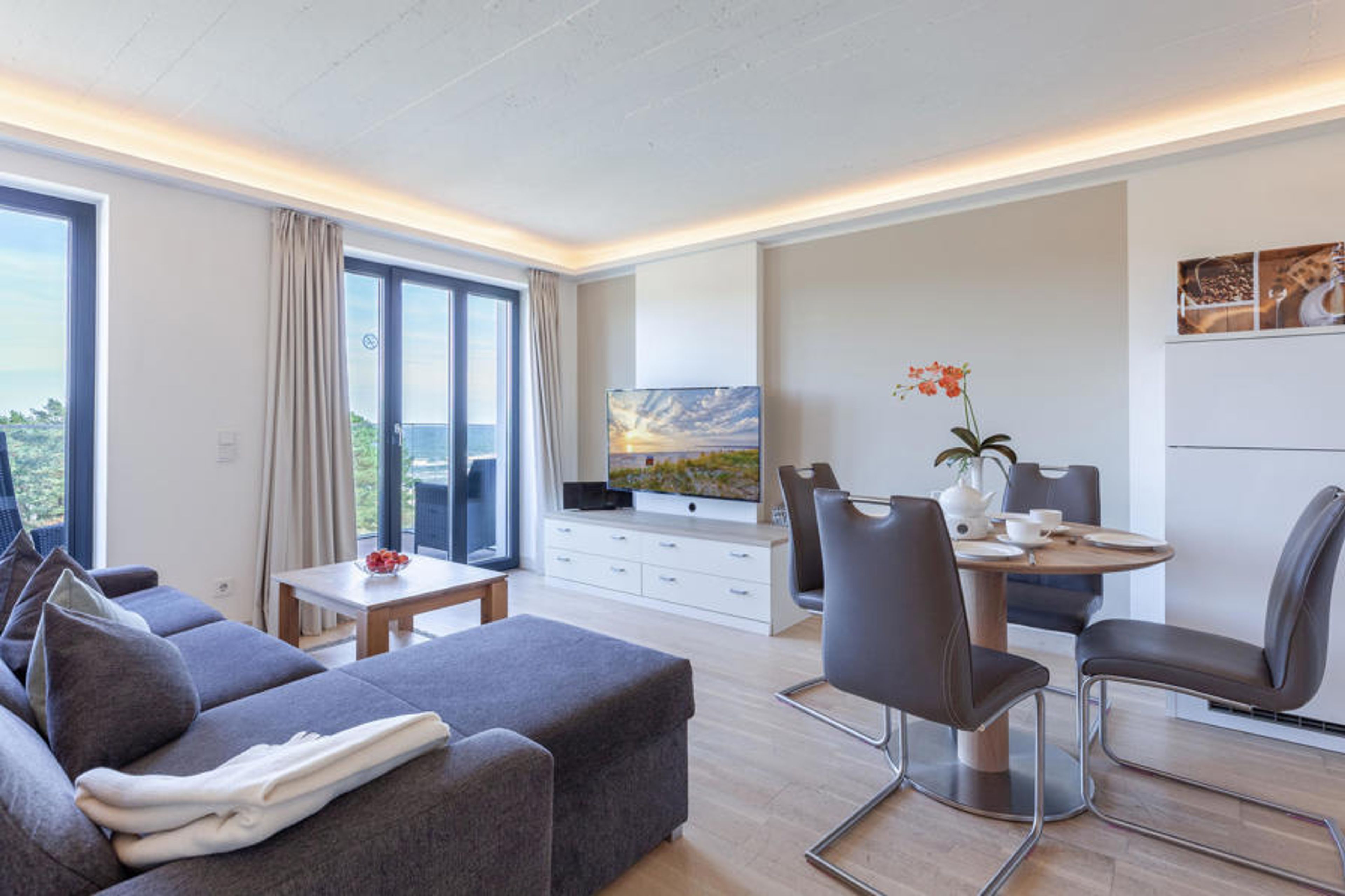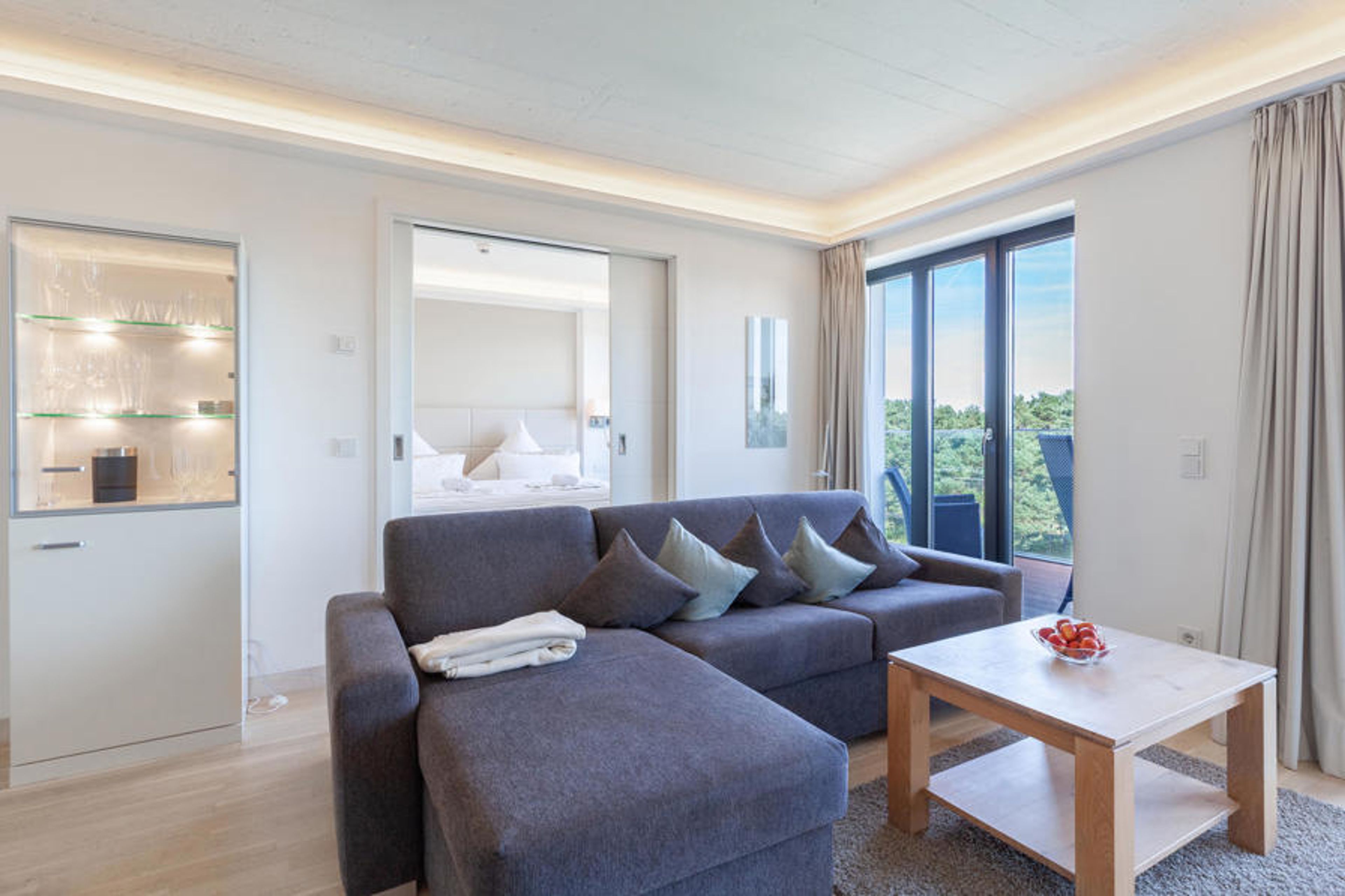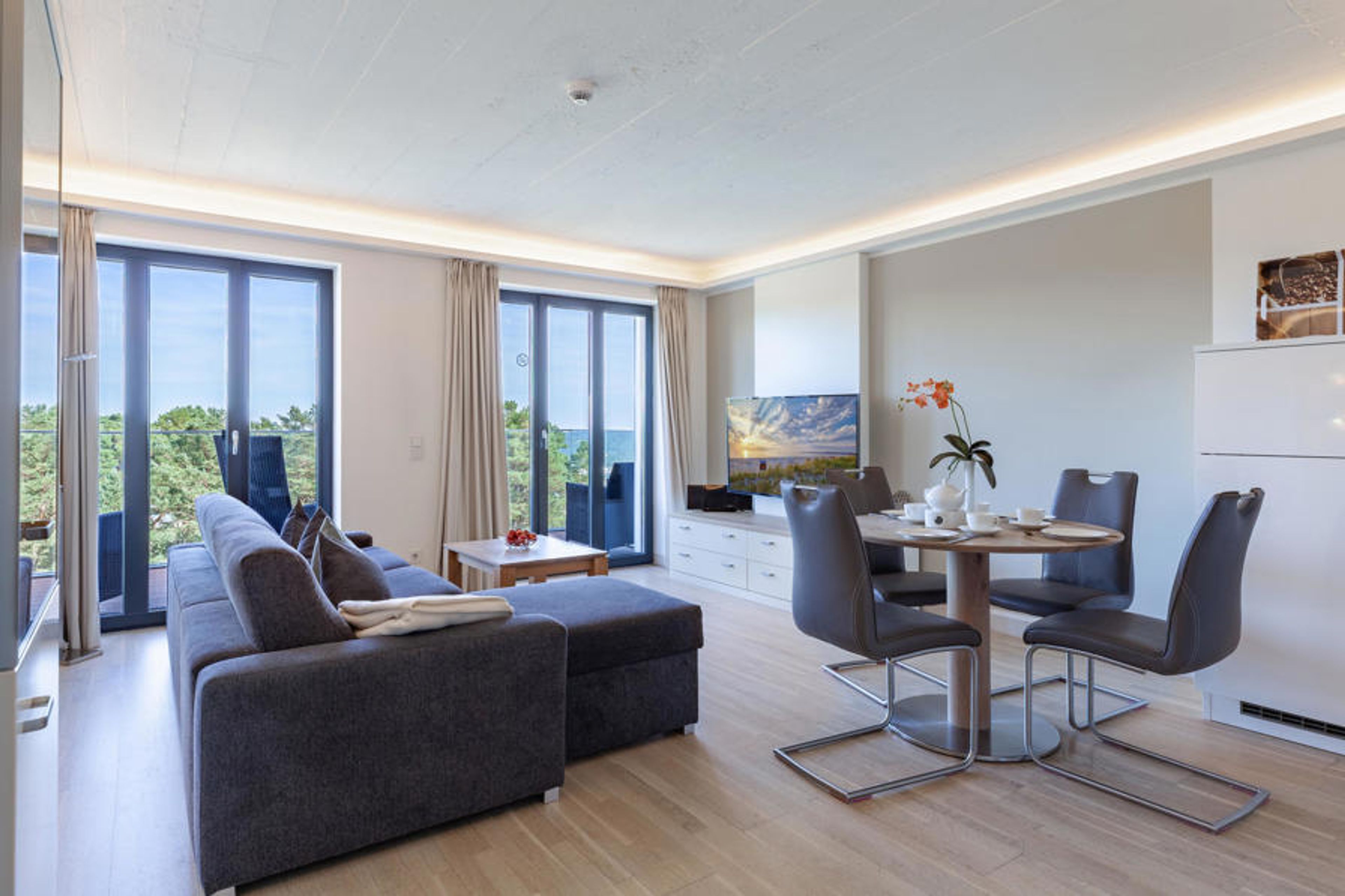 You will find all amenities here on over 40m2. The spacious, open-plan living area is flooded with light thanks to the large window fronts, the view opens up and can sweep over the small pine forest to the turquoise waters of the Baltic Sea. Two large doors provide access to the almost 10m2 balcony with high-quality garden furniture. Pure relaxation! The separate sleeping area is equipped with its own TV and is separated from the living area by a modern sliding door. The sofa in the living area can be converted into two beds in a few simple steps if required (sleeping area 1.20 x 2.00 m). The bathroom is also suitable for guests with limited mobility thanks to a 90 cm wide door and a threshold-free shower.