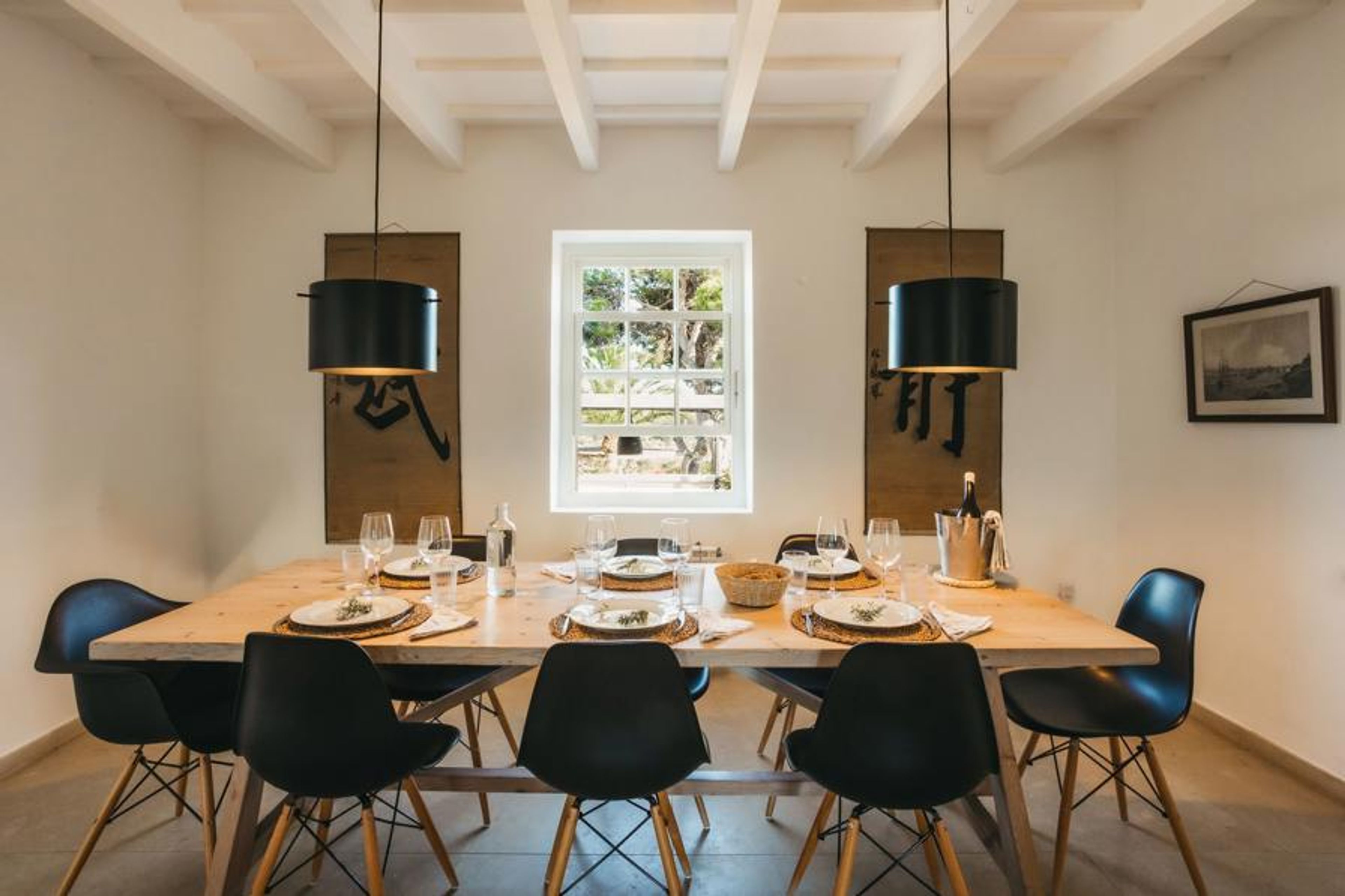 The decoration of the library, the television room, and the living room downstairs boasts an uncomplicated feeling of elegance. The kitchen is not far from the terrace, but even more convenient is the inside lounge table, with seating for 14 people, including 4 bar stools. The lounge table has excellent views of the terrace and the Binigaus Valley as well.